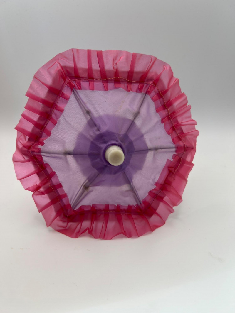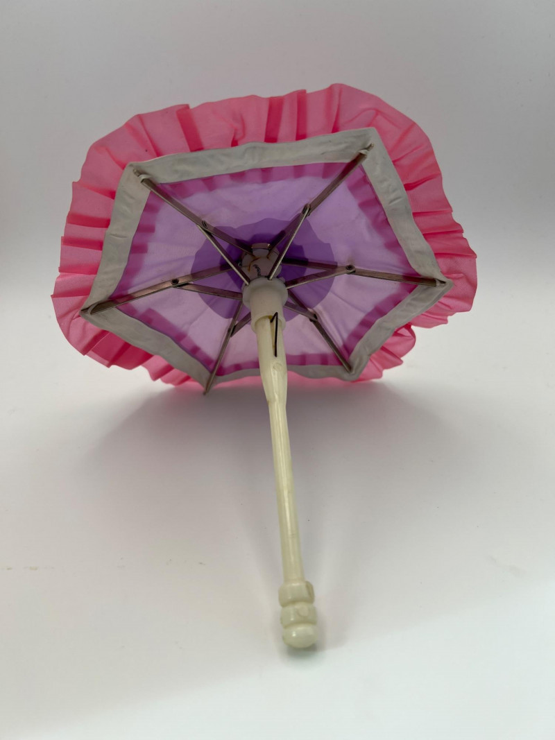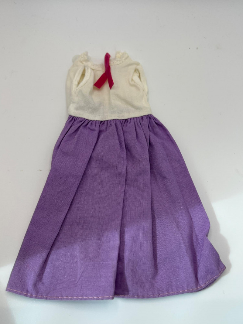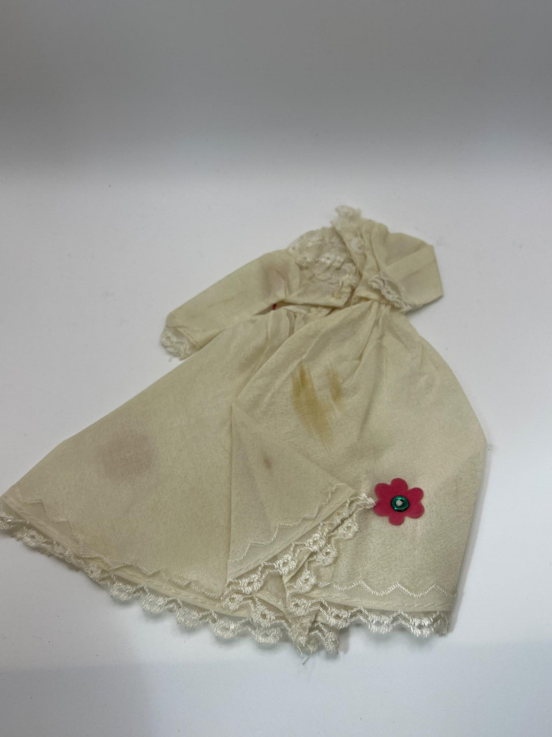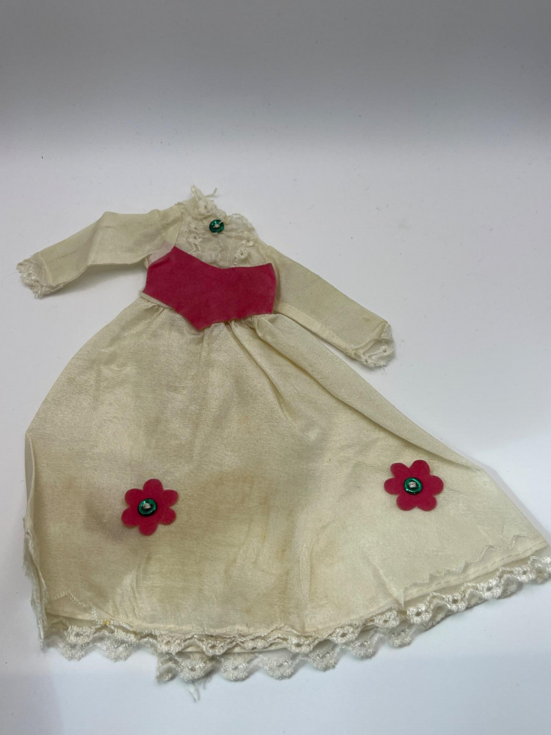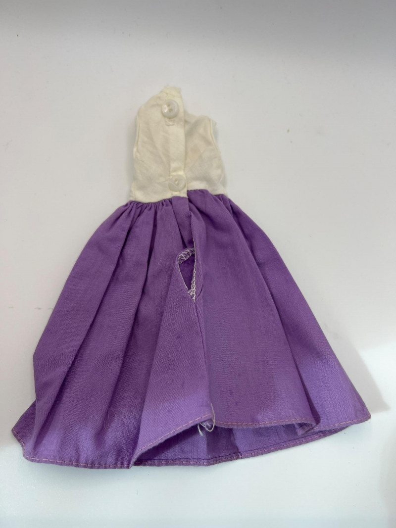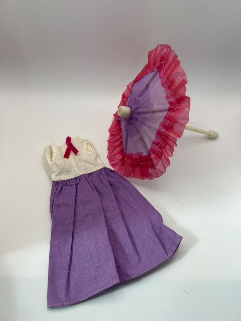 A vintage 12-inch Mary Poppins doll by Horsman (1964-1967), dressed in her original blue coat, matching hat, striped dress, and lace-trimmed bloomers. Her painted features, dark hair, and bright blue eyes reflect the classic mid‑century Horsman style—sweet, expressive, and unmistakably storybook. Additional garments accompany her, including pastel dresses and skirts that expand her display wardrobe. A charming piece for collectors of Horsman, character dolls, or film-inspired vintage figures. Condition consistent with age and gentle handling. MISSING: stockings, shoes, purse