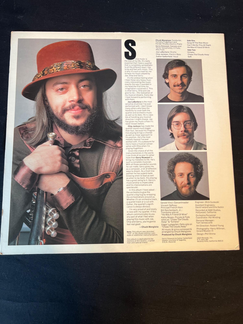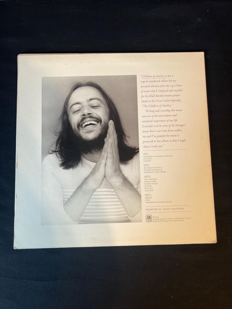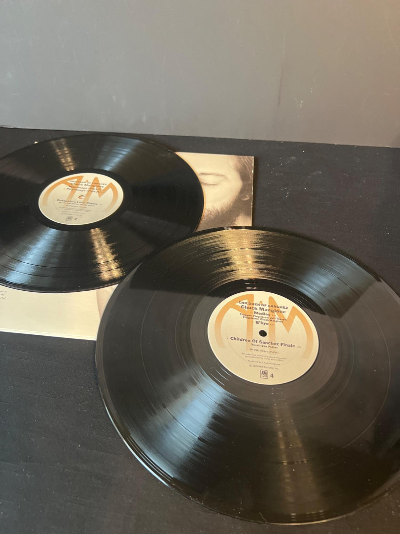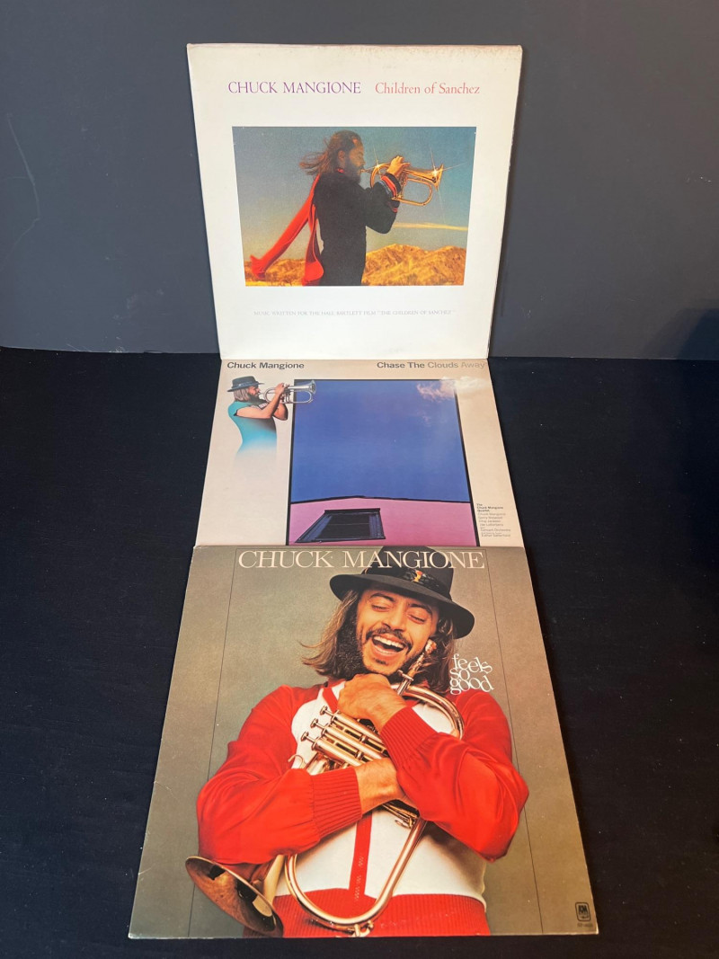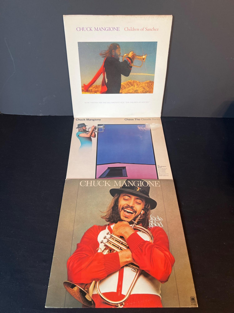 Trio of Chuck Mangione LPs from his celebrated 1970s era, including Feels So Good, Children of Sanchez (2xLP soundtrack), and Chase the Clouds Away. All albums present well with clean covers and bright color. Vinyl condition untested; light handling wear consistent with age. A warm, melodic set for jazz and fusion collectors. Covers clean with light edge wear Vinyl visual grade is near mint. Children of Sanchez includes both records