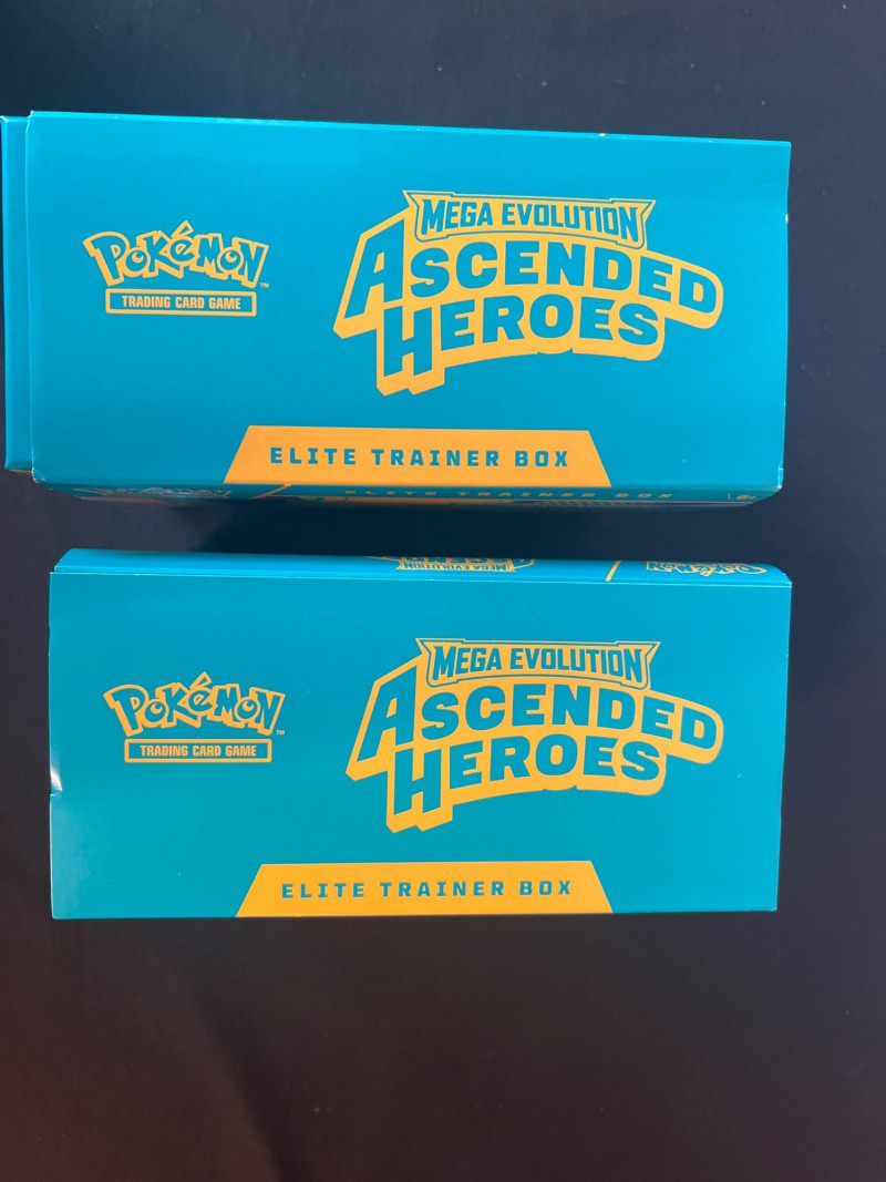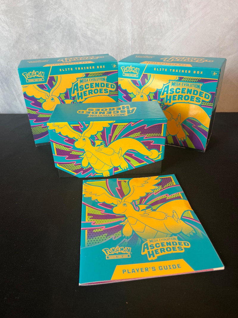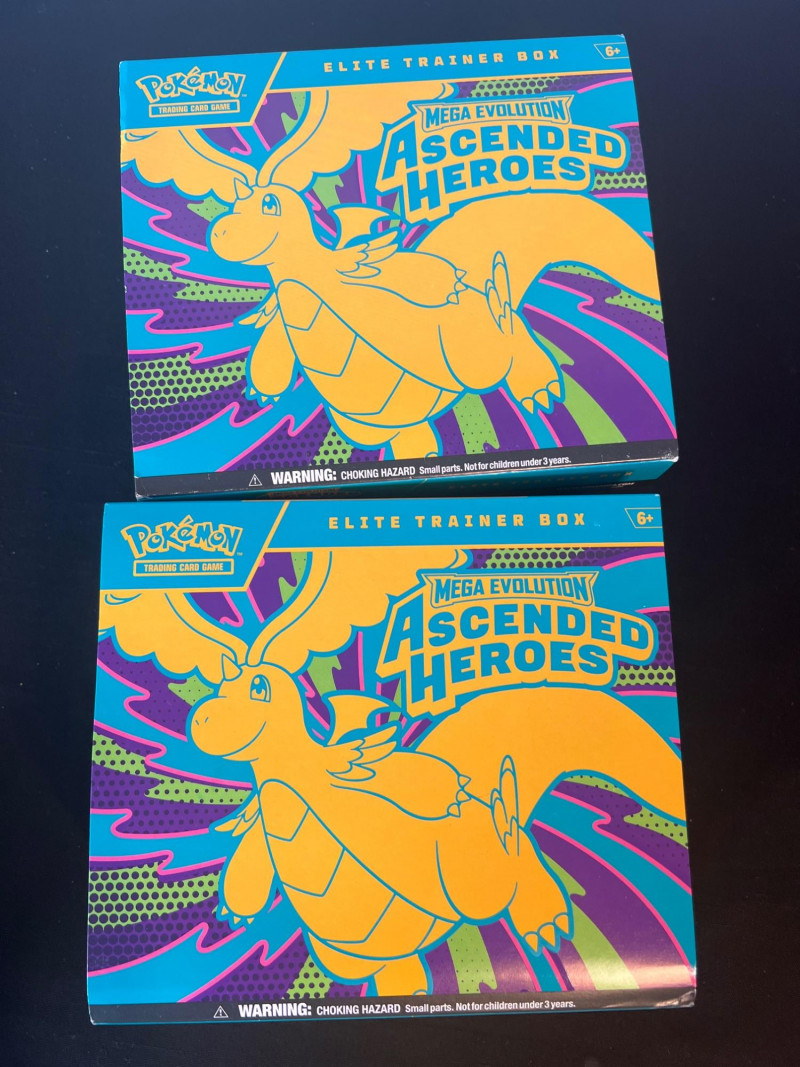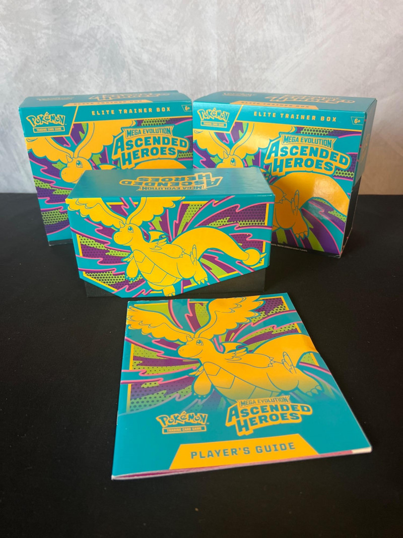 Three Pokémon TCG: Mega Evolution – Ascended Heroes Elite Trainer Boxes, featuring Dragonite artwork and vibrant multi‑color design. Includes: 2 Elite Trainer Boxes – with original sleeves 1 Elite Trainer Box – Opened