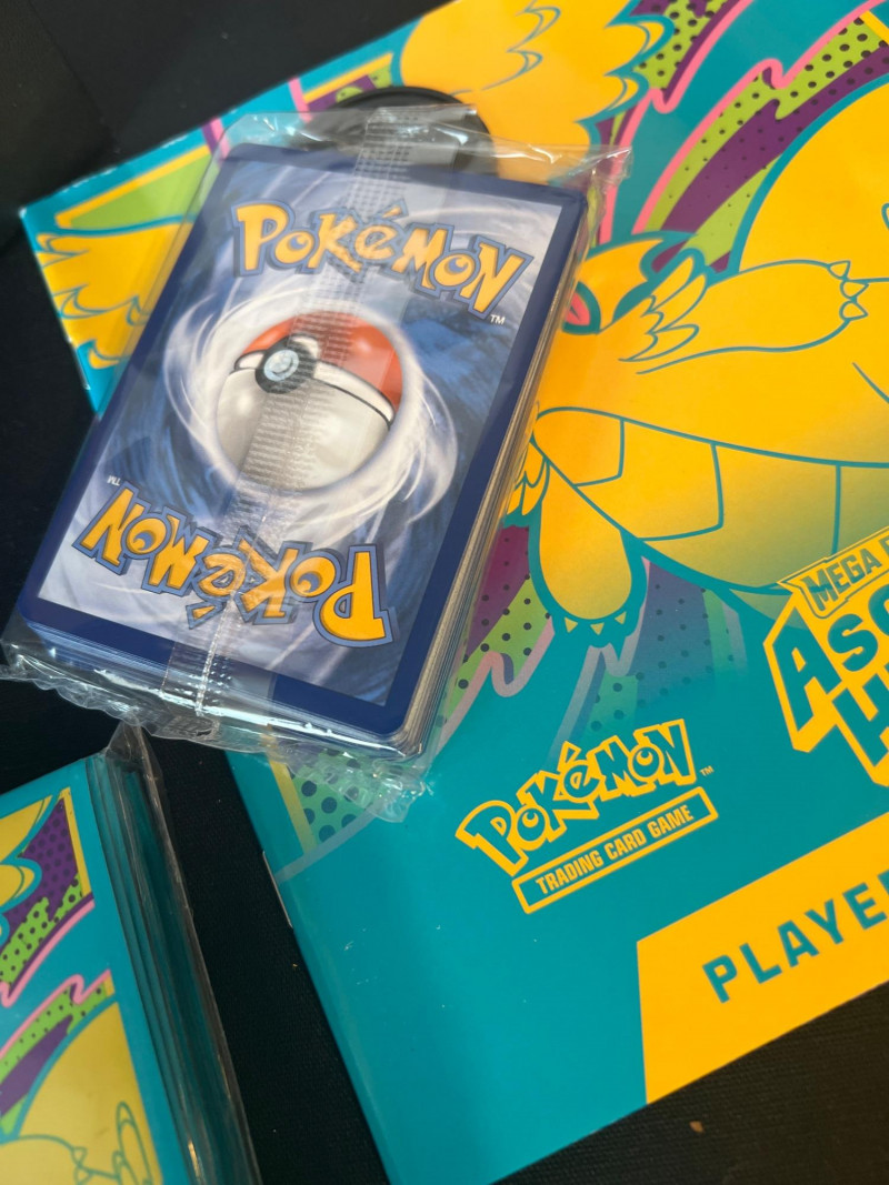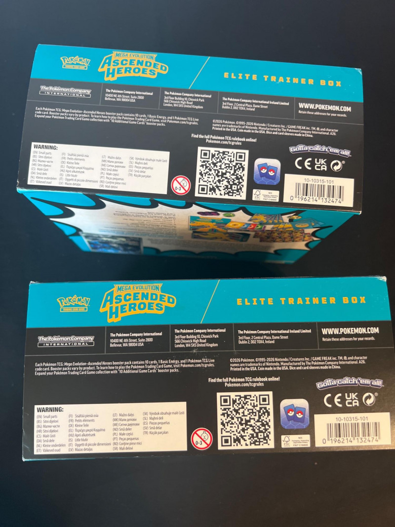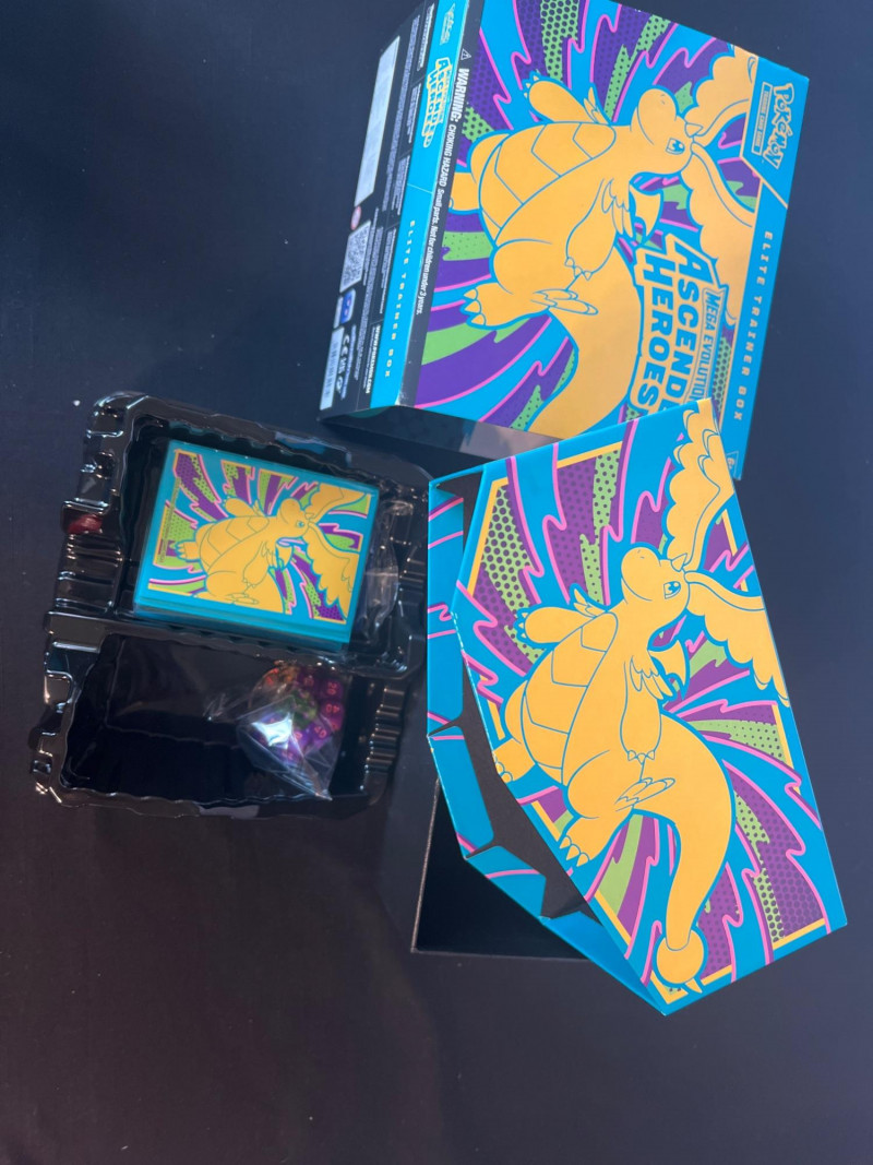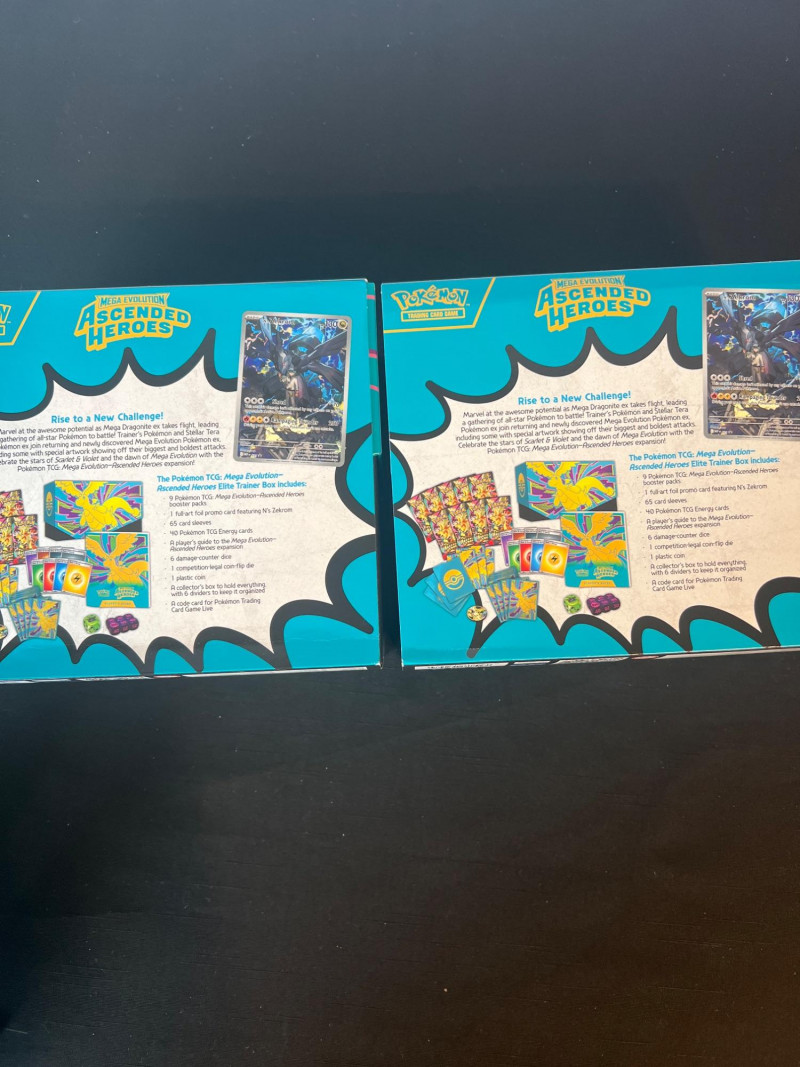 Three Pokémon TCG: Mega Evolution – Ascended Heroes Elite Trainer Boxes, featuring Dragonite artwork and vibrant multi‑color design. Includes: 2 Elite Trainer Boxes – with original sleeves 1 Elite Trainer Box – Opened