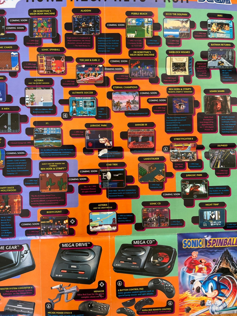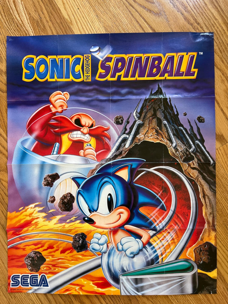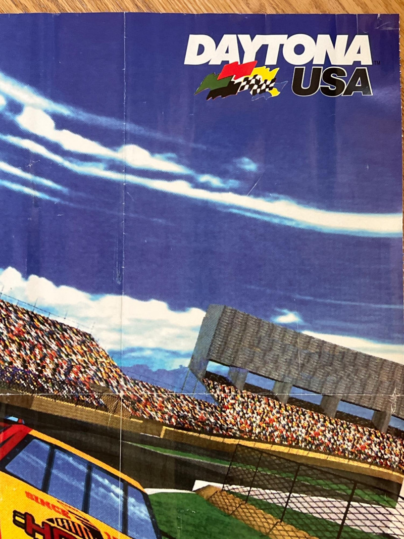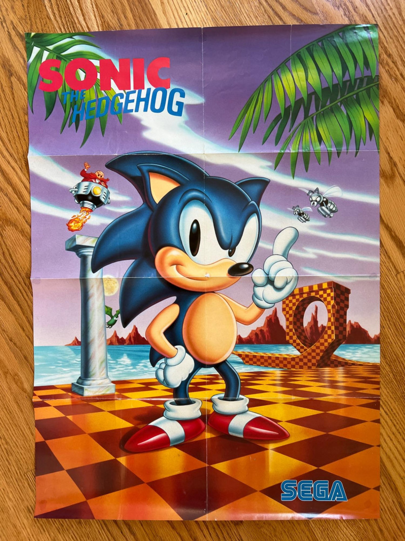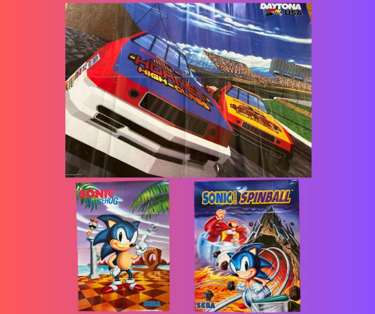 A vibrant trio of original SEGA video game posters featuring three iconic titles: Sonic the Hedgehog, Sonic Spinball, and Daytona USA. Each poster showcases classic early‑’90s SEGA artwork—bold color, arcade energy, and the unmistakable style that defined the era. Sonic appears in two dynamic designs, from the tropical platform landscapes of the original game to the high‑action pinball chaos of Spinball. The Daytona USA poster captures the polygonal racing aesthetic and the legendary Hornet car in full motion. Ideal for retro gaming collectors, arcade enthusiasts, or anyone building a nostalgic display. Note posters have fold creases and show wear at corners. Colors are vibrant. Sonic the Hedgehog - 20.5" height x 17" width