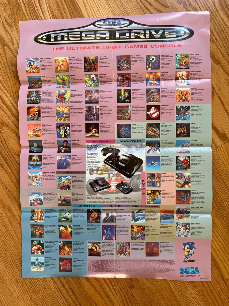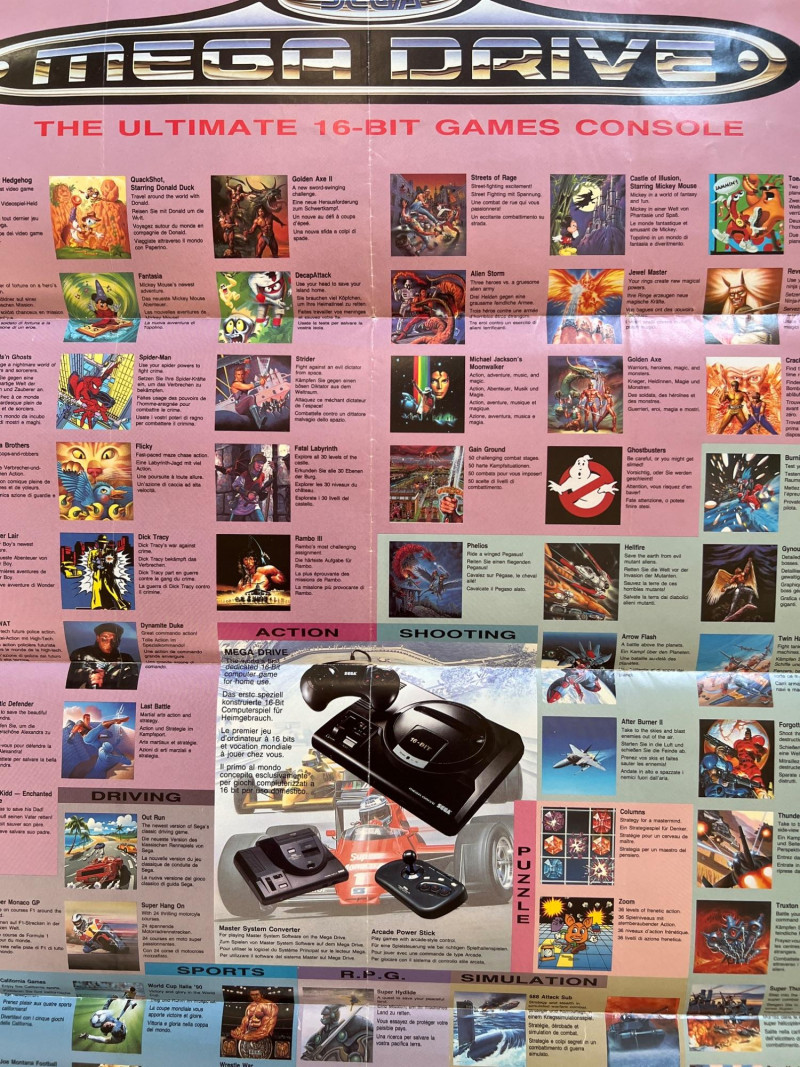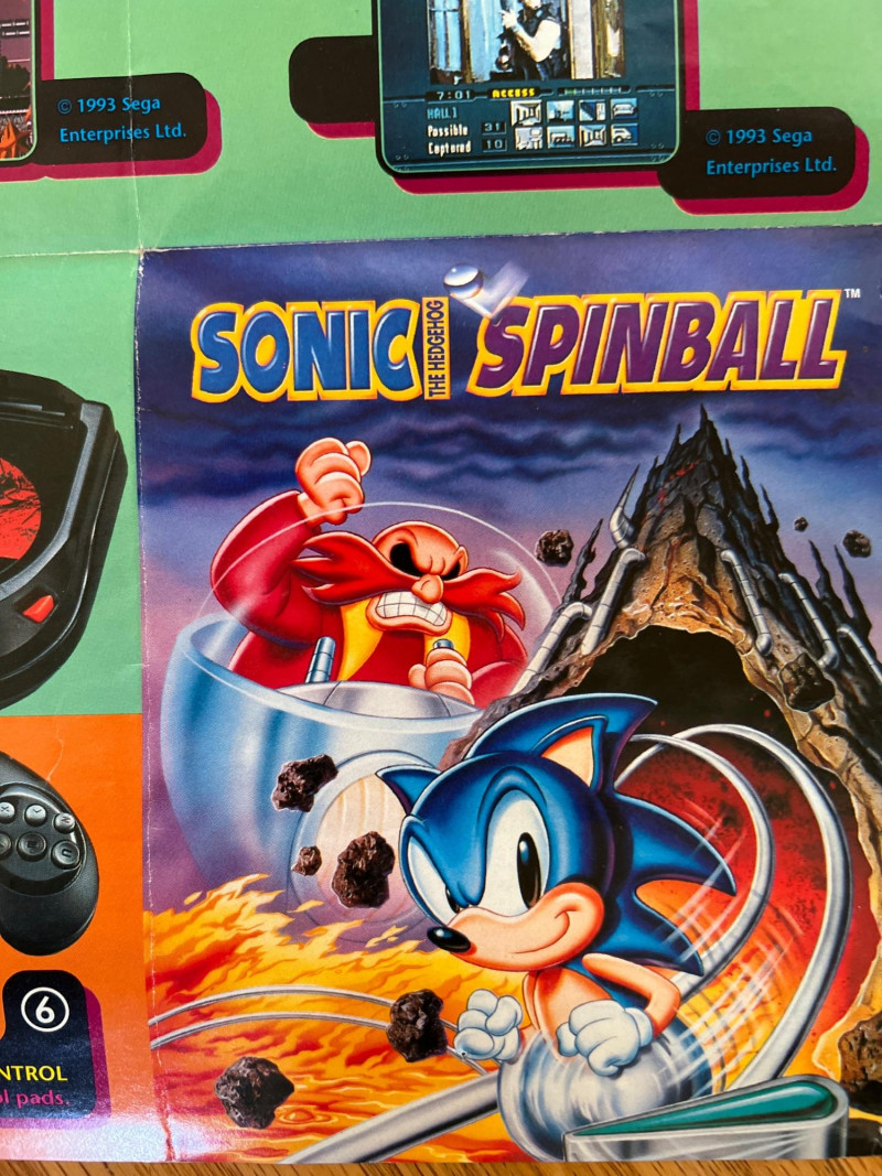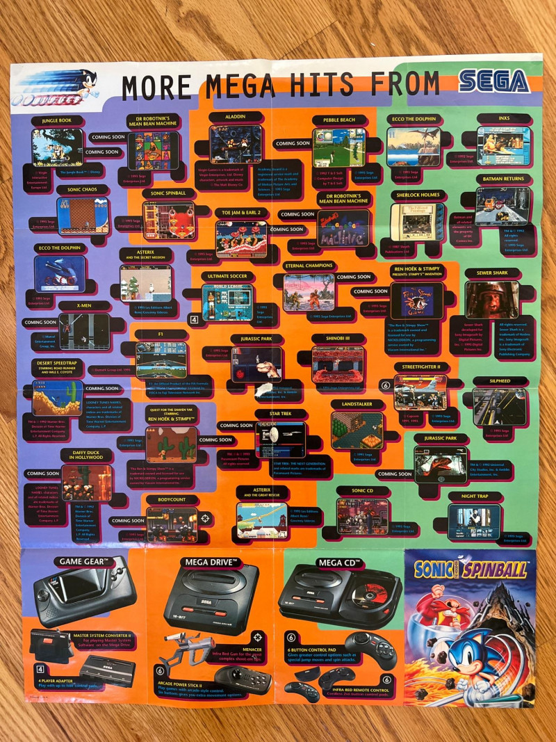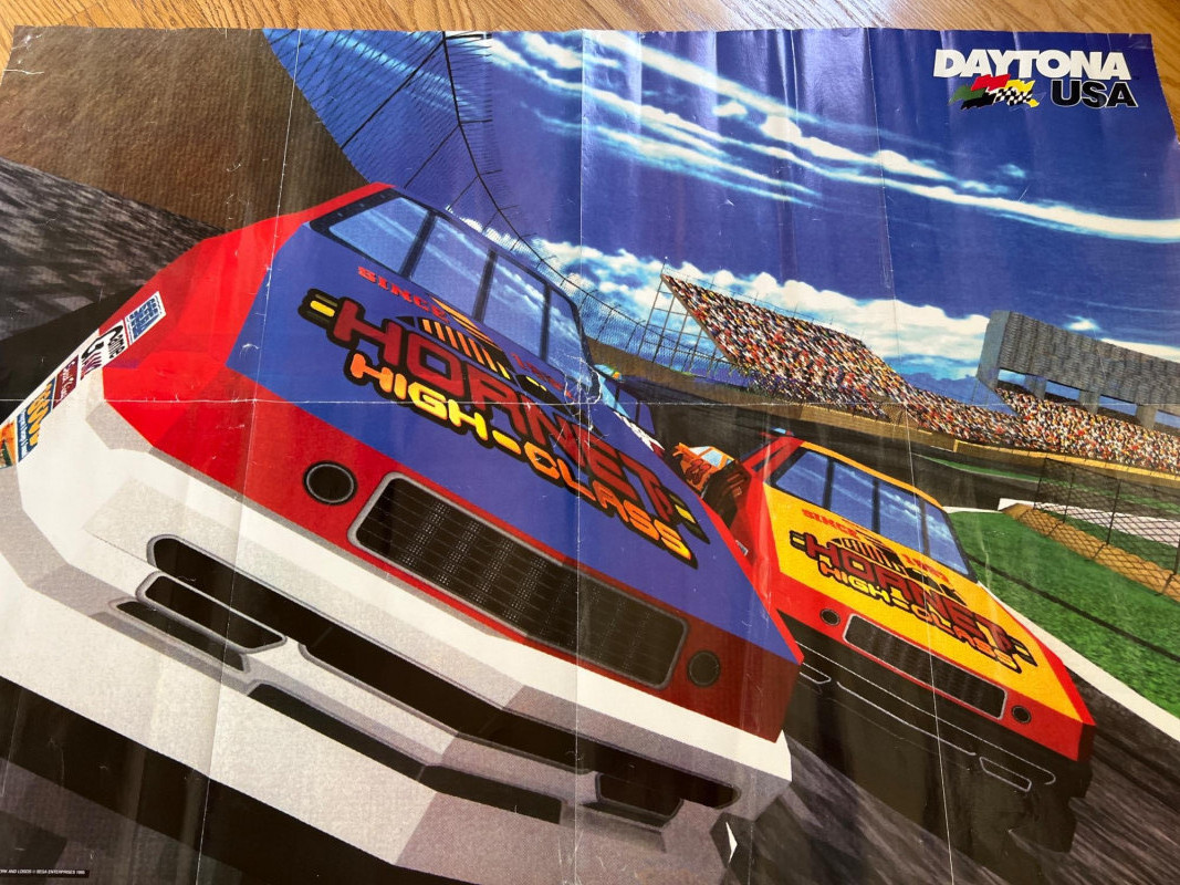 A vibrant trio of original SEGA video game posters featuring three iconic titles: Sonic the Hedgehog, Sonic Spinball, and Daytona USA. Each poster showcases classic early‑’90s SEGA artwork—bold color, arcade energy, and the unmistakable style that defined the era. Sonic appears in two dynamic designs, from the tropical platform landscapes of the original game to the high‑action pinball chaos of Spinball. The Daytona USA poster captures the polygonal racing aesthetic and the legendary Hornet car in full motion. Ideal for retro gaming collectors, arcade enthusiasts, or anyone building a nostalgic display. Note posters have fold creases and show wear at corners. Colors are vibrant. Sonic the Hedgehog - 20.5" height x 17" width