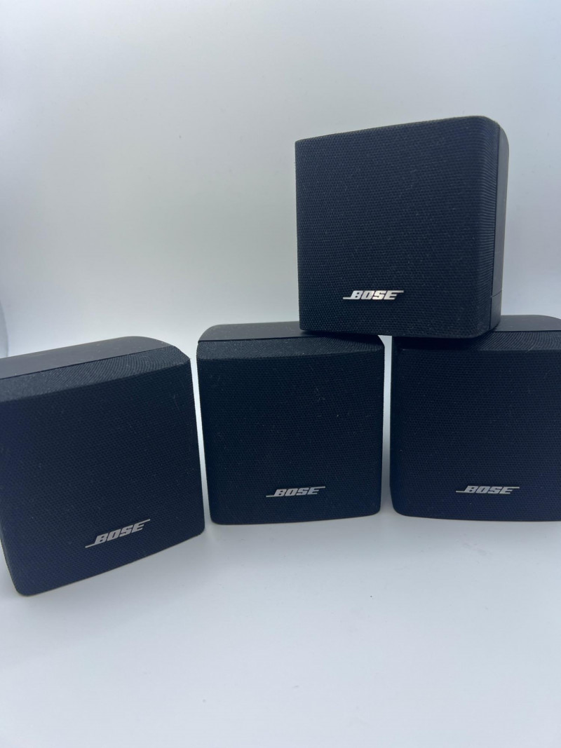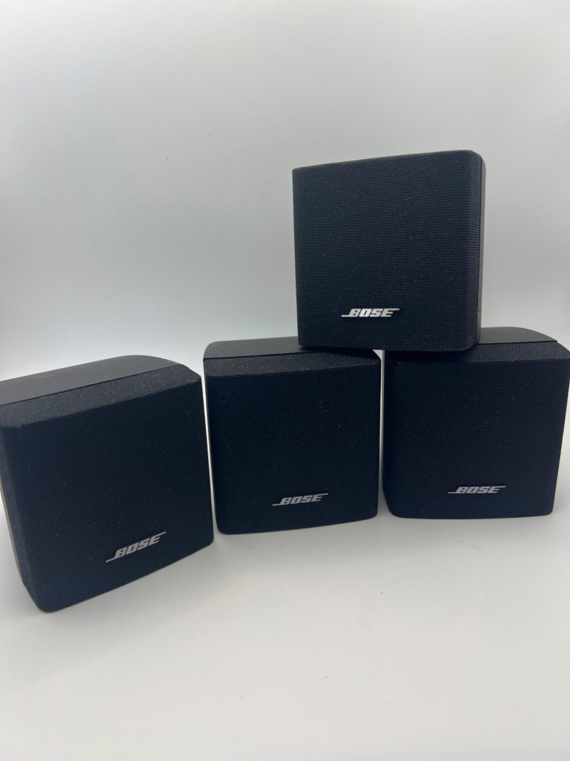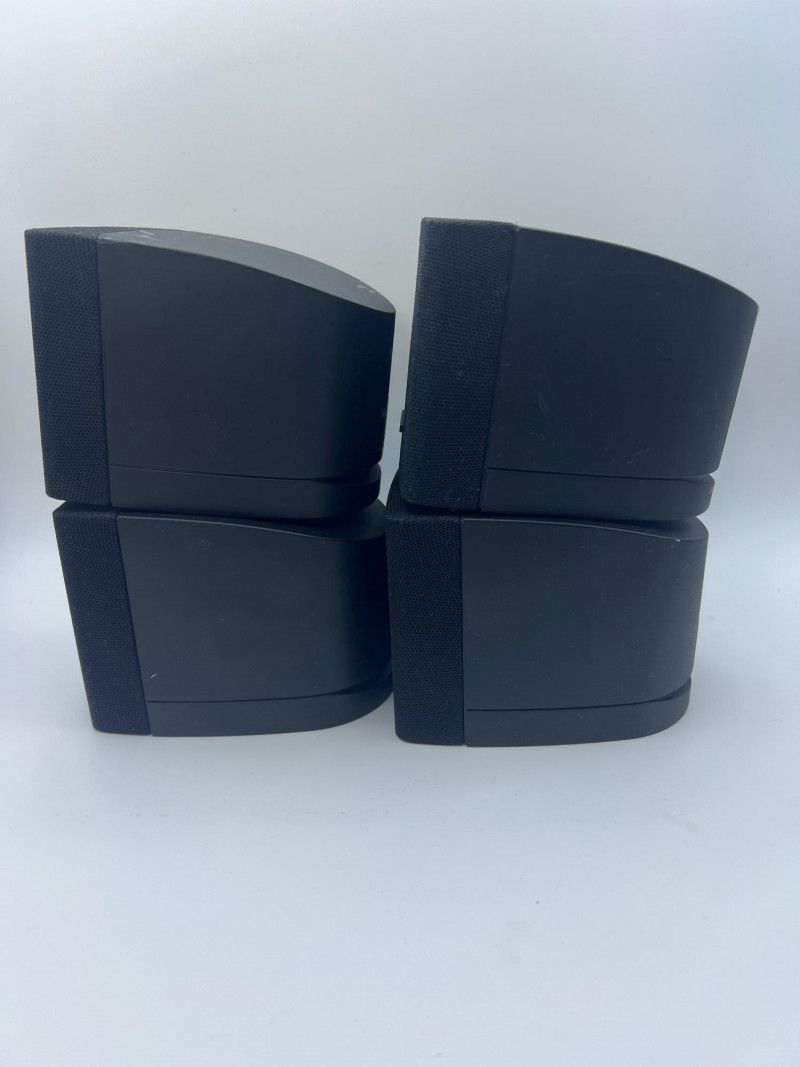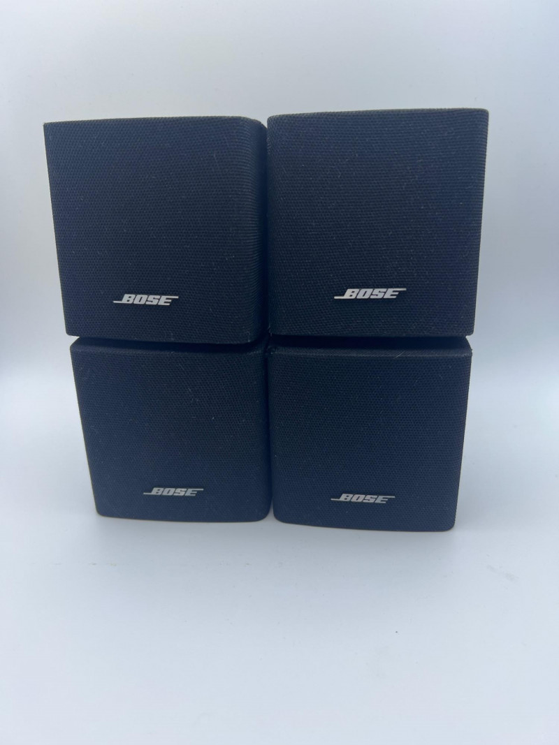 Set of four Bose cube‑style satellite speakers designed for home audio and surround‑sound systems. Compact black enclosures with front grilles and the classic Bose logo. Ideal as replacements, expansions, or supplemental speakers for compatible Bose systems. Exterior surfaces show handling and age‑appropriate wear consistent with prior use.