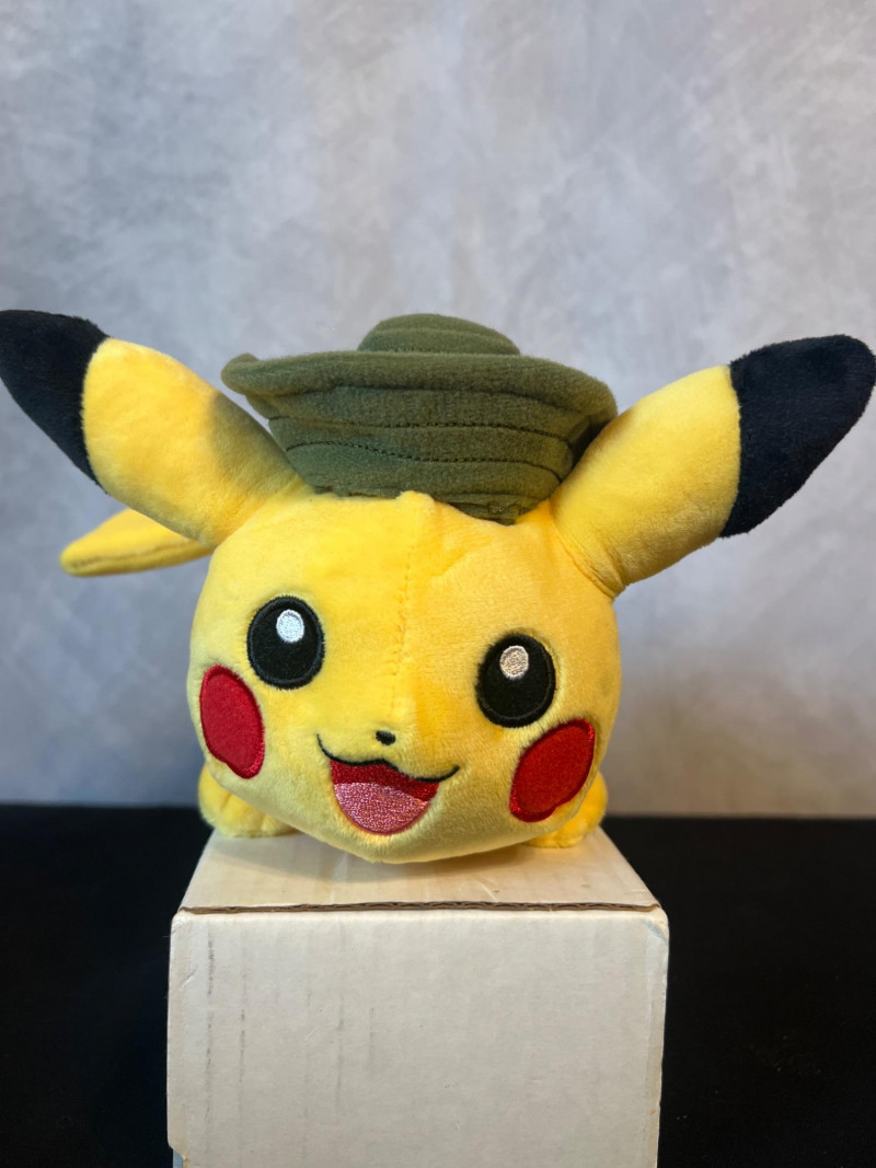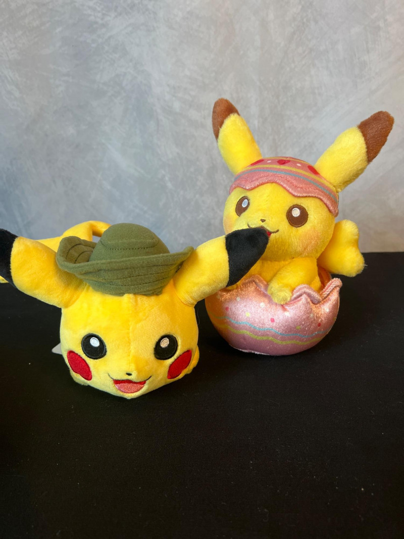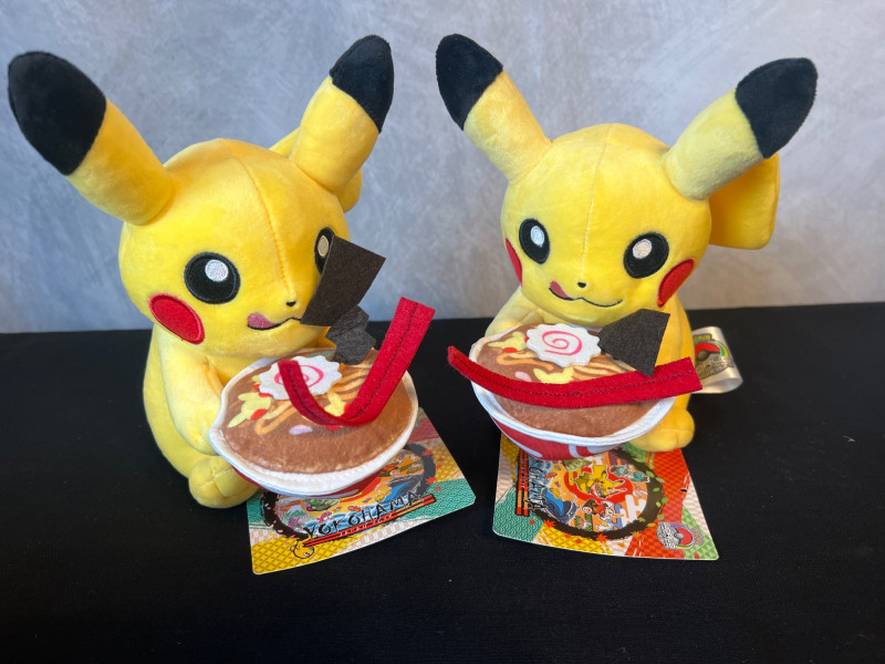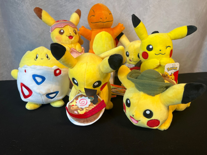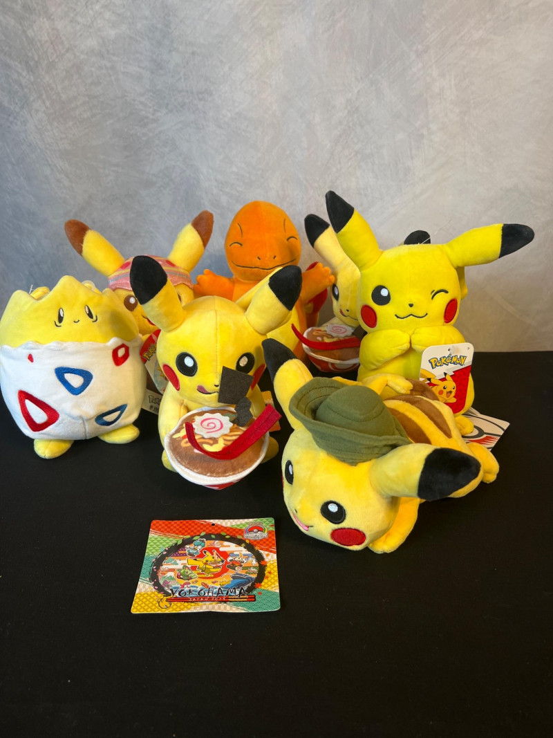 Adorable Pokémon plush collection, each approximately 9 inches and with original tags. Includes multiple Pikachu variants plus classic fan‑favorite characters: Pikachu (Ramen Bowl) – holding a bowl of ramen with chopsticks; bright, expressive design. Pikachu (Green Hat) – cheerful Pikachu wearing a green cap. Pikachu (Winking) – classic yellow plush with winking expression and tag. Togepi Plush – soft, pastel‑colored design of the beloved baby Pokémon. Charmander Plush – partially visible in the back; bright orange with signature flame‑tail styling. (no tag) All plush appear clean, vibrant, and well‑kept with tags attached (excluding Charmander). A charming bundle for collectors, kids’ rooms, or Pokémon Center fans.