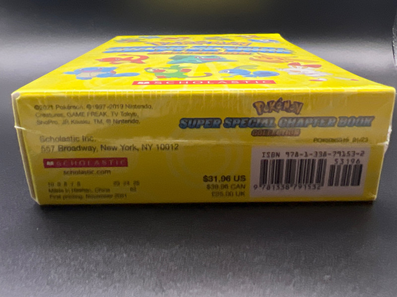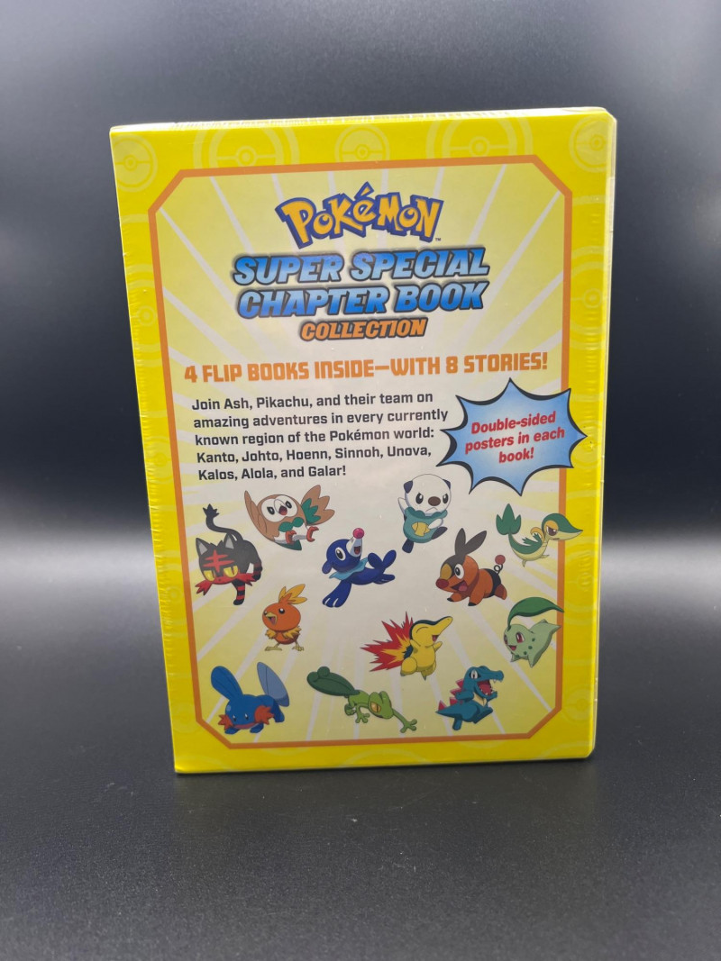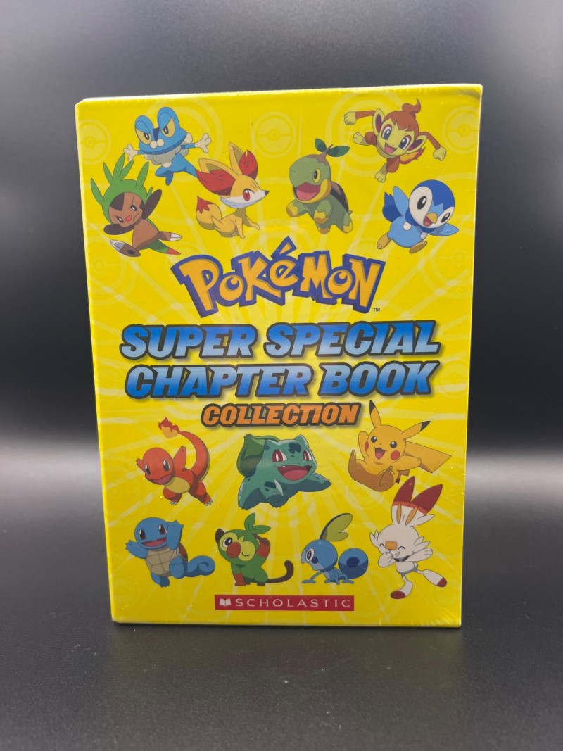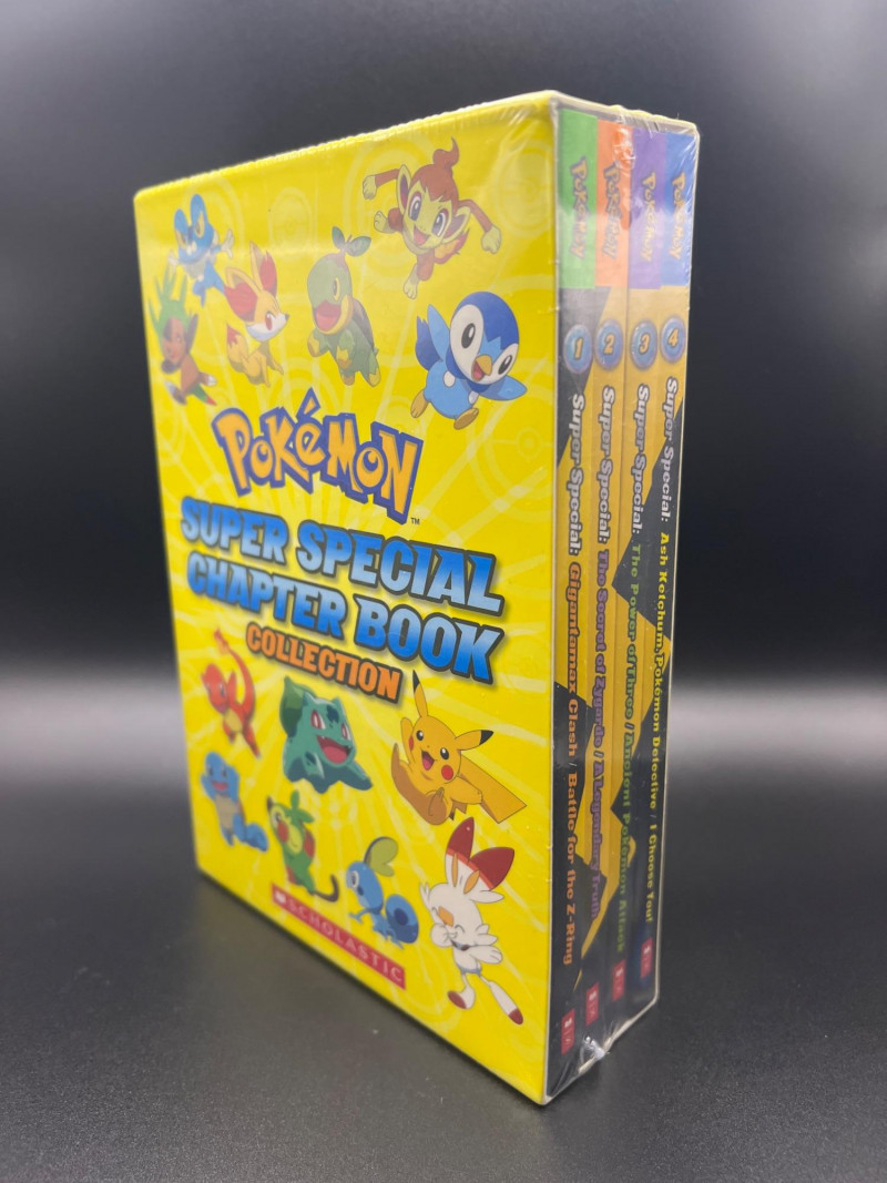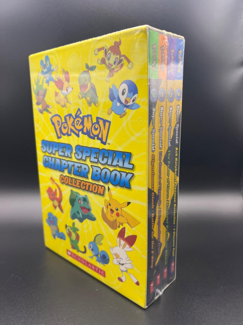 Colorful Pokémon Super Special Chapter Book Collection boxed set by Scholastic, featuring four action‑packed stories for young readers. Includes: Ash Ketchum, Pokémon Detective! The Secret of Zygarde Giratina and the Sky Warrior Battle for the Z‑Ring Bright, sturdy storage box with Pikachu, Bulbasaur, Scorbunny, Piplup, Chimchar, Turtwig, and more. A great set for early readers, Pokémon fans, or classroom libraries.