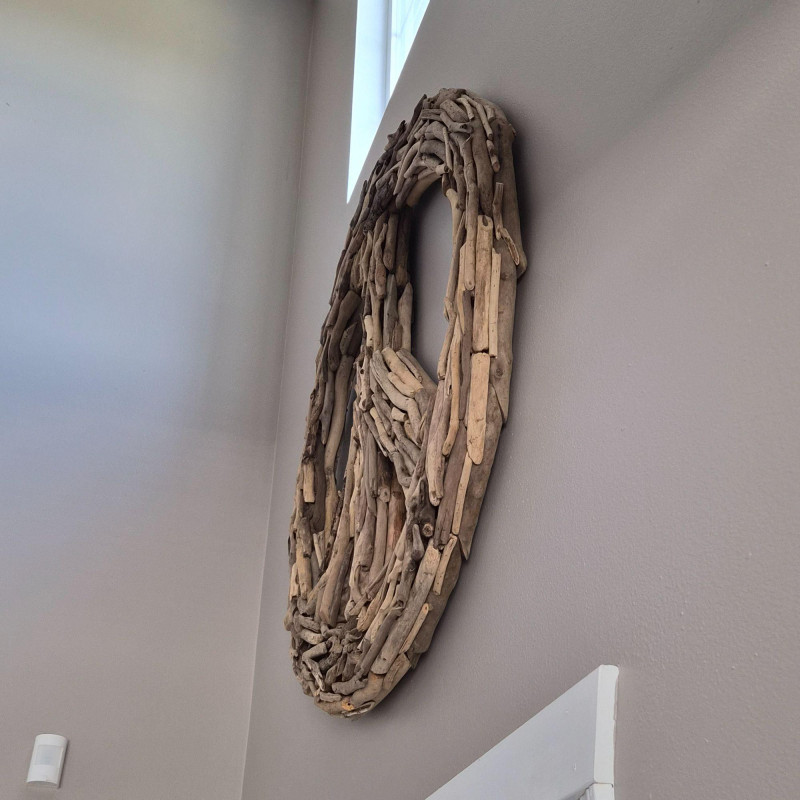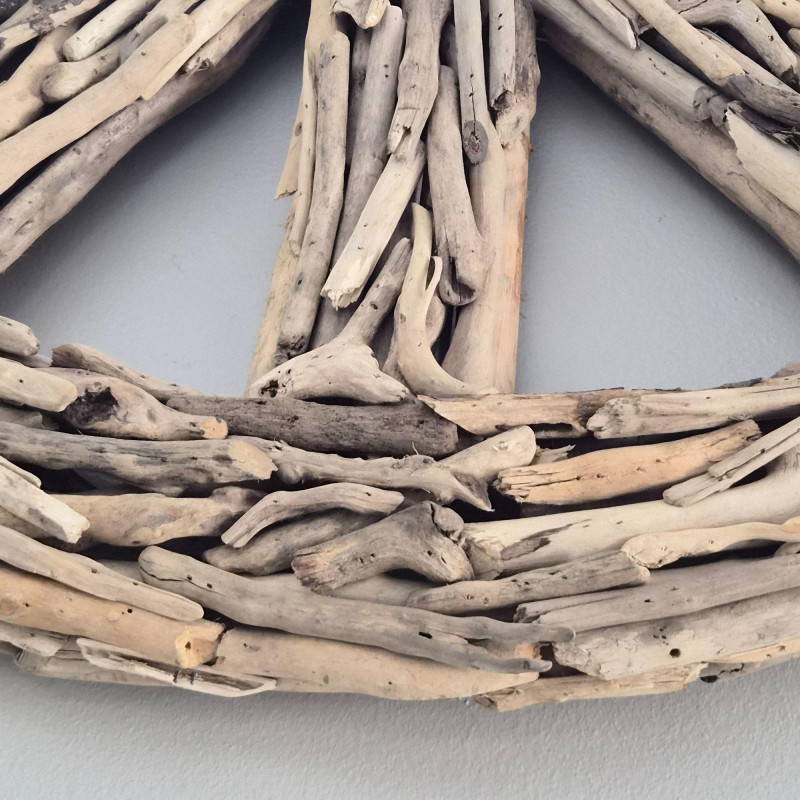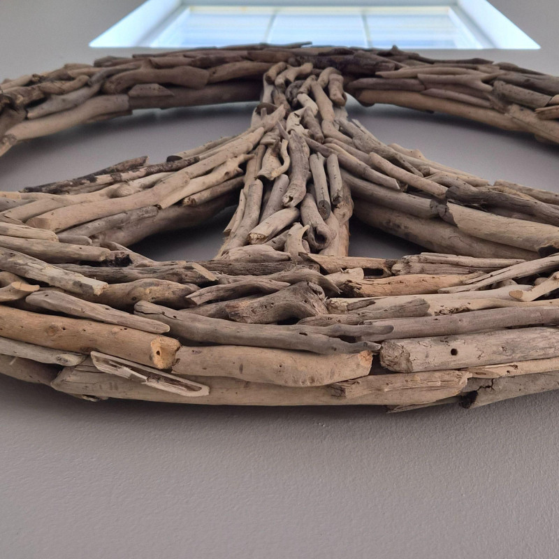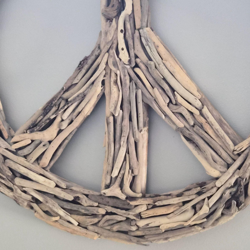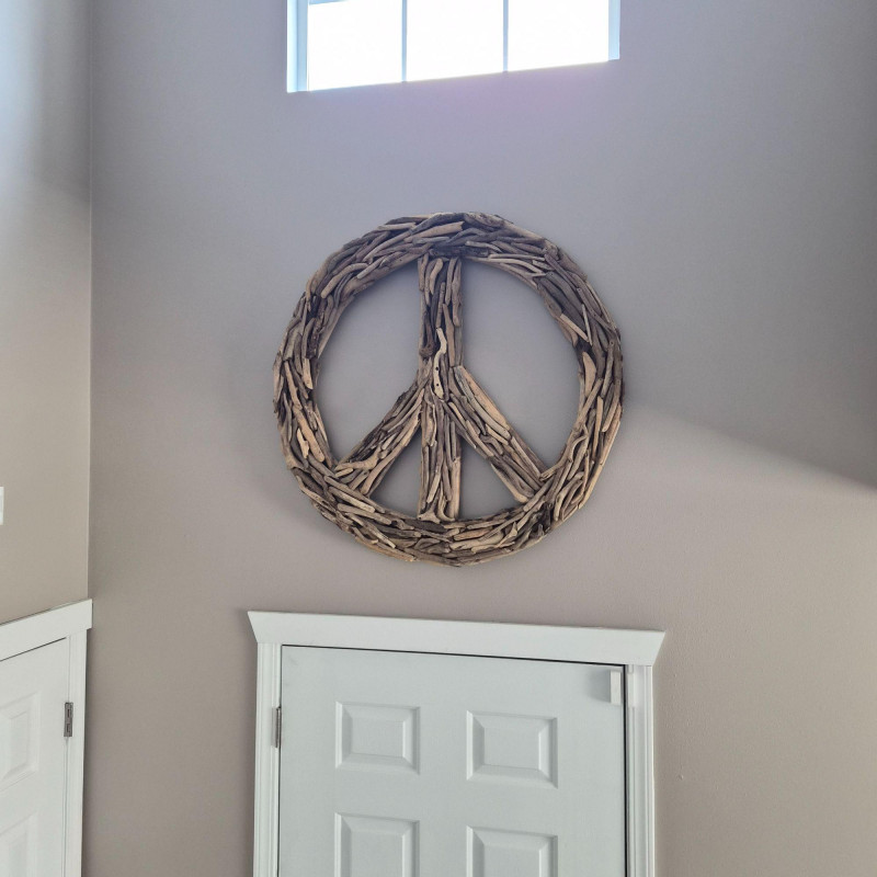 A striking 35-inch driftwood and twig peace sign, crafted from naturally weathered branches arranged into a bold, sculptural circle. The organic materials give it a warm, coastal‑rustic presence, with each twig adding texture, movement, and handmade character. This striking wall piece feels like it was gathered straight from a quiet shoreline and shaped by hand into art. Its airy, sculptural presence adds instant soul to any room—perfect for boho spaces, coastal retreats, eclectic galleries, or anyone who loves décor that feels both grounded and free‑spirited.