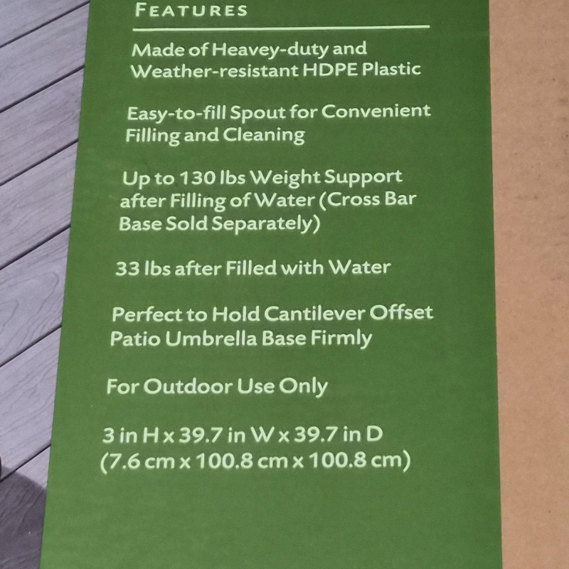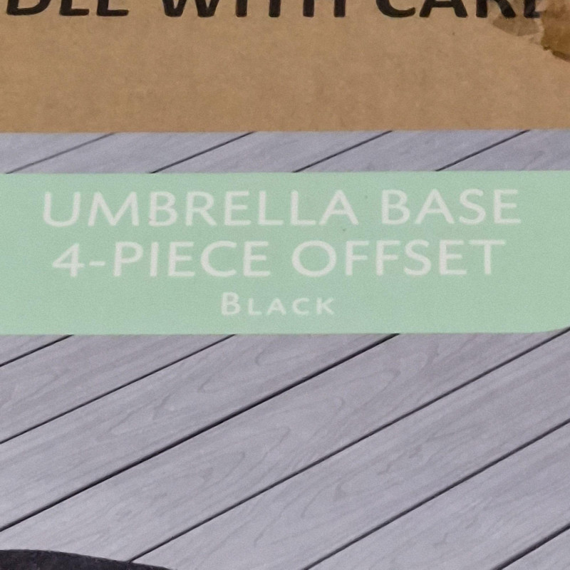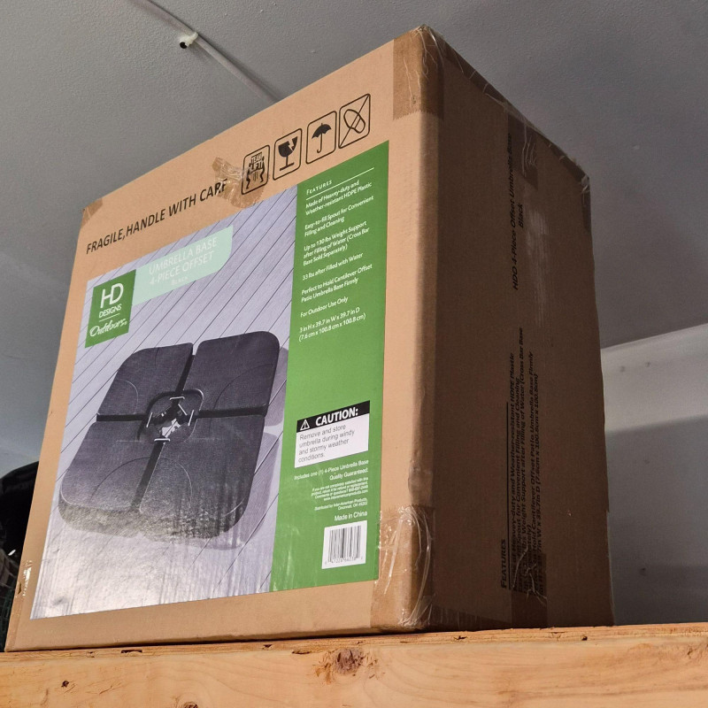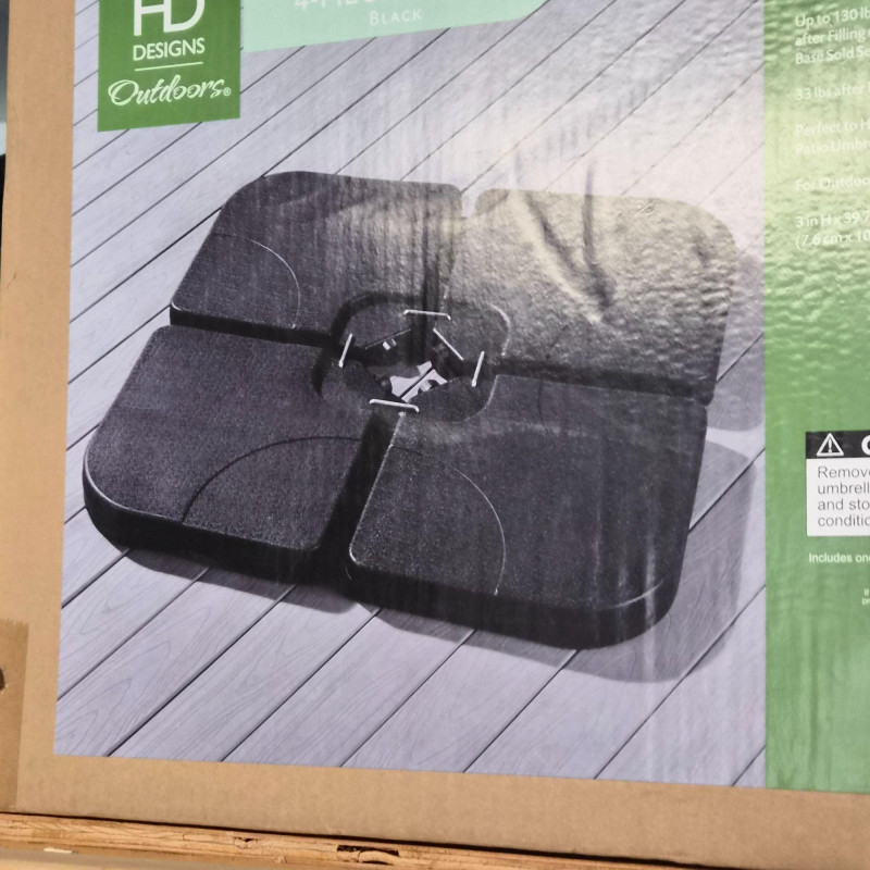 A brand‑new, never‑opened HD Designs 4‑Piece Offset Umbrella Base, built from heavy‑duty, weather‑resistant HDPE plastic for long‑lasting outdoor stability. Designed for offset and cantilever‑style umbrellas, each section is easy to fill with water or sand, and the wide, low‑profile design helps keep your umbrella securely grounded. The easy‑fill spouts make setup and cleaning simple, and when fully filled, the base provides up to 130 lbs of support (crossbar sold separately). A practical, durable solution for patios, decks, and outdoor seating areas where a stable umbrella base is essential.