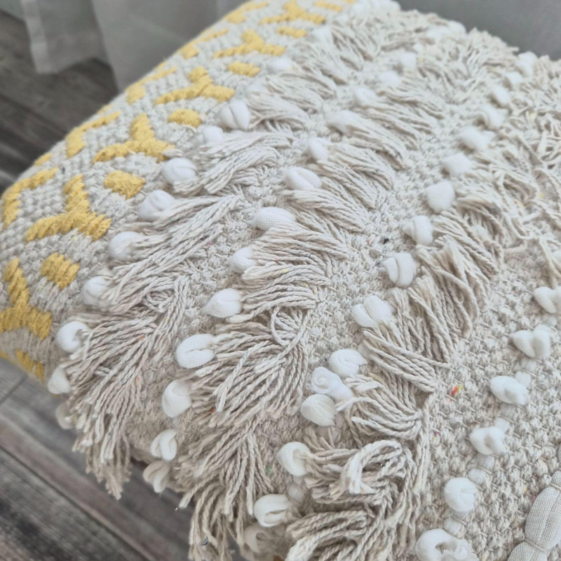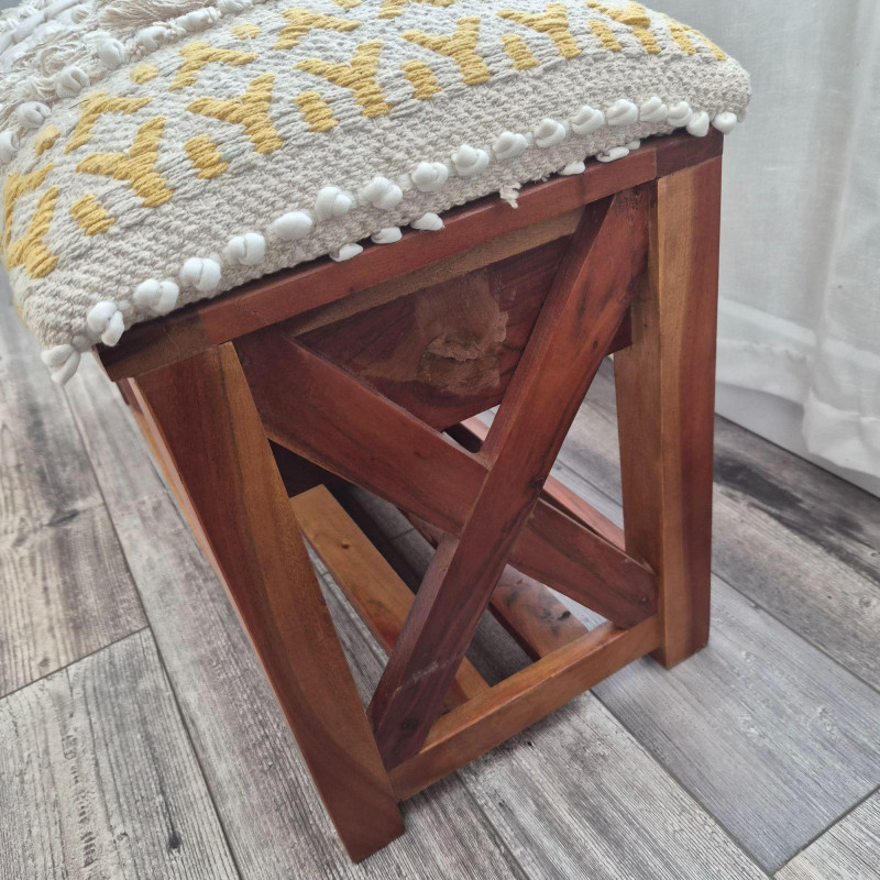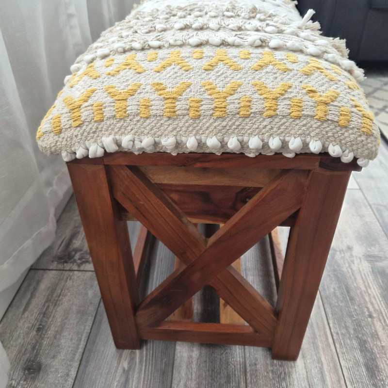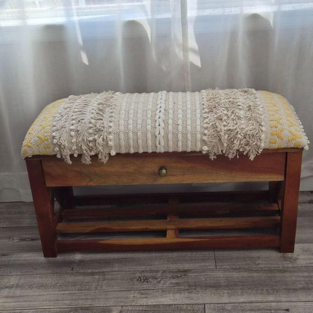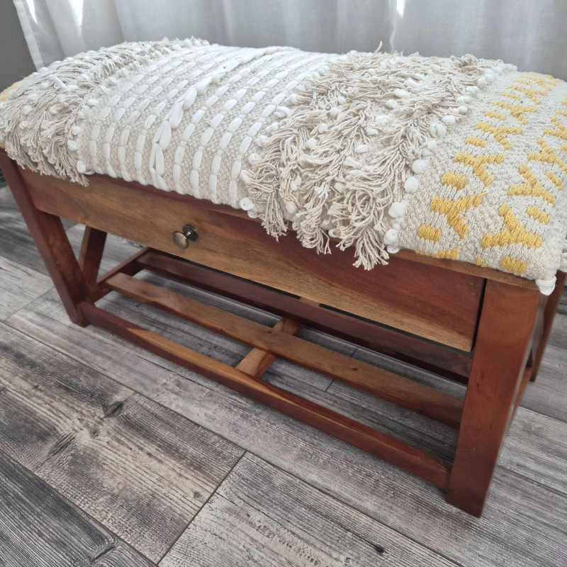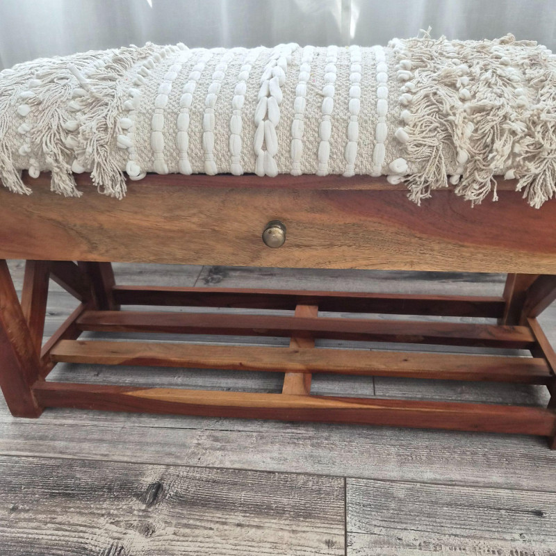 A beautifully crafted Bohemian‑style storage bench by Ram Chander Motilal Exports, made from solid acacia wood and designed with both artistry and function in mind. The bench features a woven cotton dhurrie‑style upholstered top, inspired by traditional rug‑making techniques, complete with geometric patterns, textured weaves, and subtle fringe or macramé details that give it a warm, global‑eclectic feel. Below the cushioned seat, a full‑width shelf and a smooth‑gliding drawer offer practical storage for blankets, shoes, accessories, or entryway essentials. The natural acacia wood grain adds richness and depth, balancing the soft textile top with earthy, handcrafted character. Perfect for entryways, bedrooms, or cozy boho‑styled nooks, this bench blends utility with artisan charm.