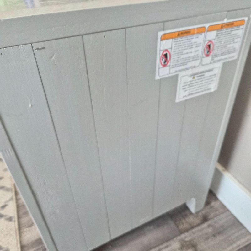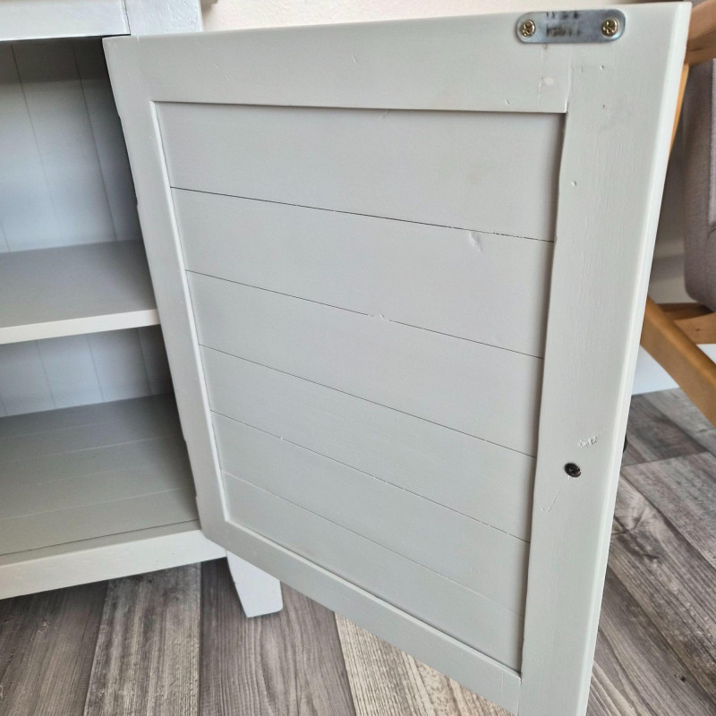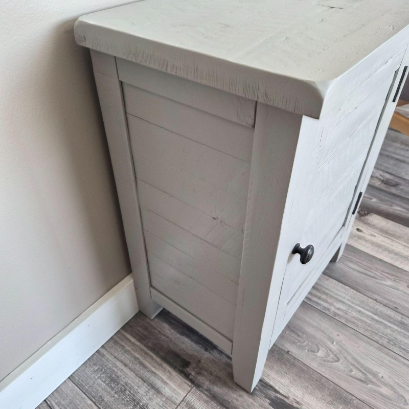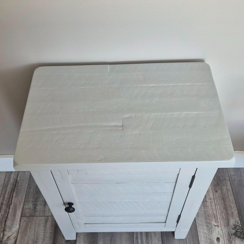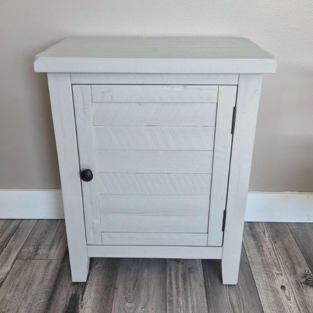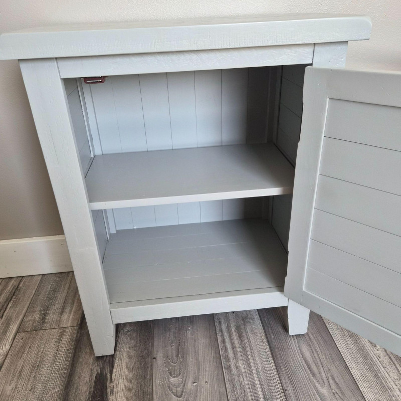 A charming modern‑rustic side table finished in a soft grey paint, featuring a single front door with slatted detailing and a classic round knob. Inside, two shelves offer practical storage for books, décor, or everyday essentials, making it a versatile accent piece for bedrooms, living rooms, or entryways. Its clean lines, compact footprint, and lightly weathered look give it that perfect blend of farmhouse warmth and contemporary simplicity.