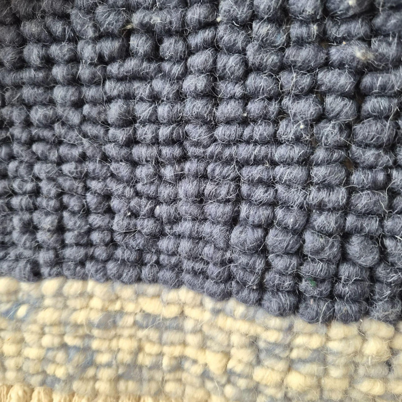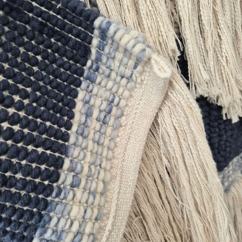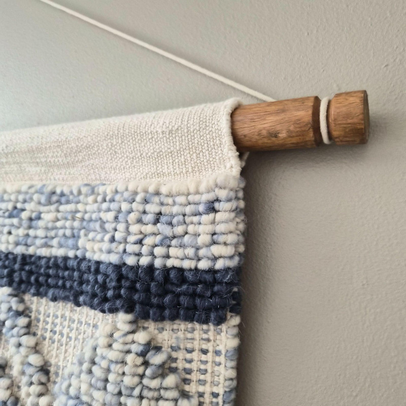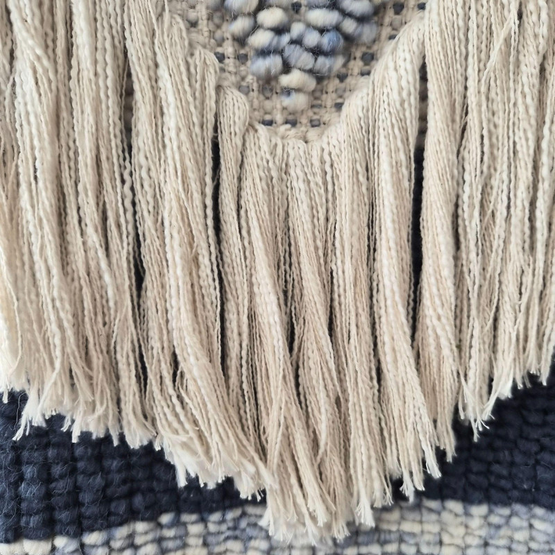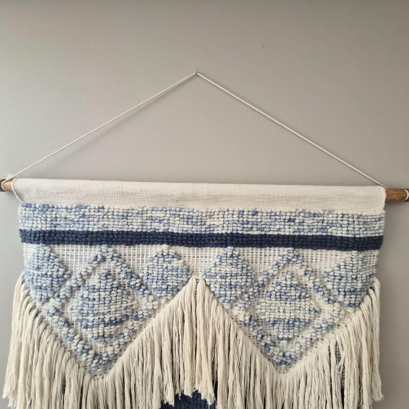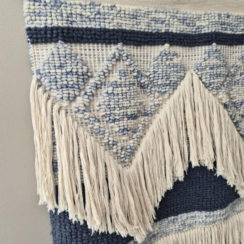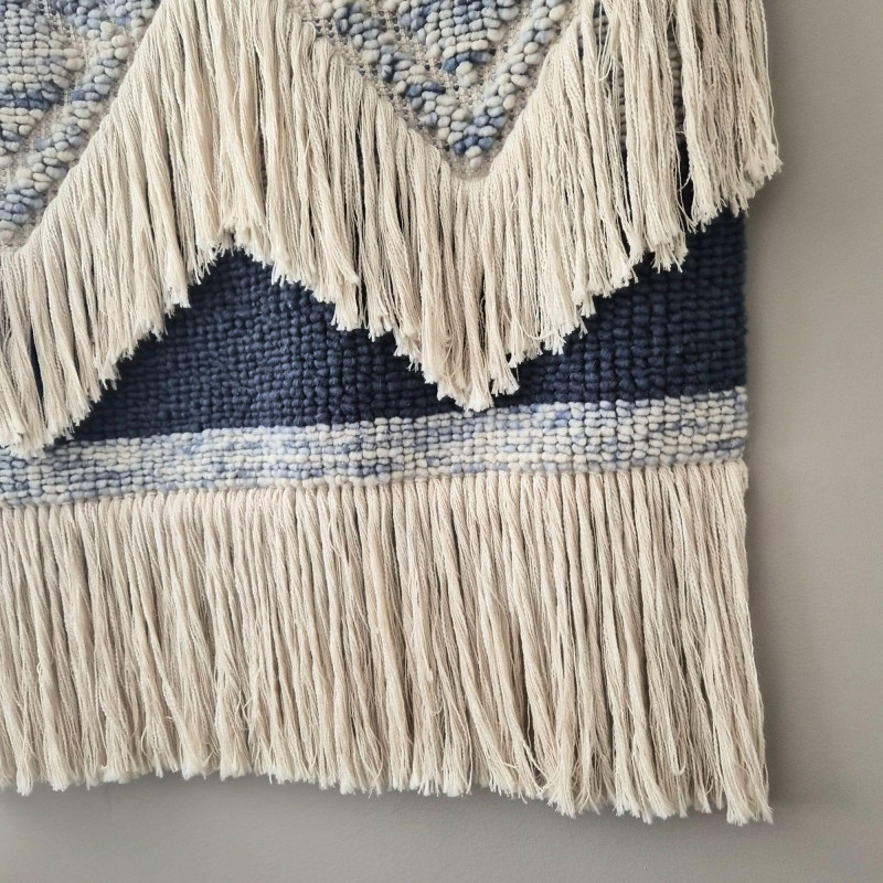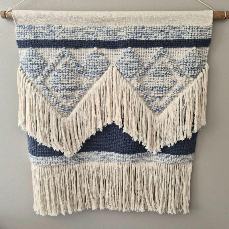A beautifully textured woven wool macramé wall hanging that brings instant warmth and artisan charm to any space. Soft light beige fibers are interlaced with muted blue diamond motifs, creating a calming, geometric rhythm that feels both modern and handcrafted. The layered fringe cascades in a chevron‑like sweep, adding movement, depth, and that irresistible boho‑textile drama. Suspended from a 42" wooden pole, the piece measures 37" wide × 41" tall, making it a substantial statement without overwhelming a wall. Its natural palette and tactile weave make it perfect for cozy bedrooms, serene living rooms, or gallery‑style arrangements that celebrate texture and craft.