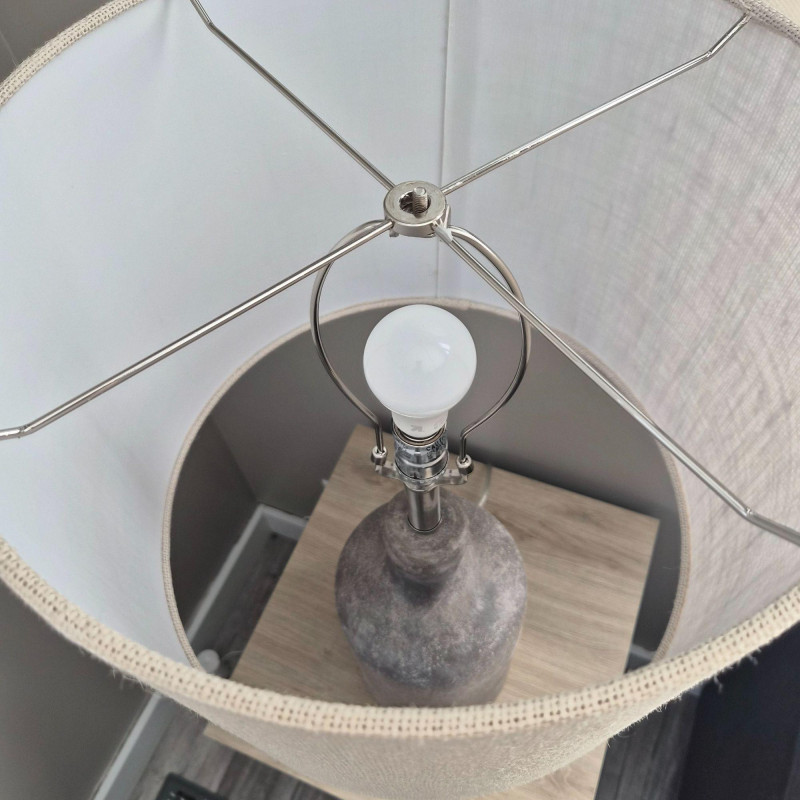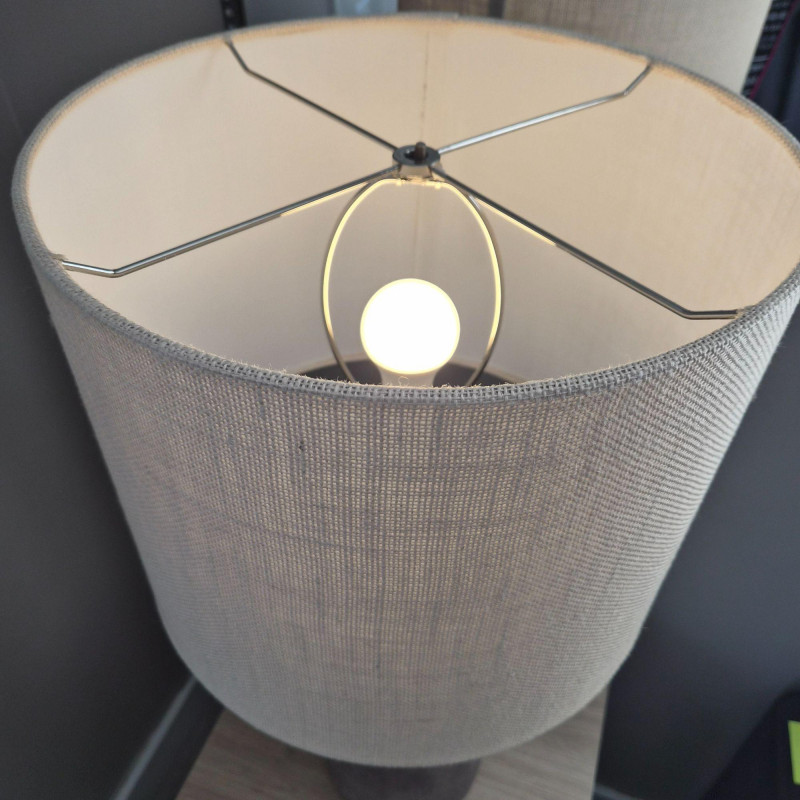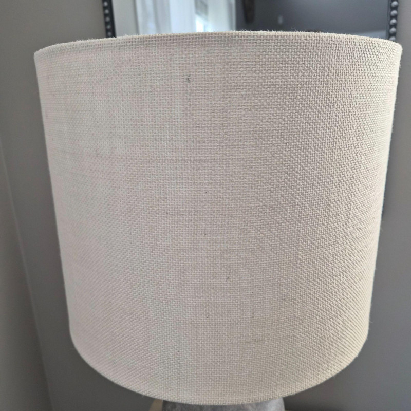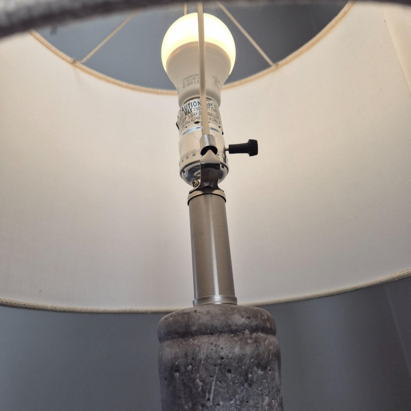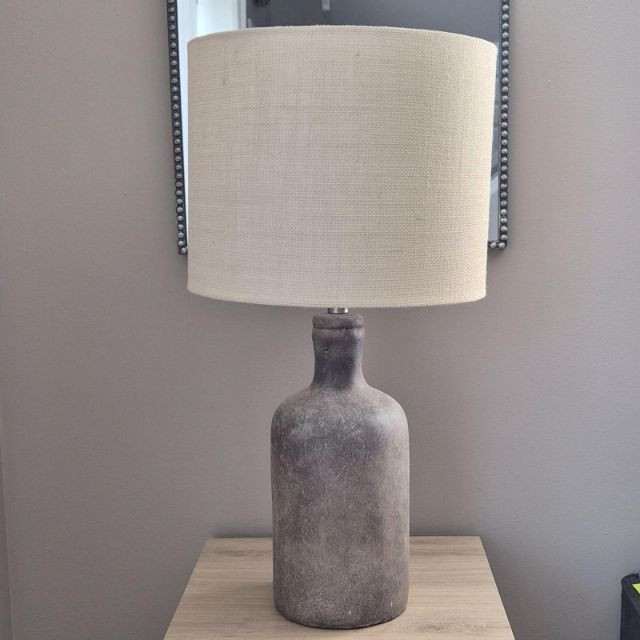 This Style‑Craft textured concrete table lamp features a molded grey bottle‑style base with a modern, sculptural feel. It’s paired with a beige drum shade that measures 12" high × 15" wide, offering a warm, diffused glow. The lamp includes a three‑way light switch for adjustable brightness. Overall dimensions are 30" high × 15" wide × 15" deep. It needs a finial replacement, but the lamp is otherwise ready to elevate a living room, bedroom, or entryway with its clean, contemporary look.