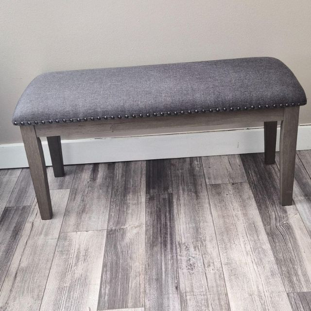 A sleek Ashley bench featuring a padded dark grey fabric seat for comfortable everyday use. The seat is trimmed with decorative tack accents, adding a touch of classic detailing. The bench rests on a medium brown wood frame with clean, sturdy legs, giving it a modern‑neutral look that fits effortlessly in entryways, bedrooms, or living spaces. Compact, versatile, and stylish—an easy piece to layer into contemporary or transitional décor.