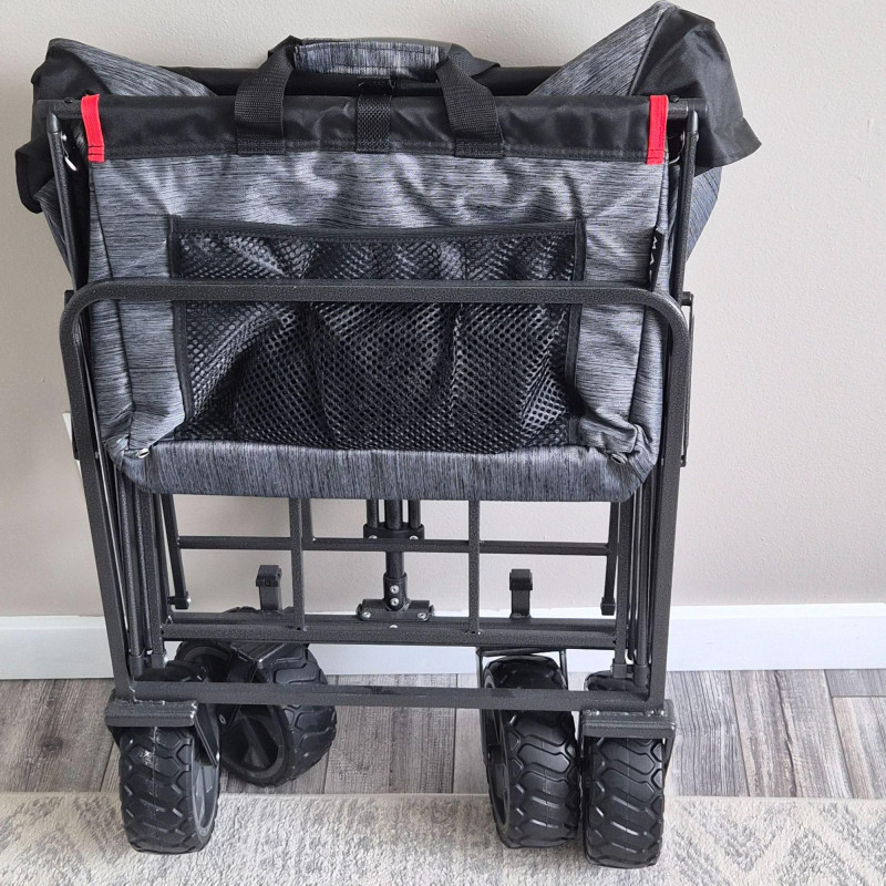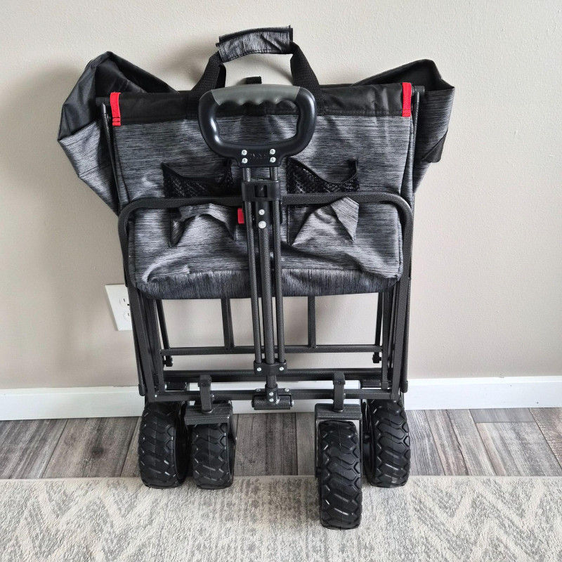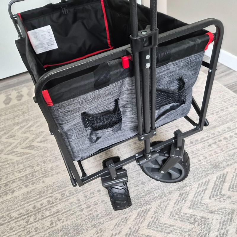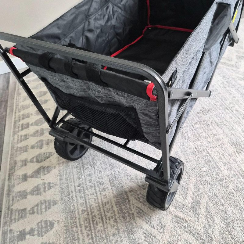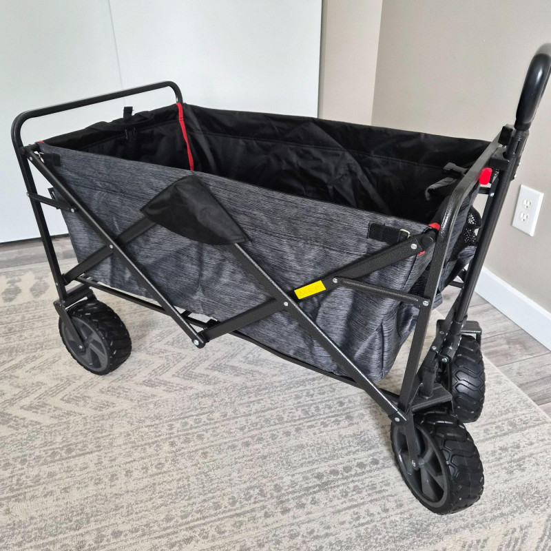 This new MacSports utility wagon/cart features a sturdy black metal frame paired with a durable black and gray nylon insert, designed for hauling gear, groceries, sports equipment, gardening supplies, and more. The cart rolls smoothly on 7.5" heavy‑duty plastic wheels and an adjustable handle, built to endure indoor and outdoor surfaces with ease. Its collapsible design allows for quick folding and compact storage, making it a practical choice for home, travel, or events. Clean, rugged, and ready for work.