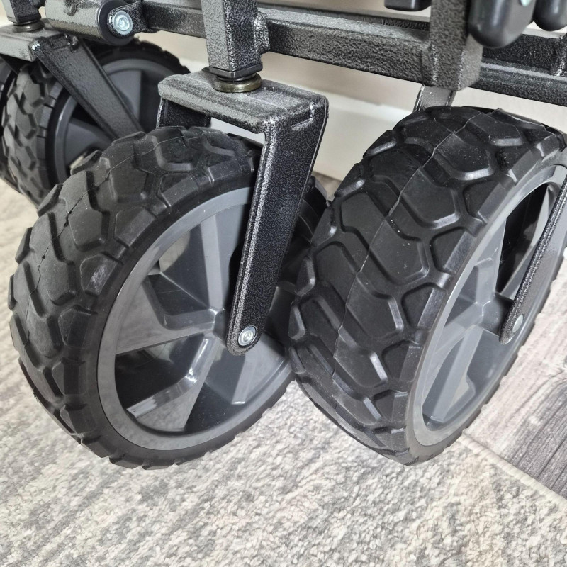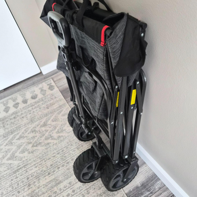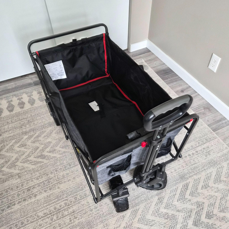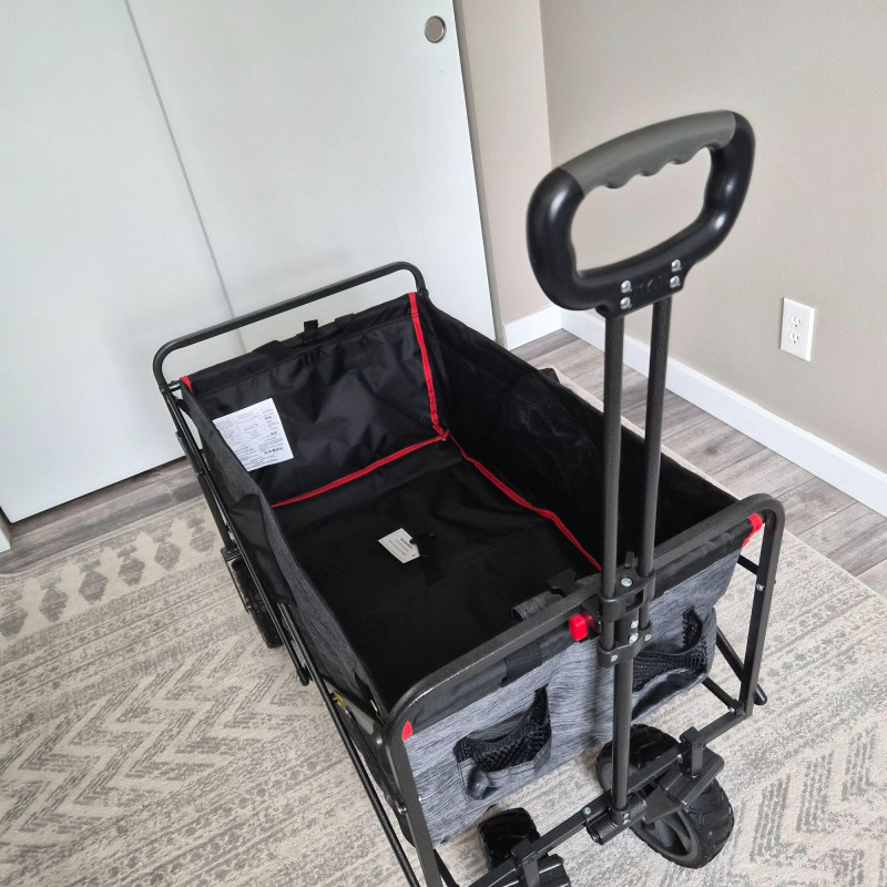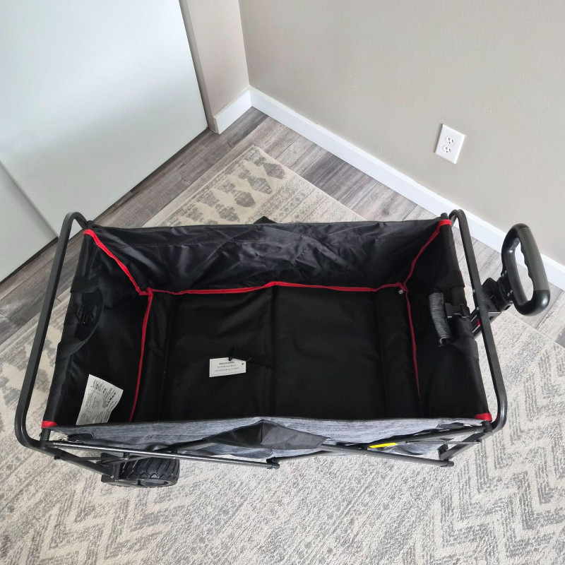 This new MacSports utility wagon/cart features a sturdy black metal frame paired with a durable black and gray nylon insert, designed for hauling gear, groceries, sports equipment, gardening supplies, and more. The cart rolls smoothly on 7.5" heavy‑duty plastic wheels and an adjustable handle, built to endure indoor and outdoor surfaces with ease. Its collapsible design allows for quick folding and compact storage, making it a practical choice for home, travel, or events. Clean, rugged, and ready for work.