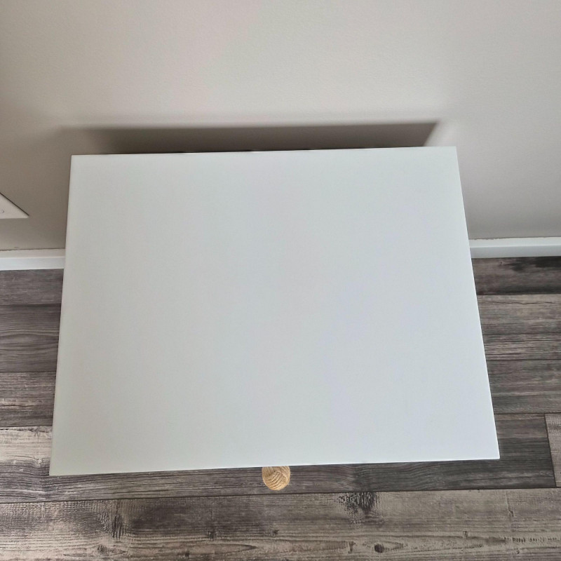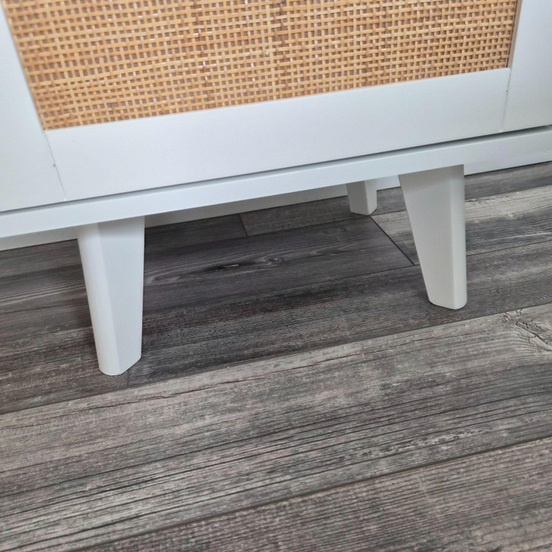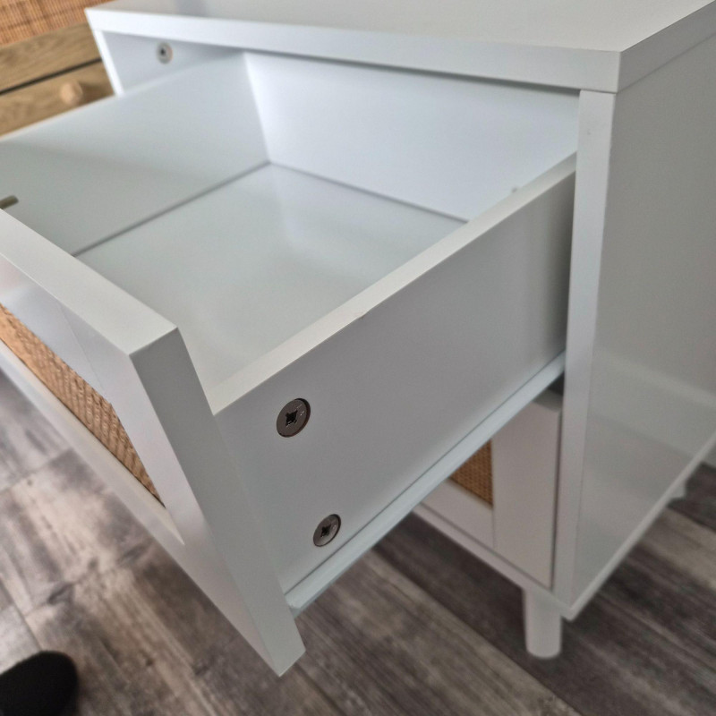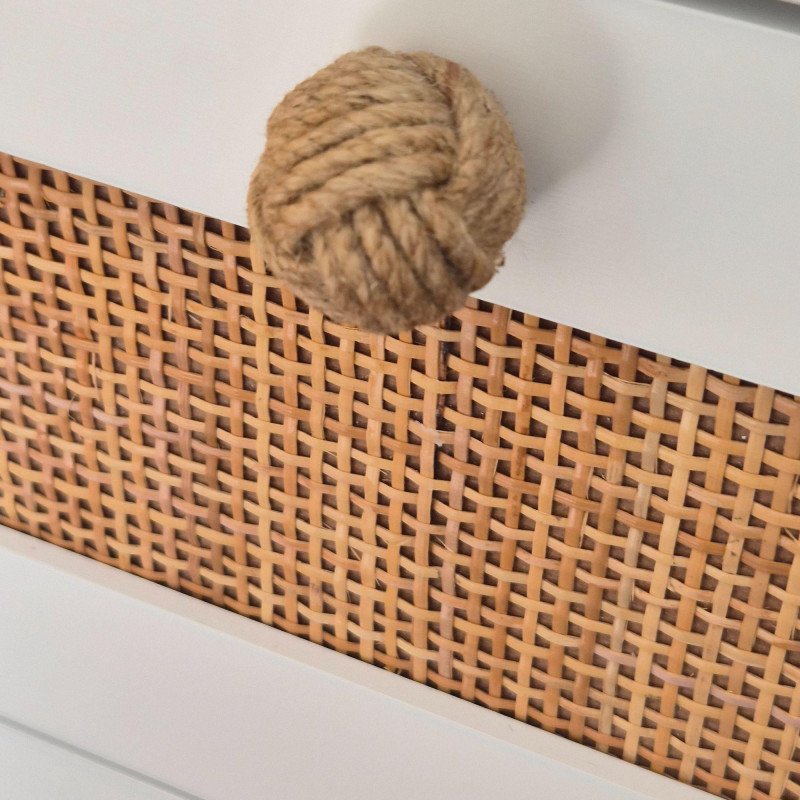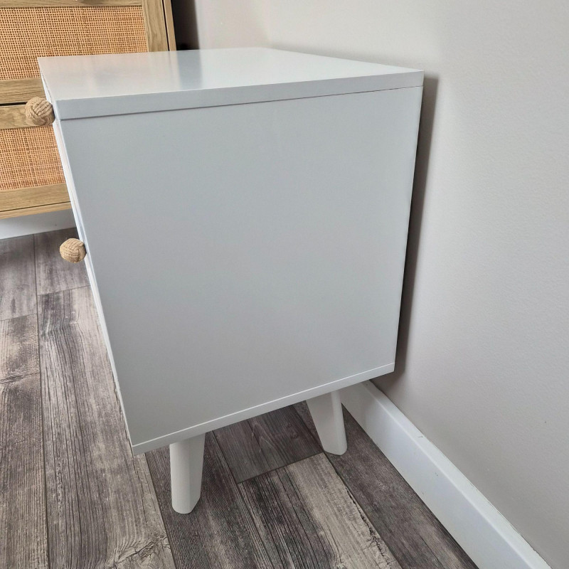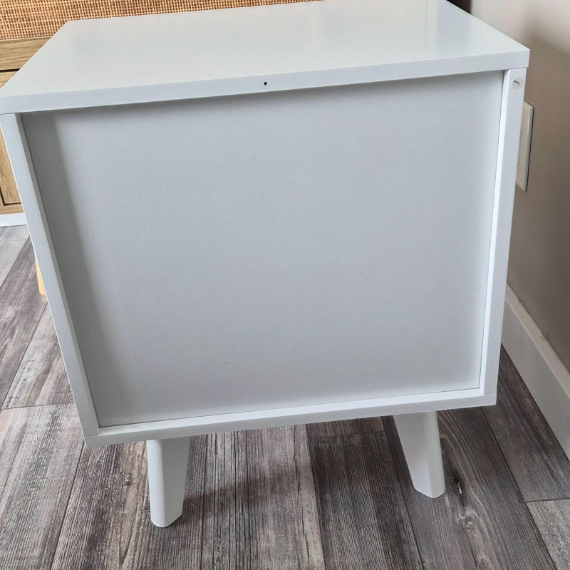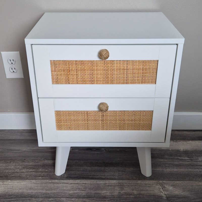 A fresh, modern white bedside nightstand featuring clean lines, warm natural texture, and a compact, versatile footprint. The two drawers are finished with tan woven panels and round twine‑wrapped knobs, adding an organic coastal touch. The piece stands on four gently flaring legs, giving it a light, elevated silhouette that feels both contemporary and relaxed. Perfect beside a bed, in a guest room, or as a small accent table in living spaces.
