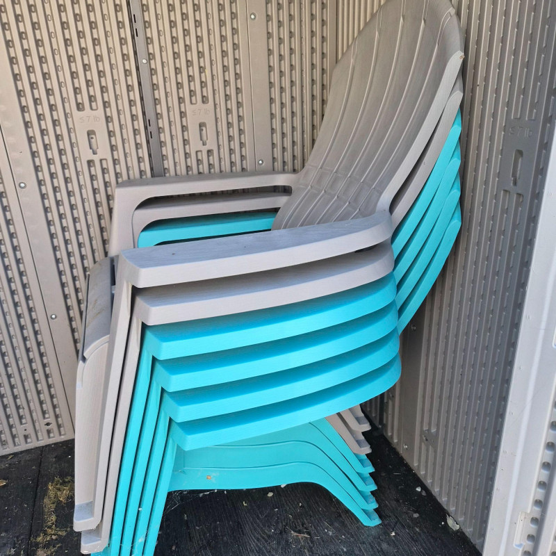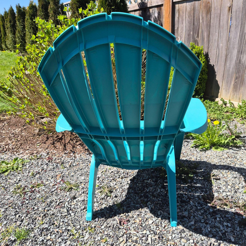 A cheerful, ready‑for‑summer seating set featuring six matching plastic Adirondack‑style outdoor chairs. All six share the same classic silhouette—wide armrests, gently reclined backs, and that easygoing Adirondack comfort—while bringing a fun mix of color to your patio or yard. The set includes four chairs in a bright robin’s‑egg blue and two in a clean, modern grey, all stackable for simple storage and lightweight enough to move around the yard with ease. Perfect for fire pits, porches, patios, or creating an instant gathering spot outdoors.