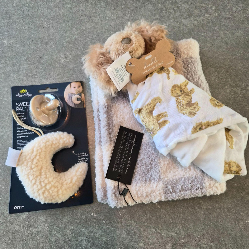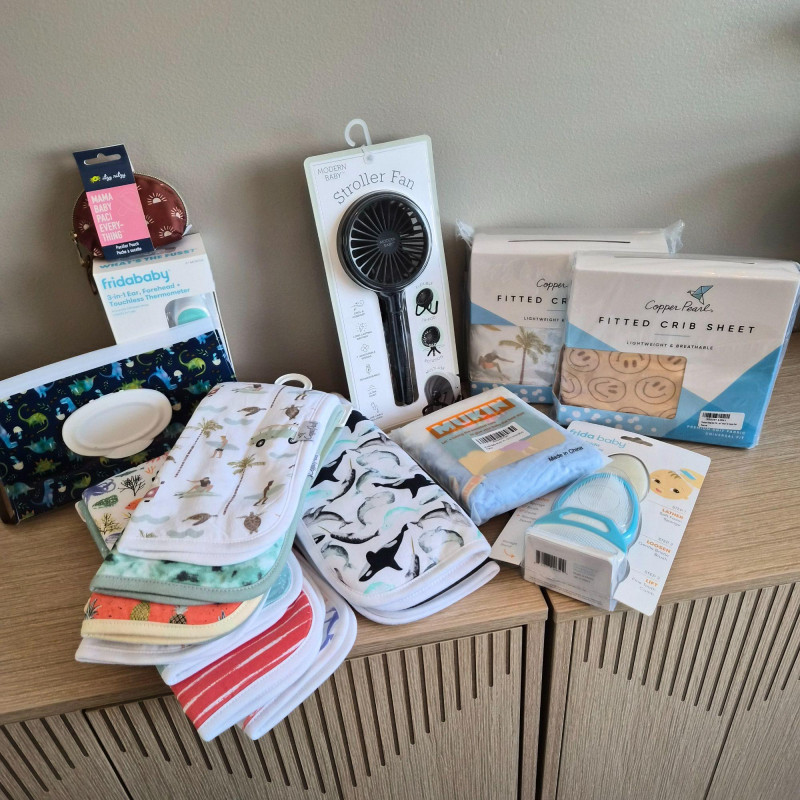 A thoughtfully gathered baby‑care essentials bundle, all new, packed with practical gadgets and soft everyday must‑haves for new parents. This lot includes a stroller fan for on‑the‑go comfort, plush burping cloths in assorted patterns, a thermometer, pacifier, plush blanket and hair‑grooming tools for gentle daily care. Also included are fitted crib sheets, Frida Baby grooming items, and additional nursery accessories to round out the set. A versatile, ready‑to‑use assortment perfect for baby showers, new parents, or stocking a nursery with trusted basics. All new items, suitable for gifting.