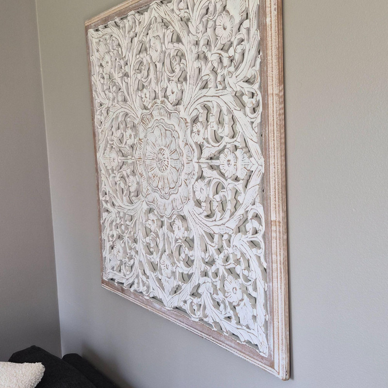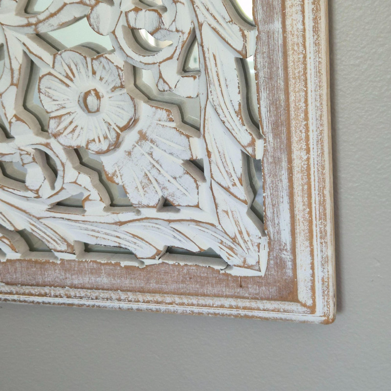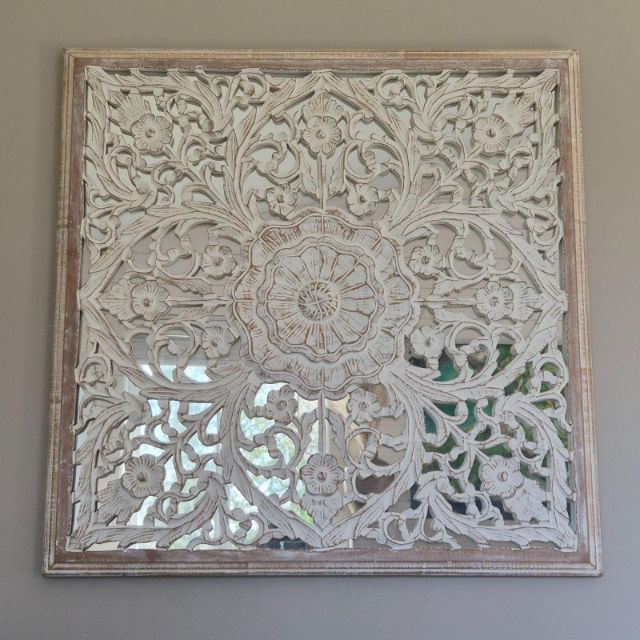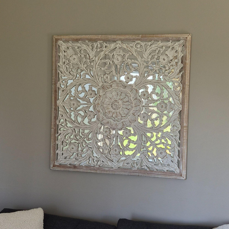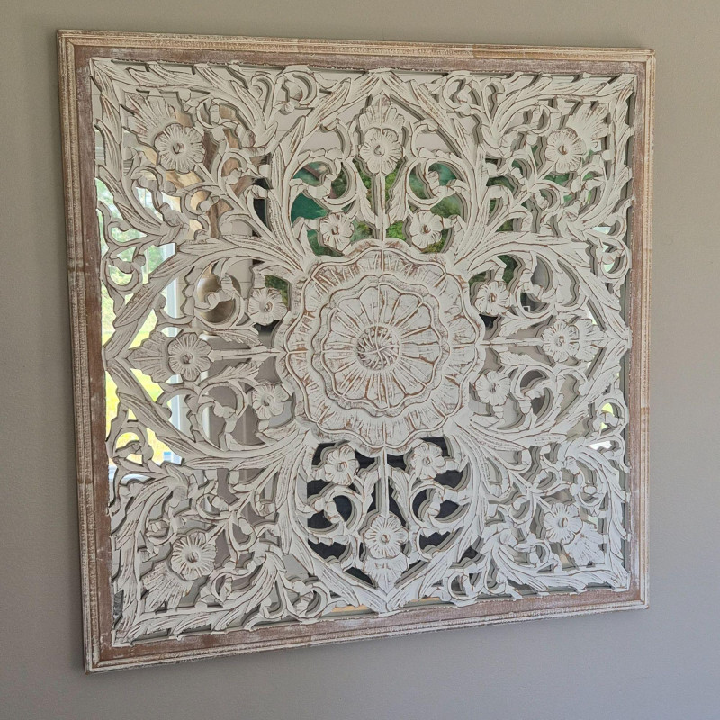 A beautifully detailed rustic white carved wood panel featuring an ornate floral and vine motif framed in a chic distressed finish. The intricate openwork design sits over a mirrored background, adding depth, light, and a touch of elegance to any wall. Often associated with Arhaus Sukho‑style or mandala‑inspired décor, this piece functions as both artwork and sculptural wall accent. Perfect for entryways, living rooms, bedrooms, or serene “sanctuary” spaces where texture and reflection create a calming focal point.