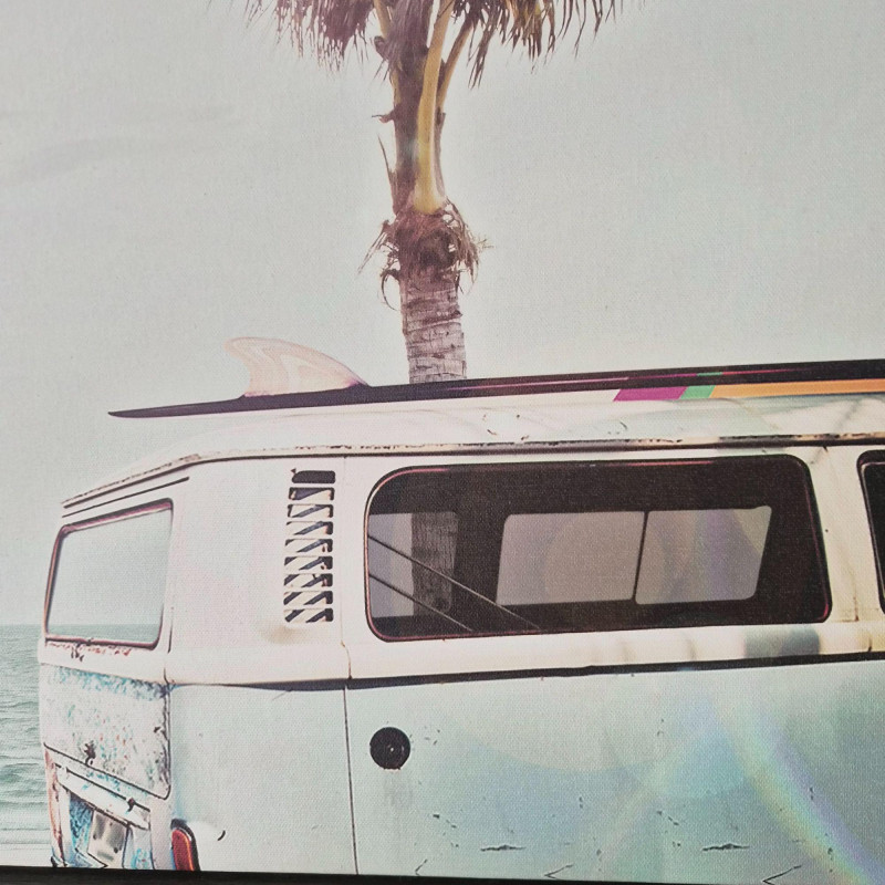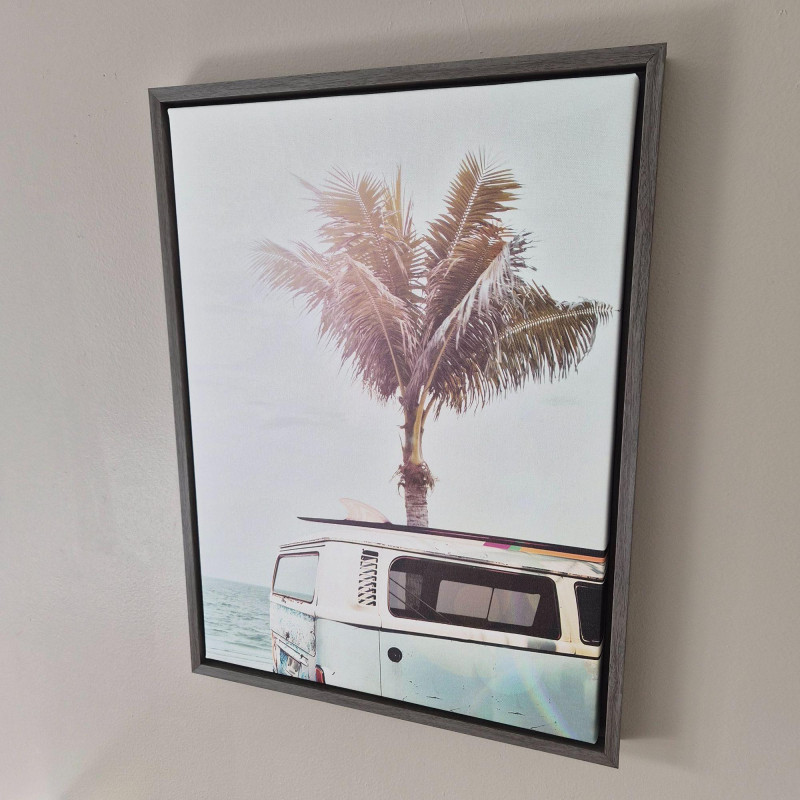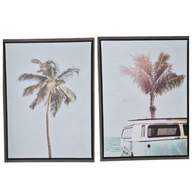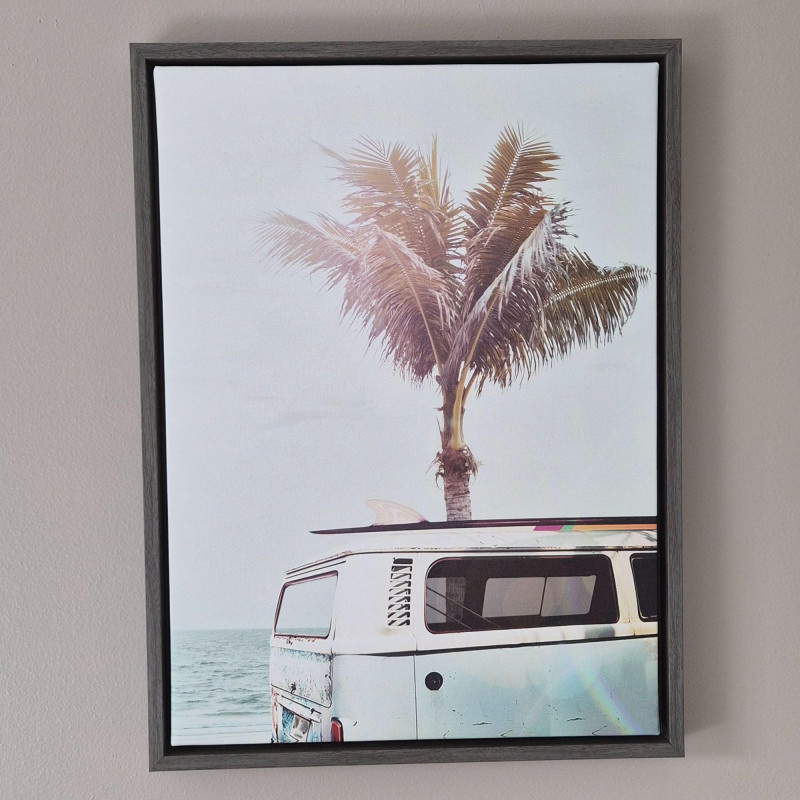 A relaxed, beach‑inspired set of two framed canvas prints featuring soft pastel tones and sun‑washed coastal imagery. One print highlights a tall, iconic palm against an open sky, while the other pairs a palm tree with a classic surf‑side van near the shoreline. Each piece measures 18" × 24", making them perfect for bedrooms, living rooms, hallways, or any space that could use a touch of laid‑back, tropical charm. Easy to hang and effortlessly stylish.