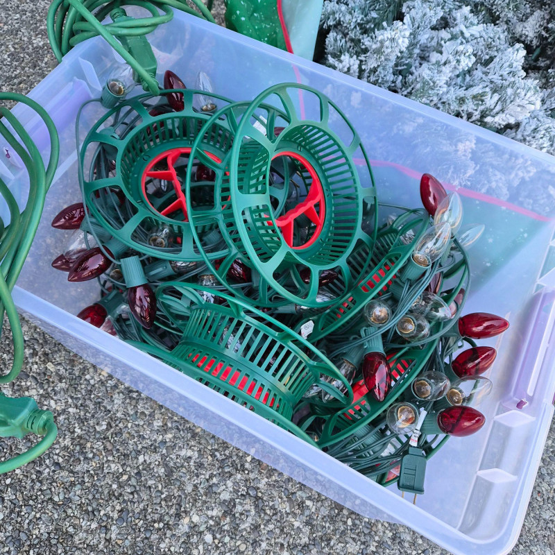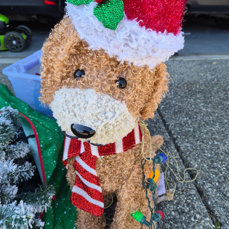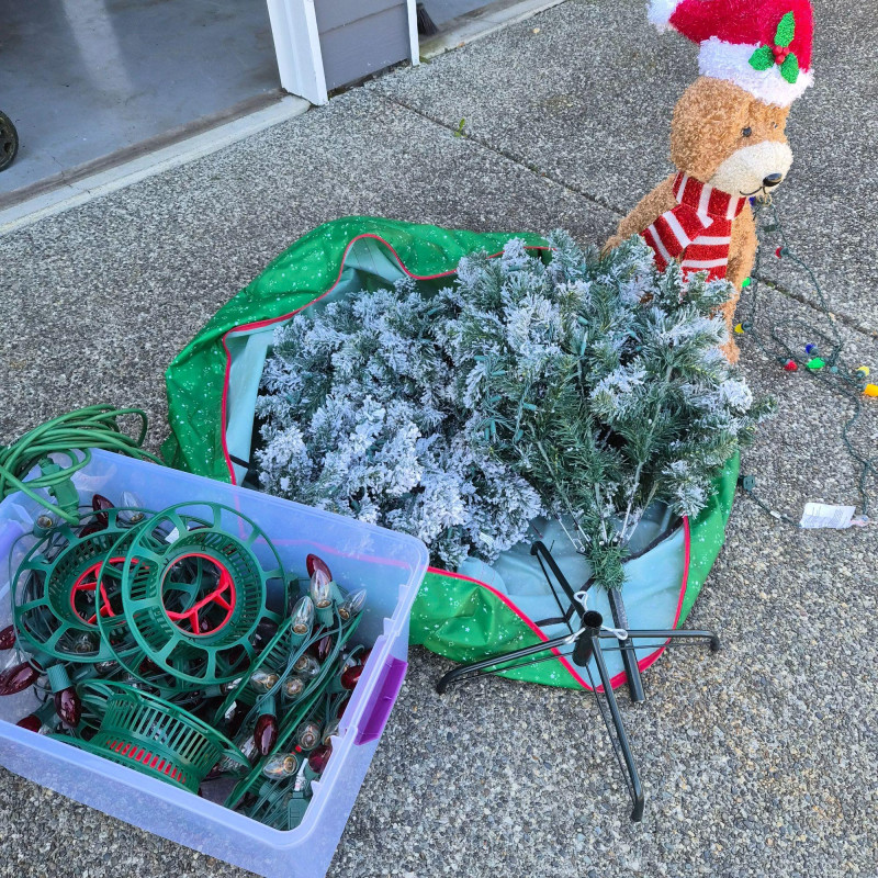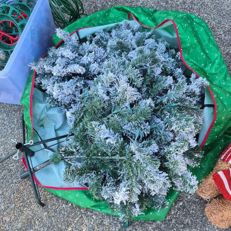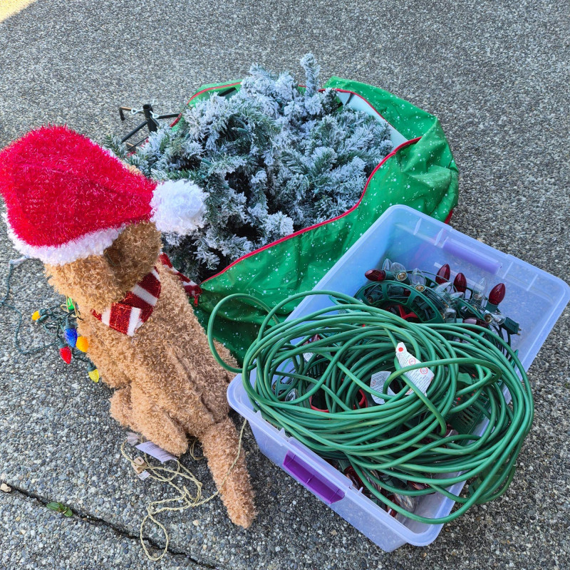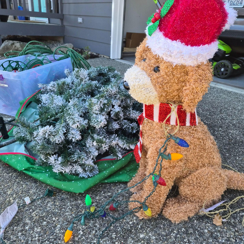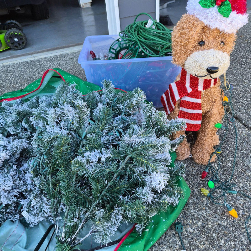 A charming holiday trio ready to bring instant cheer to any space. This lot includes a 6‑foot artificial flocked Christmas tree, beautifully dusted with snowy texture, featuring a built-in metal base and designed to break down easily for storage in its included nylon tote bag. Also included is a plastic storage tote filled with holiday lights, neatly organized on plastic reels to keep strands tangle‑free and ready for decorating. Completing the set is an irresistibly cute holiday dog décor piece, wrapped in a playful string of lights—perfect for porches, entryways, or indoor holiday displays. A delightful, ready‑to‑use bundle for anyone looking to expand or refresh their seasonal décor.