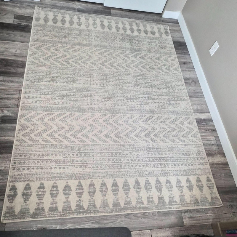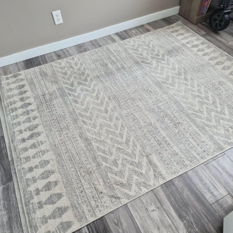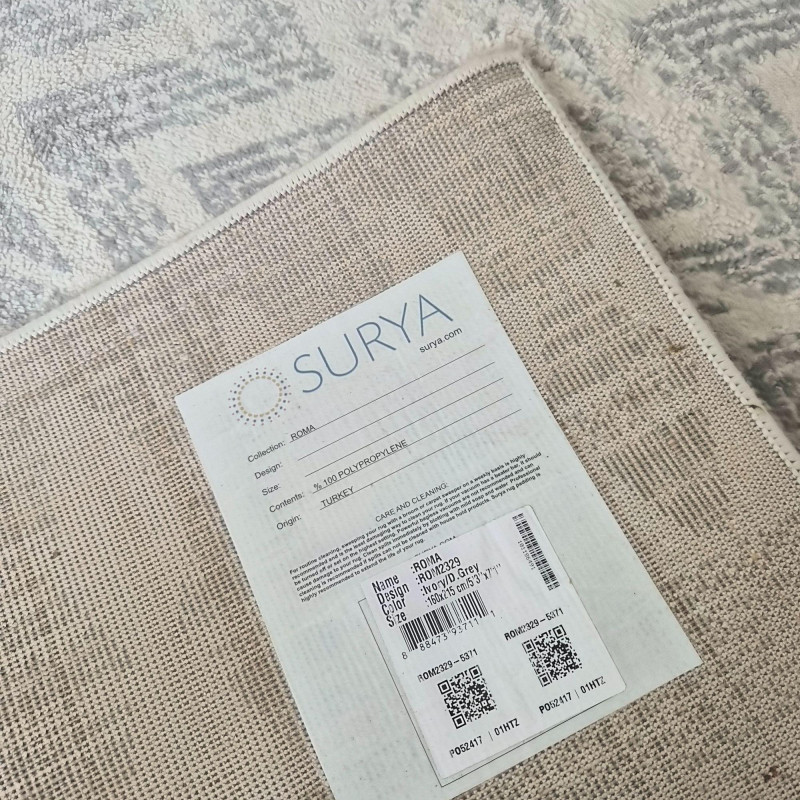 A soft, neutral 5' × 7' Surya Turkish‑style area rug in an ivory and grey palette, featuring a repeating geometric pattern that adds subtle movement and warmth to any room. Its versatile size works well in living rooms, bedrooms, offices, or layered under accent furniture. This rug matches the larger Surya area rug listed, making it ideal for creating a coordinated look across adjoining spaces.