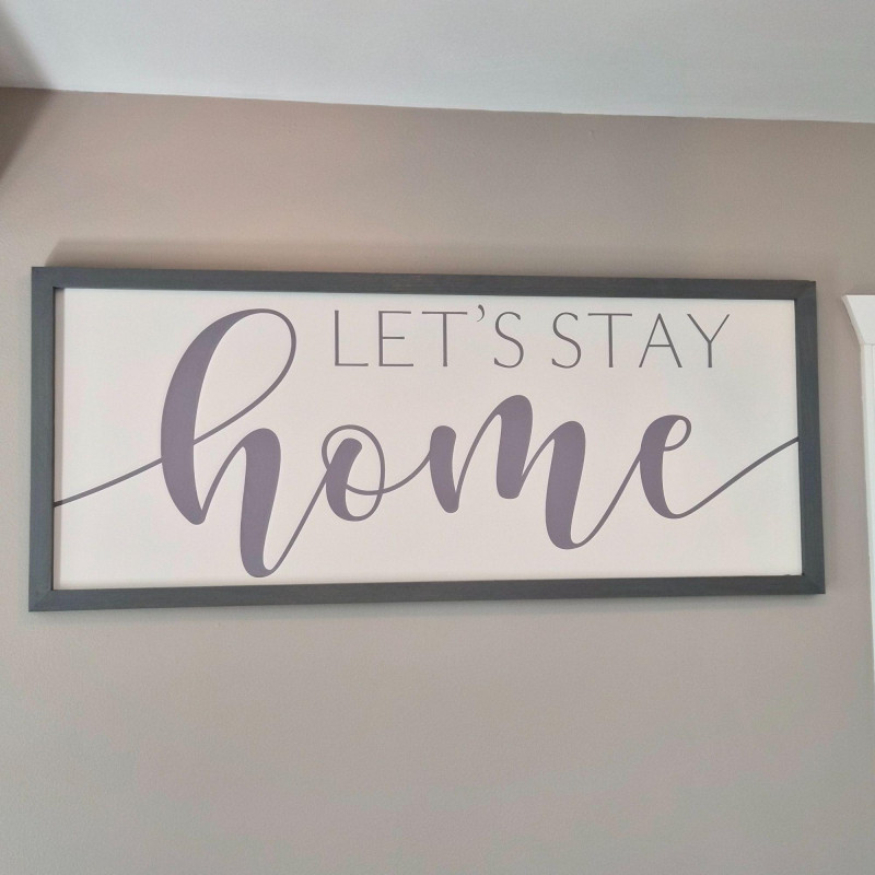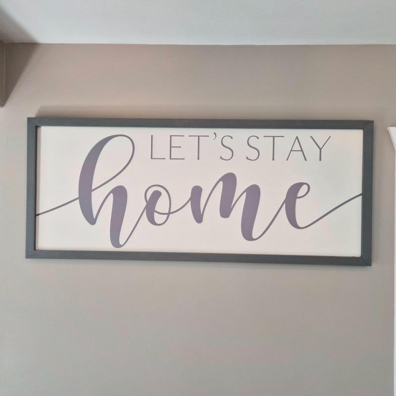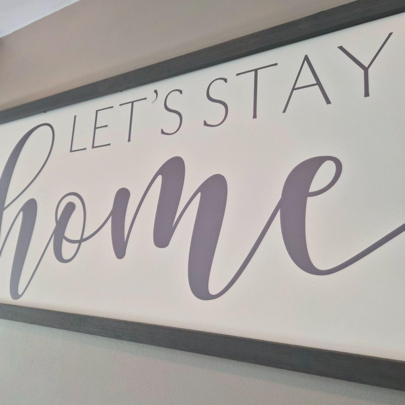 A warm and inviting “Let’s Stay Home” framed wall décor piece featuring soft neutral colors and a clean, modern farmhouse aesthetic. The crisp white background and mixed‑font typography create a calm, welcoming presence, while the wood frame adds natural texture and contrast. At 38" × 20", it’s an ideal size for entryways, living rooms, bedrooms, or any cozy corner that benefits from a touch of homey charm. Its neutral palette blends effortlessly with modern, rustic, cottage, and transitional décor styles. A simple, heartfelt statement piece that instantly softens a space.
