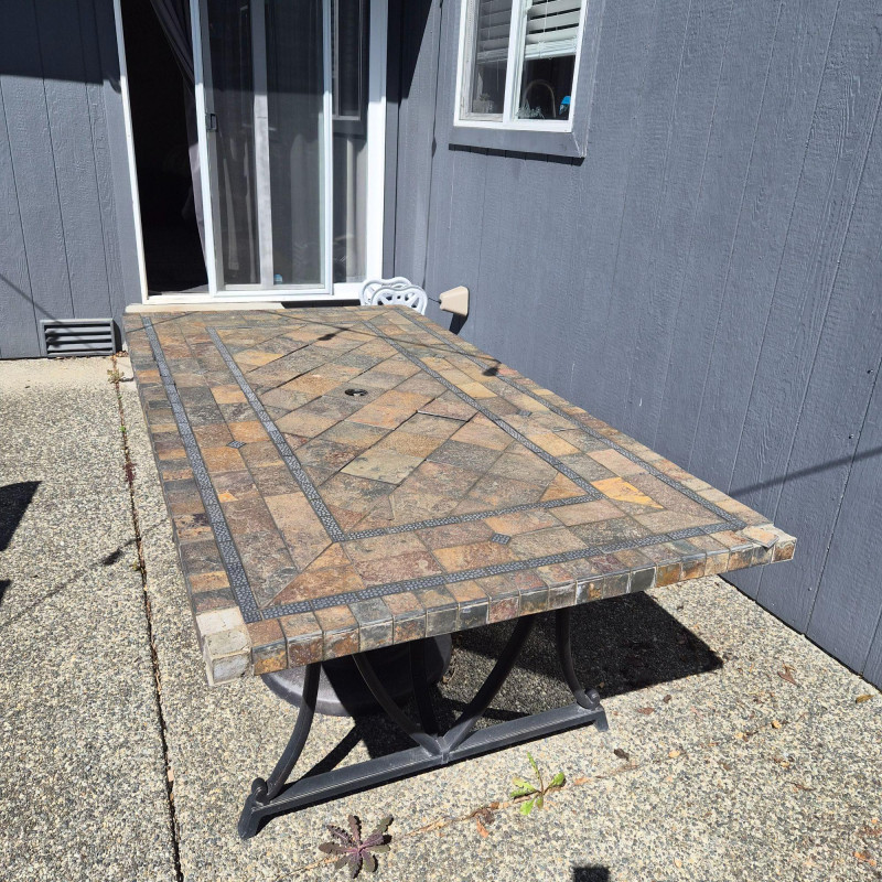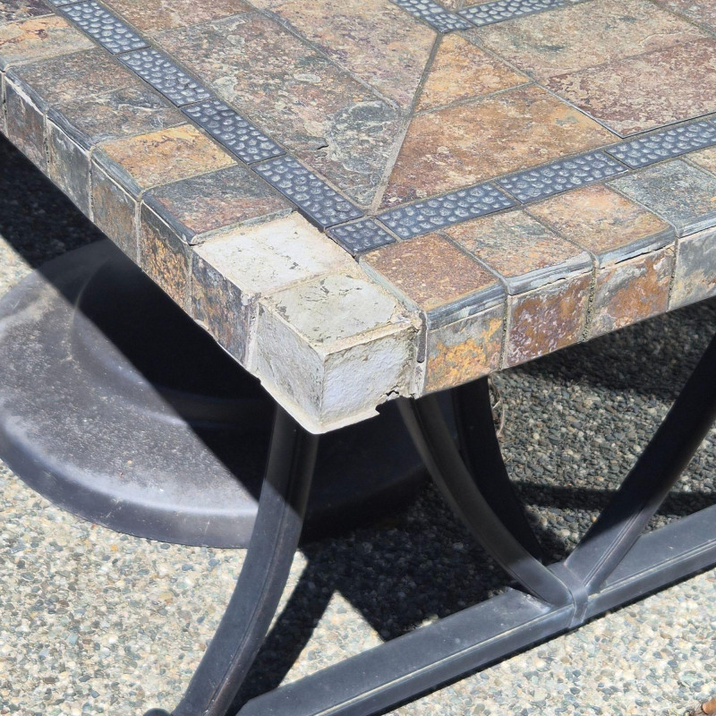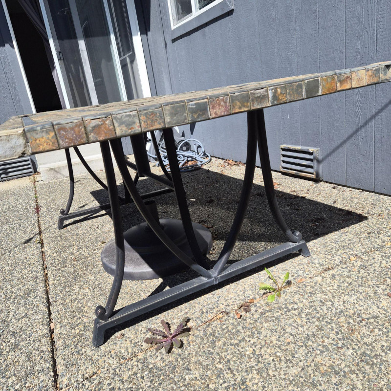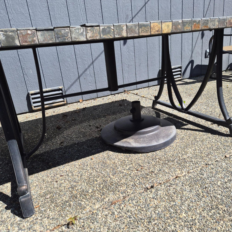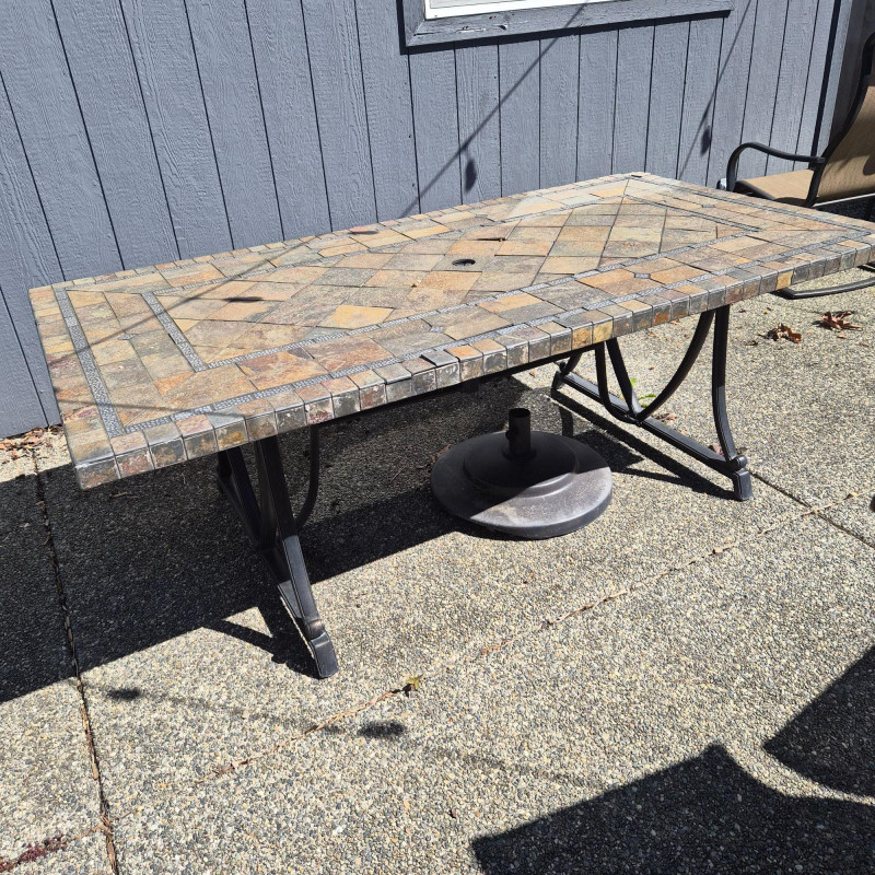 A handsome and substantial iron patio table featuring a richly patterned tile‑top surface—a mix of warm earth tones arranged in a geometric mosaic that brings texture and visual interest to any outdoor space. The table includes a center umbrella hole, perfect for adding shade during long afternoons and evening gatherings. The elegantly sculpted iron base is both sturdy and stylish, with graceful lines that complement the weight and presence of the tile top. Please note: several tiles are in need of repair or replacement (see photos), but the table remains structurally solid and full of decorative potential. A great piece for patios, decks, or garden seating areas—ready for use as‑is or ideal for a simple tile refresh. Due to the size and weight of this item, placing a bid confirms your agreement to arrive with two or more able-bodied helpers, an appropriately sized vehicle (please review measurements), and any necessary moving equipment such as a dolly or hand truck. Failure to arrive prepared may result in forfeiture of the item without refund. Please note: there will be no staff on-site to assist with moving or loading.