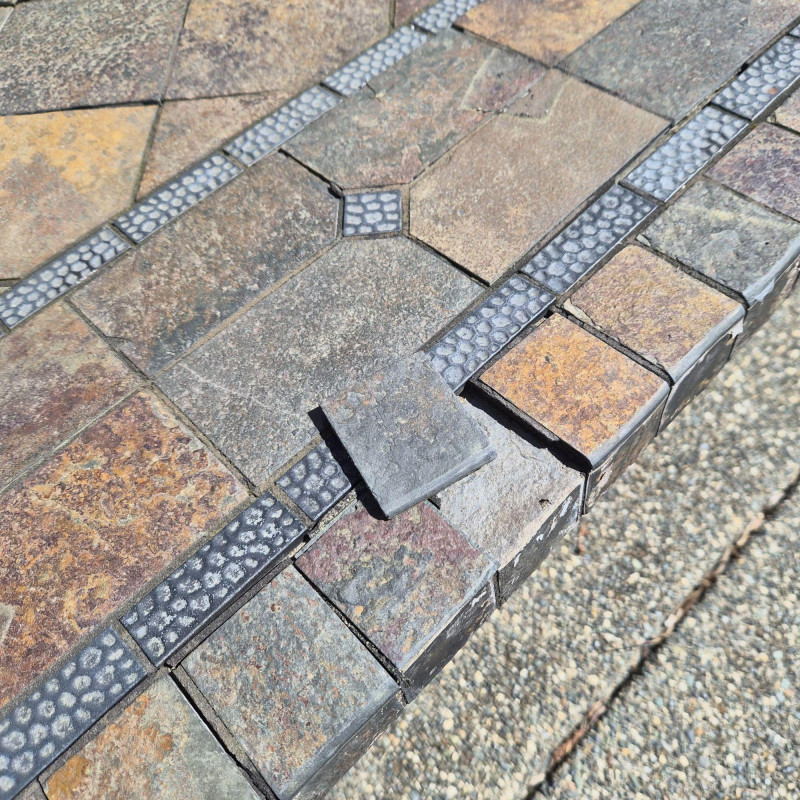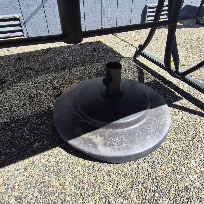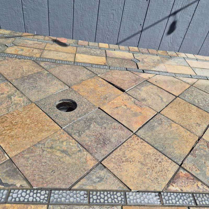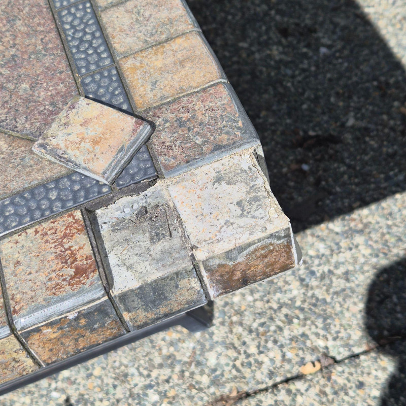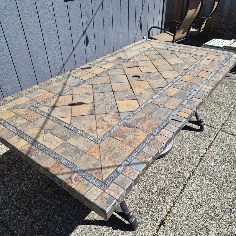 A handsome and substantial iron patio table featuring a richly patterned tile‑top surface—a mix of warm earth tones arranged in a geometric mosaic that brings texture and visual interest to any outdoor space. The table includes a center umbrella hole, perfect for adding shade during long afternoons and evening gatherings. The elegantly sculpted iron base is both sturdy and stylish, with graceful lines that complement the weight and presence of the tile top. Please note: several tiles are in need of repair or replacement (see photos), but the table remains structurally solid and full of decorative potential. A great piece for patios, decks, or garden seating areas—ready for use as‑is or ideal for a simple tile refresh. Due to the size and weight of this item, placing a bid confirms your agreement to arrive with two or more able-bodied helpers, an appropriately sized vehicle (please review measurements), and any necessary moving equipment such as a dolly or hand truck. Failure to arrive prepared may result in forfeiture of the item without refund. Please note: there will be no staff on-site to assist with moving or loading.