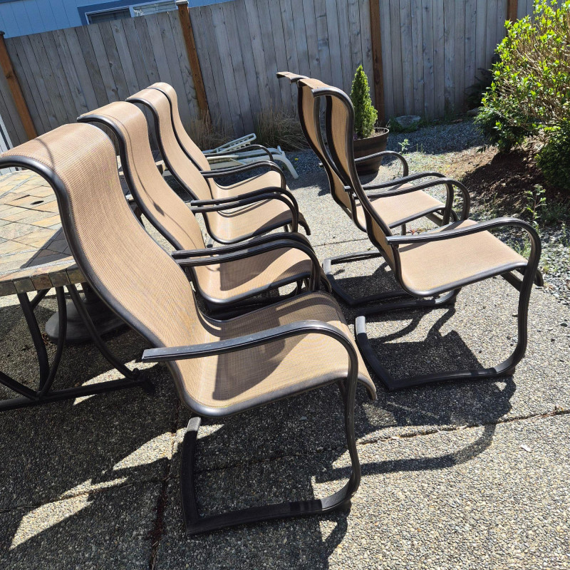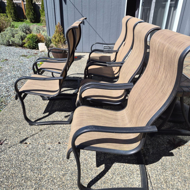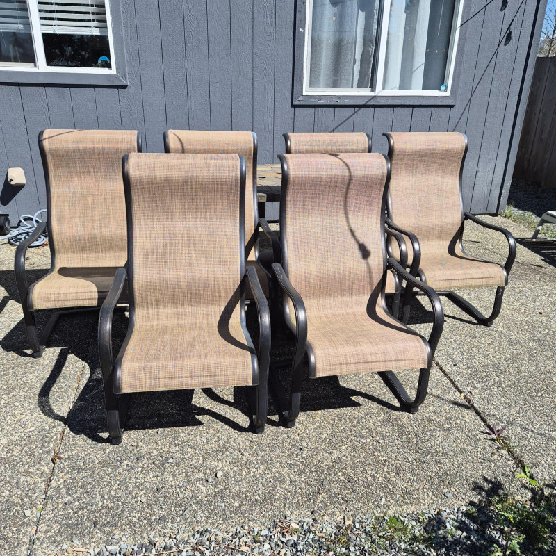 A clean, cohesive set of six aluminum patio chairs featuring tan mesh backs and seats designed for breathable comfort and long‑lasting outdoor use. The frames have a smooth, gently curved silhouette, including a subtly arched backrest that supports hours of relaxed lounging on the patio, deck, or around a fire pit. Lightweight yet sturdy, these chairs are easy to move, arrange, and store, making them a versatile choice for gatherings, everyday outdoor dining, or expanding your seating area with a matching, neutral-toned set.
