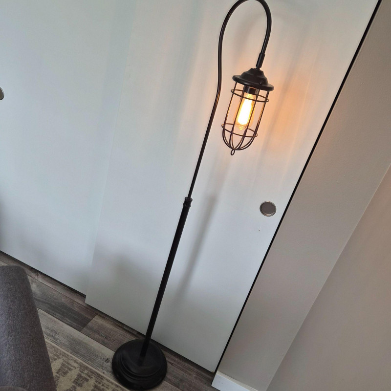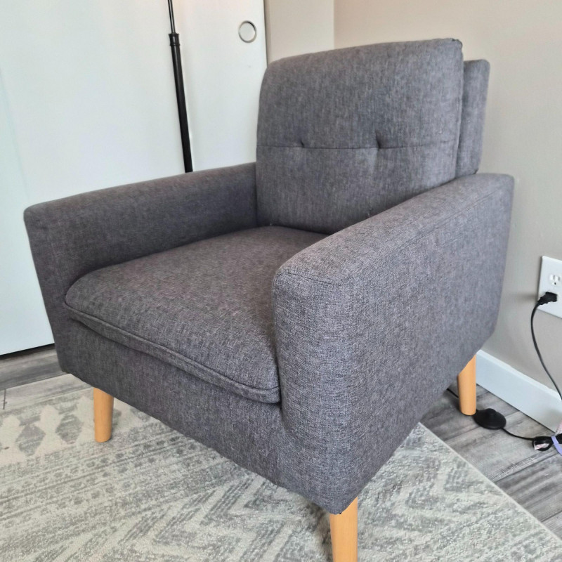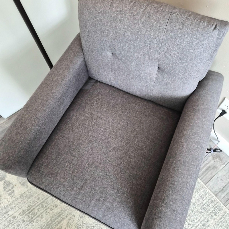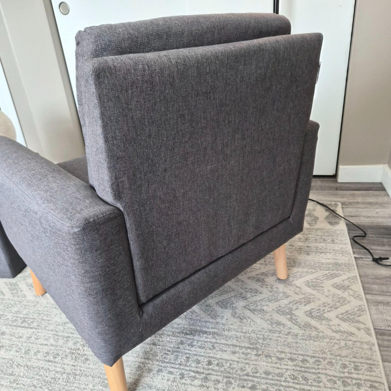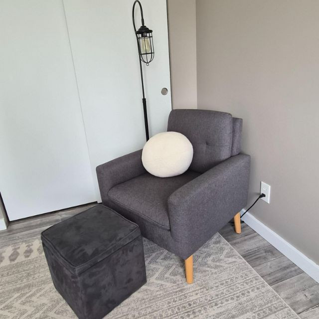 A complete, ready‑to‑enjoy reading nook set featuring a Giantex grey fabric chair with light wood legs, paired with a grey microfiber storage cube ottoman measuring 15" × 15"—perfect for storage of books, or small items and accessories. A soft accent pillow adds comfort and texture, while the 62" shepherd’s hook floor lamp provides warm, focused lighting ideal for reading or relaxing. The neutral palette and clean lines make this set an easy fit for modern, minimalist, or Scandinavian‑inspired spaces. A turnkey cozy corner for any room.