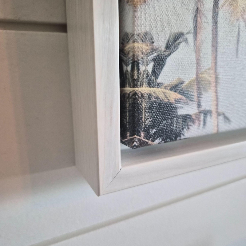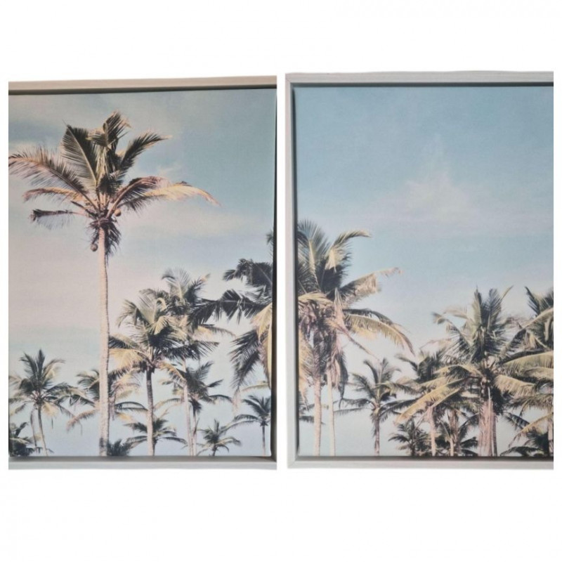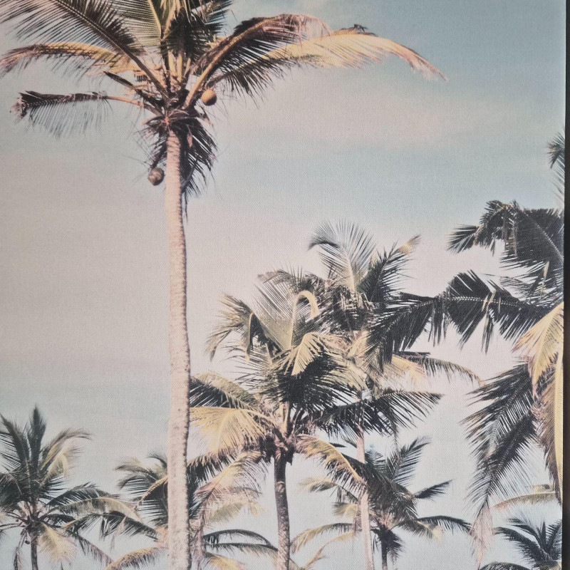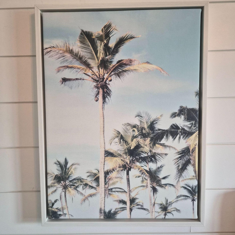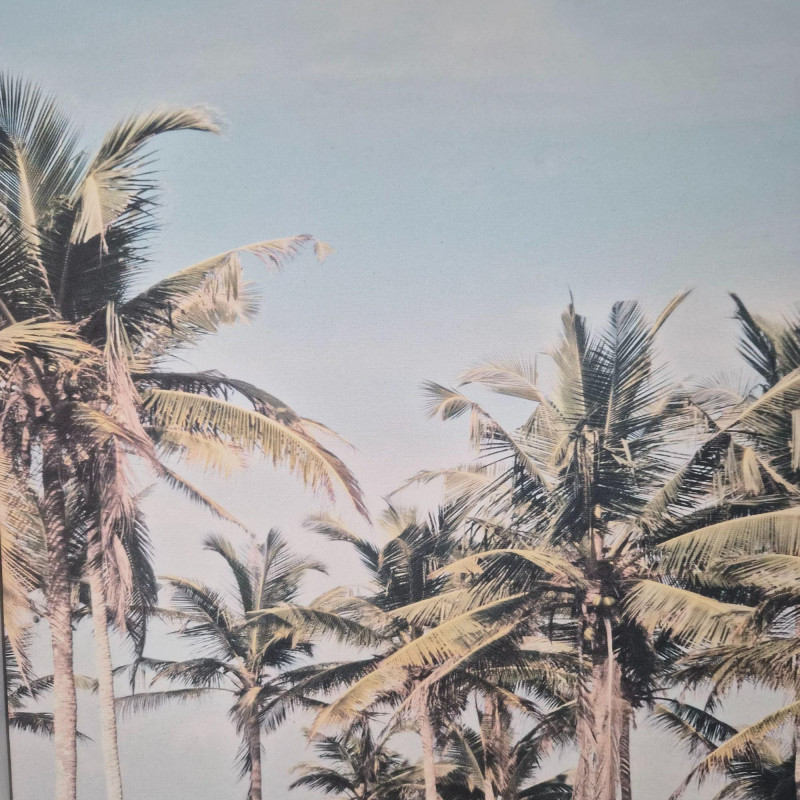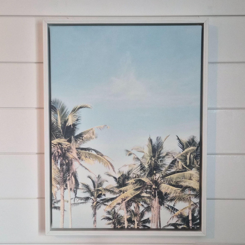 A calming set of light framed palm tree canvas prints, each measuring 18" × 24", featuring tall, sun‑lit palms against soft, pastel skies. The pair creates a cohesive, airy coastal feel—perfect for brightening bedrooms, living rooms, hallways, or any space that leans beachy, boho, or modern‑minimalist. Their gentle color palette and relaxed tropical imagery make them easy to style and endlessly versatile.