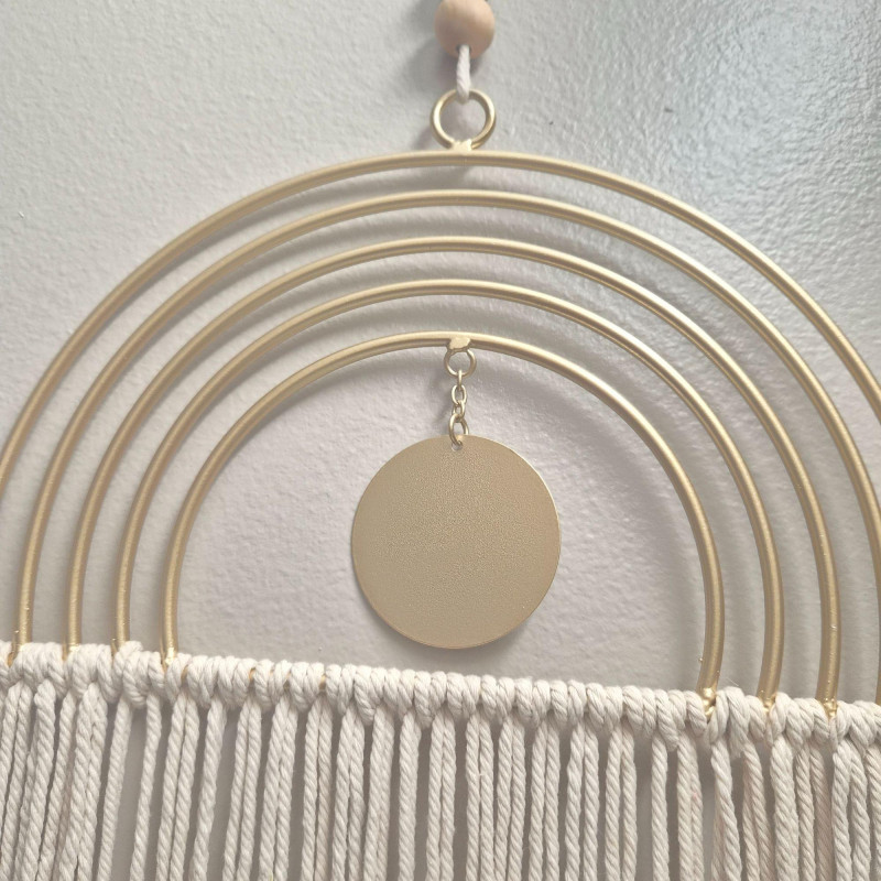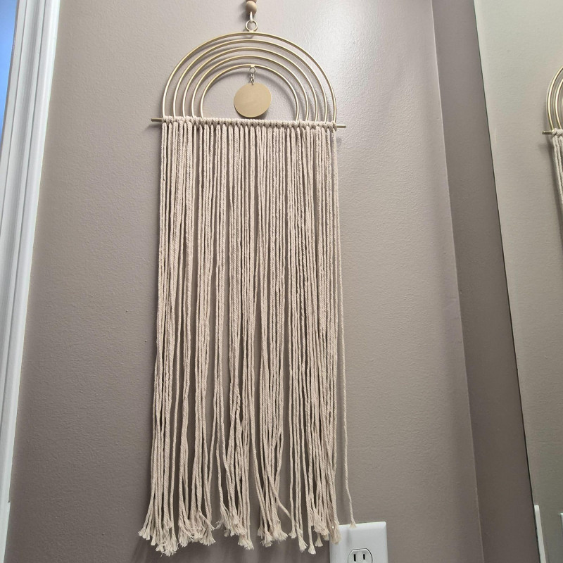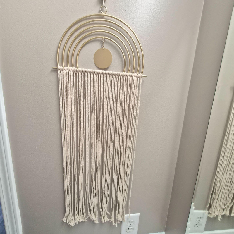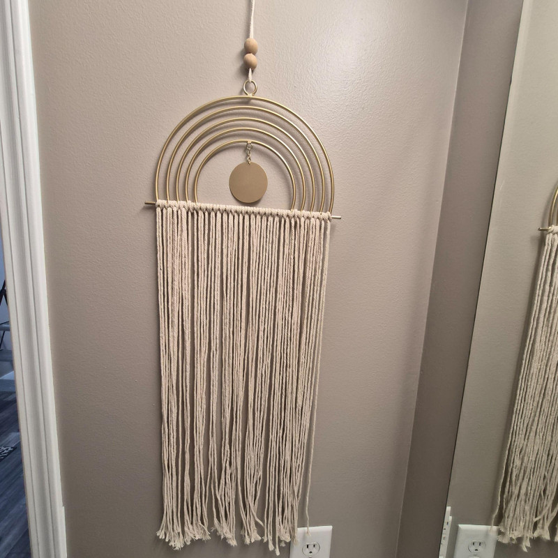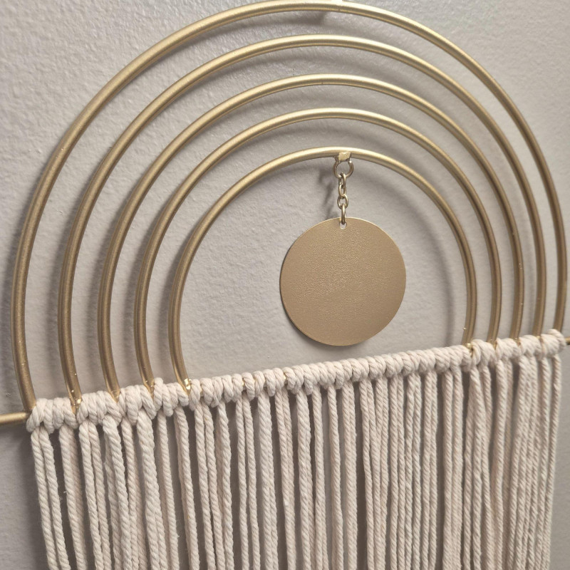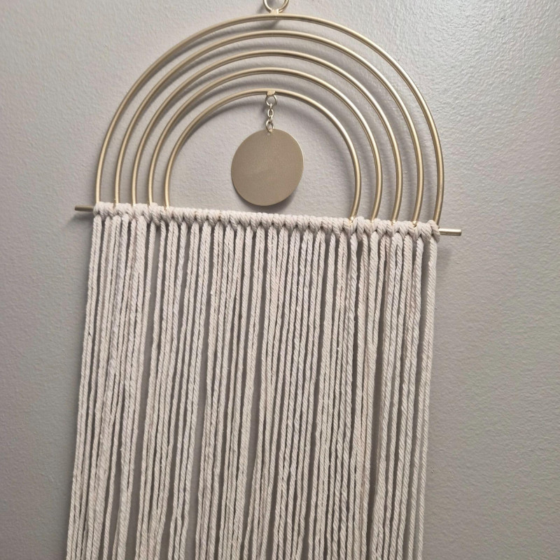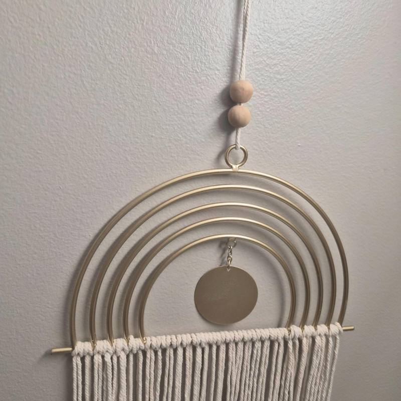 A serene twist‑string wall décor piece featuring cascading cream strands suspended from a sculptural metal rainbow frame with a small sun medallion accent at the center. Measuring 32" long × 12" wide, it blends soft textile texture with clean geometric metalwork, creating a modern boho look that suits bedrooms, nurseries, entryways, or any calming corner. The neutral palette and airy silhouette make it an easy styling piece—light, warm, and quietly artistic.