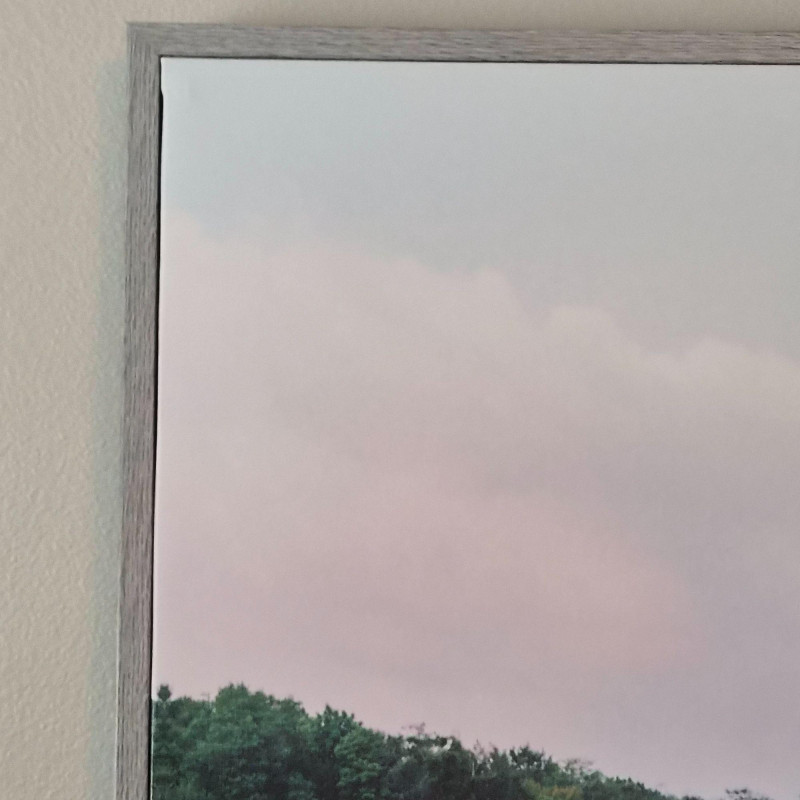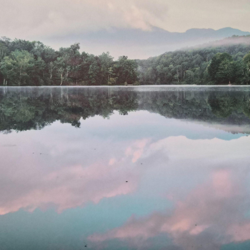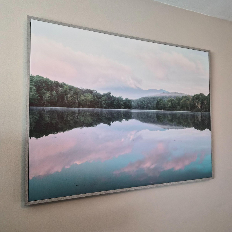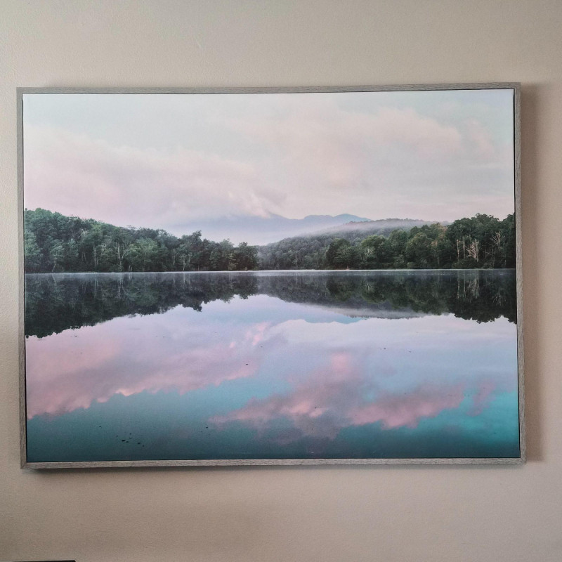 A calming 41" × 31" landscape canvas print capturing a glass‑still lake mirroring the trees, sky, and soft pastel clouds above. The perfectly symmetrical reflection creates a peaceful, meditative composition, while the gentle greens, blues, and blush tones bring a sense of quiet balance to any room. Framed in a clean, modern style, this piece is ideal for bedrooms, living rooms, offices, or any space that benefits from a soothing, nature‑inspired focal point.
