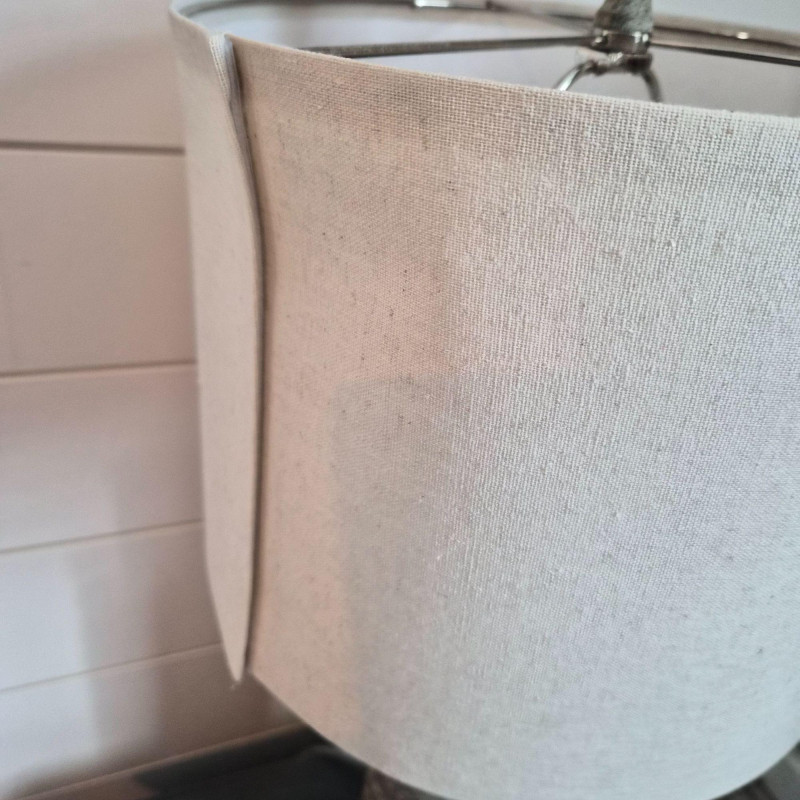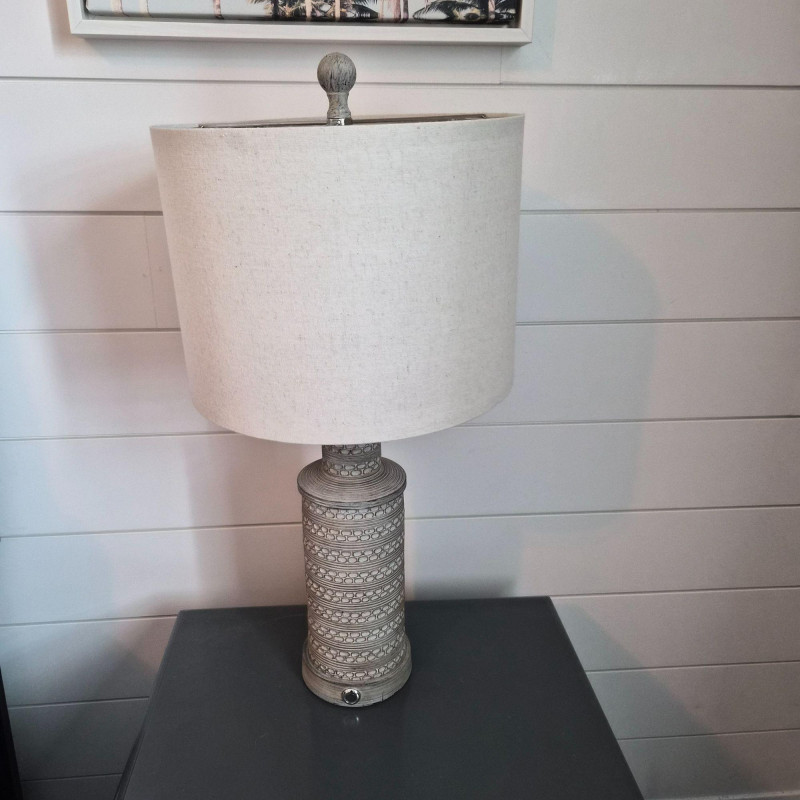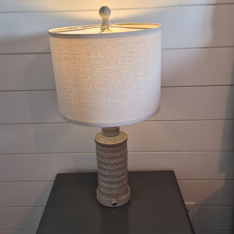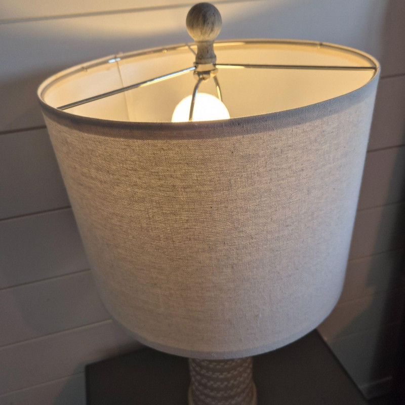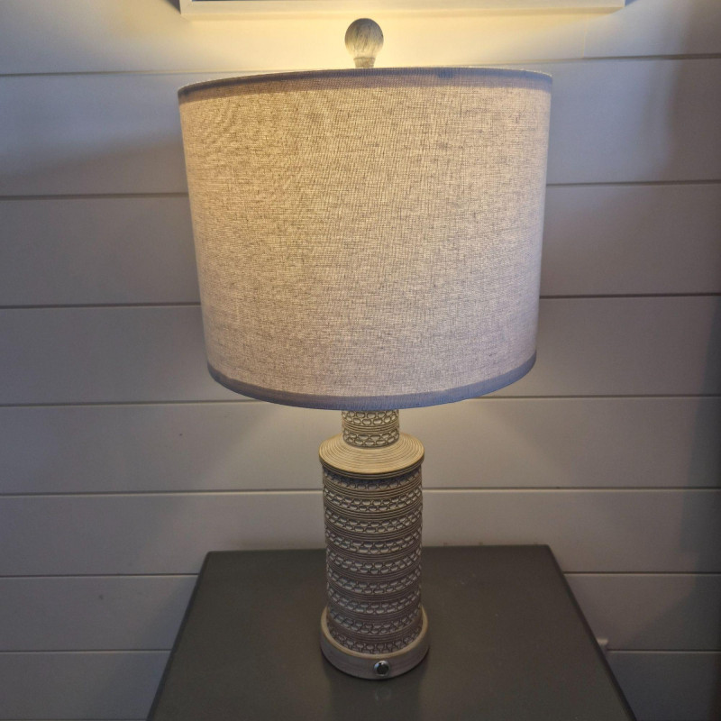 A matching pair of ribbed resin table lamps in a vase‑style silhouette, each topped with a canvas drum shade for soft, even light. These lamps feature three‑way dimmable touch controls, making it easy to switch between low, medium, and bright settings with a tap. A stylish and functional pair—perfect for bedrooms, living rooms, or home offices.