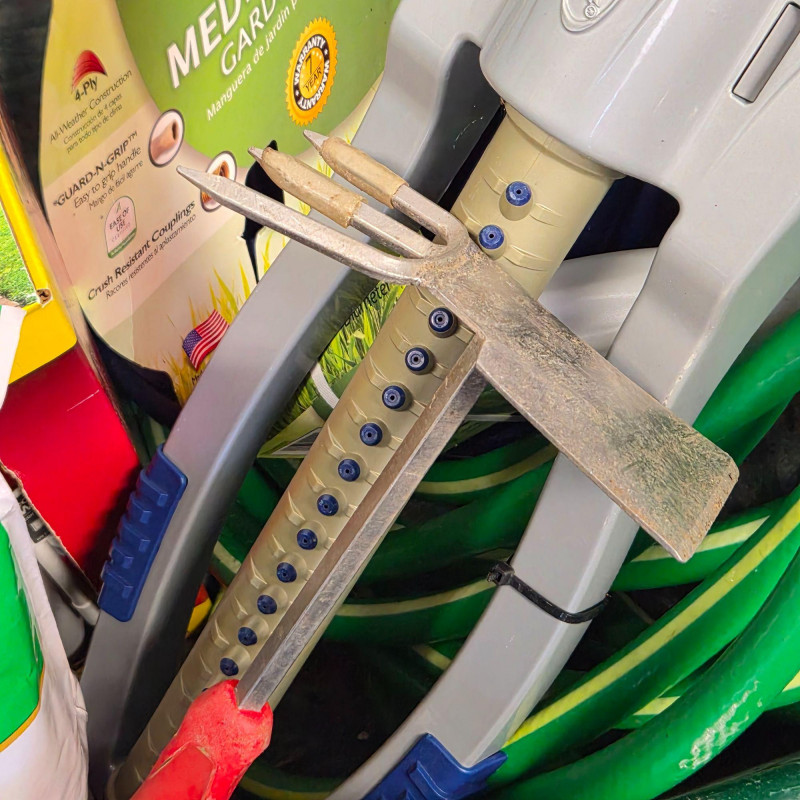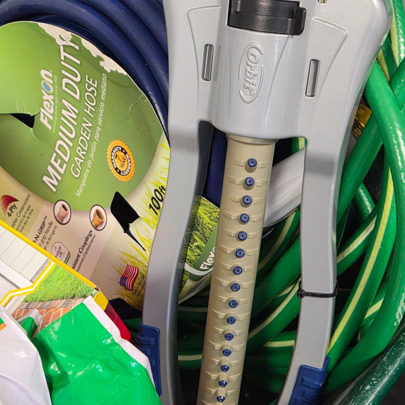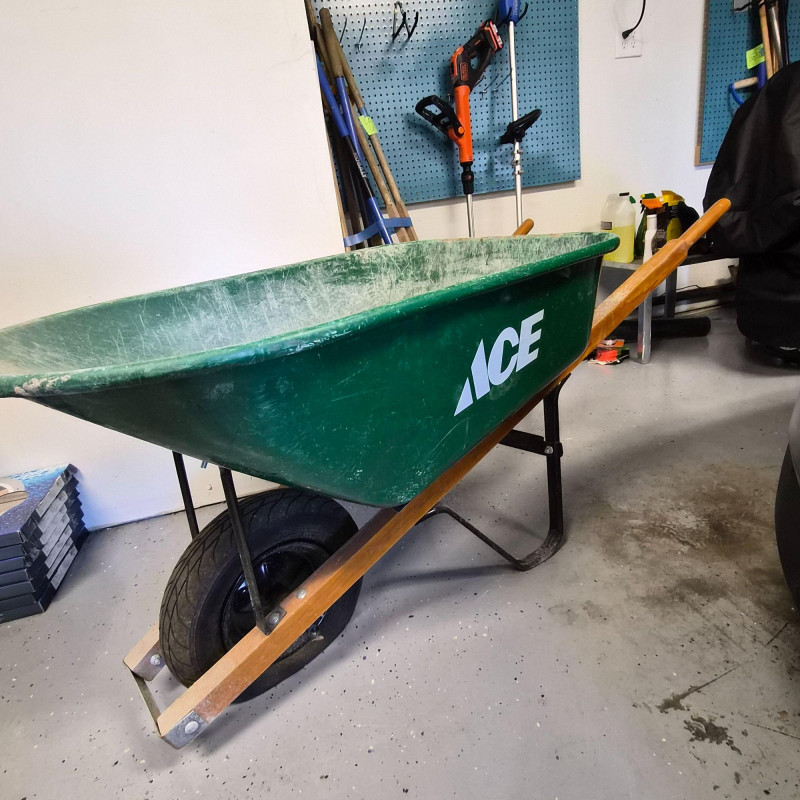 A practical, ready‑to‑use lawn and garden care bundle centered around a metal & wood handles Ace wheelbarrow (tire needs inflation) loaded with essential supplies for spring and summer yard work. Included in the lot are garden hoses, a sprinkler, Scotts Turf Builder lawn food, potting soil, small grey resin pot, and additional lawn‑care accessories—everything you need for feeding, planting, watering, and general outdoor upkeep. A great all‑in‑one assortment for homeowners, gardeners, or anyone looking to stock up on reliable yard‑care basics in one convenient lot.