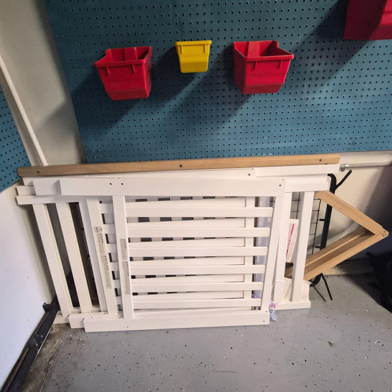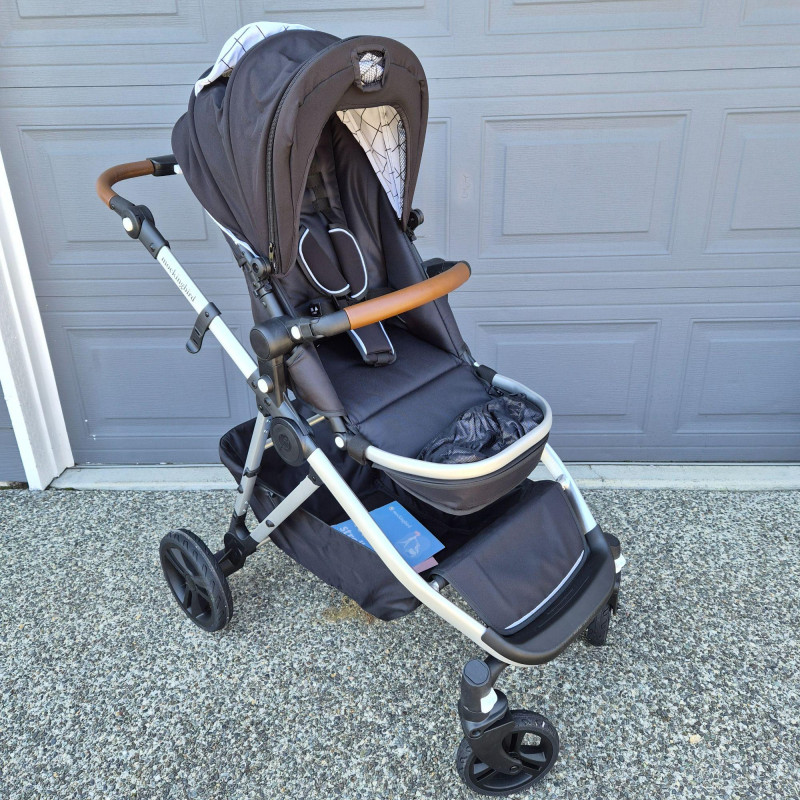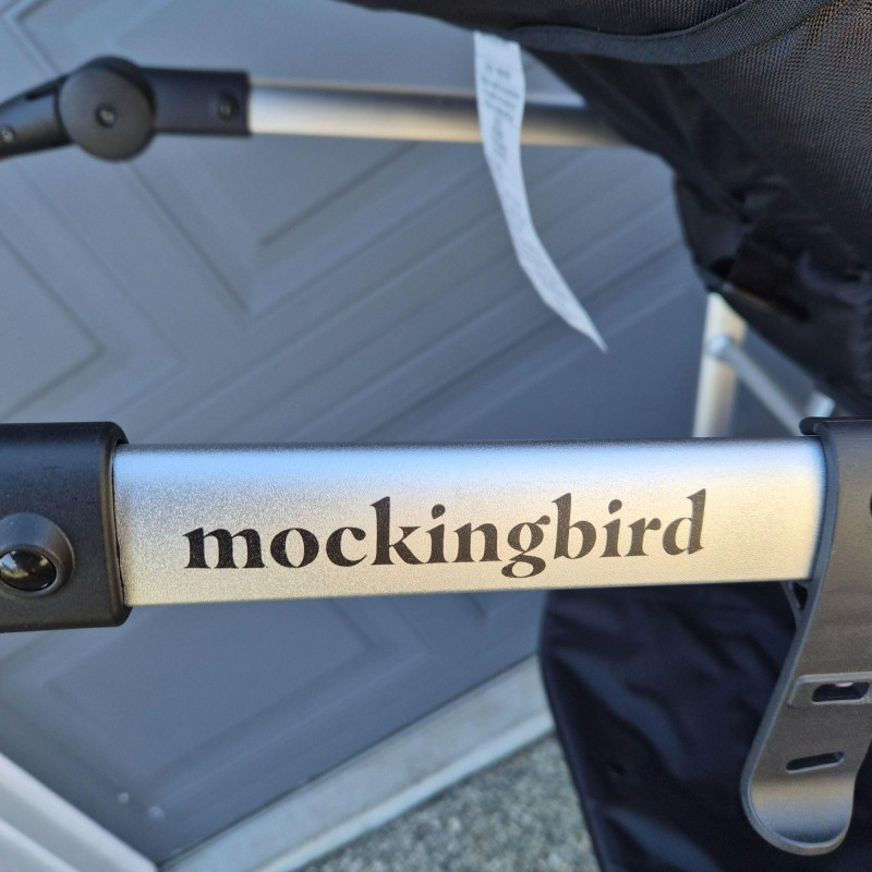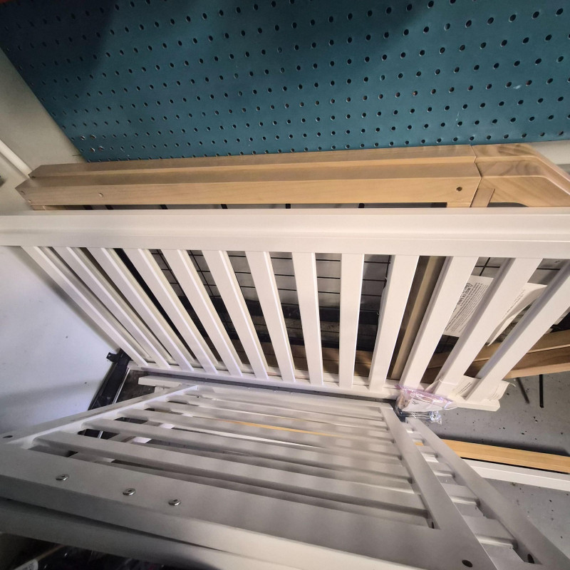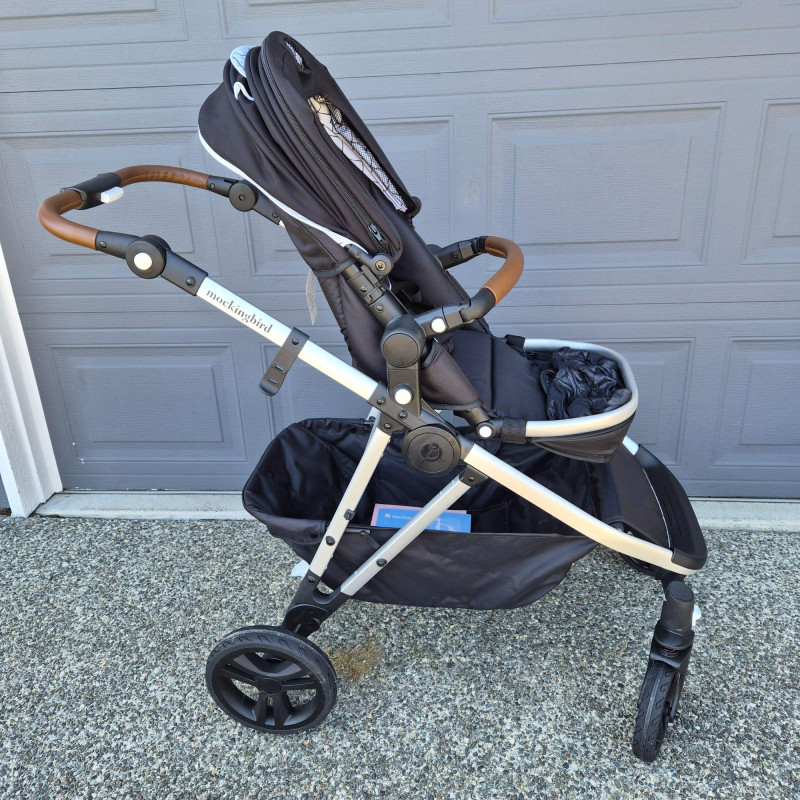 A premium, modern Mockingbird single‑to‑double stroller, brand‑new and unused, offering multiple seating configurations and smooth maneuverability. Features include a sleek frame, adjustable seating positions, generous storage, and Mockingbird’s well‑known modular design that grows with your family. User's manual to get you started. Also included is an unused, unassembled white crib with a charming house‑shaped wood top, perfect for creating a cozy, design‑forward nursery. All visible hardware and components appear to be present. No mattress included. A fantastic bundle for new parents or anyone preparing a stylish, functional nursery and stroller setup.