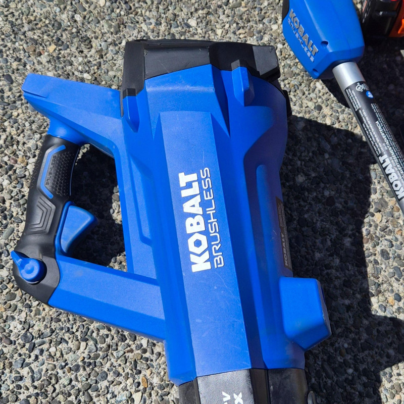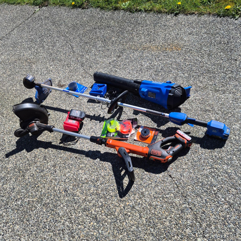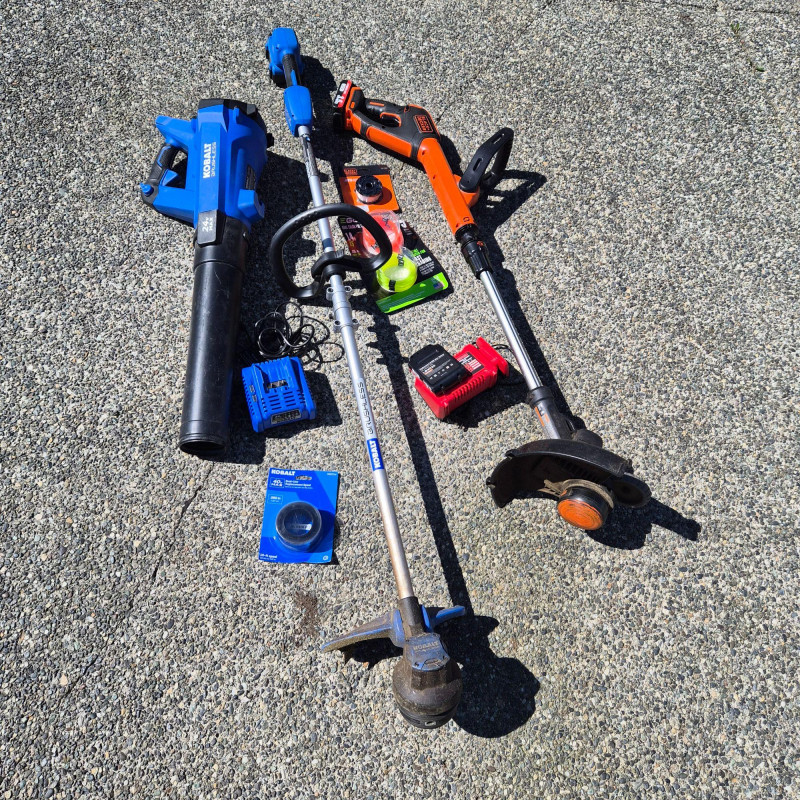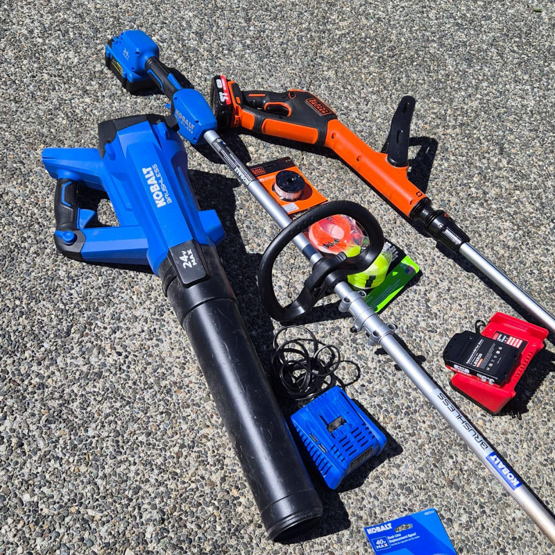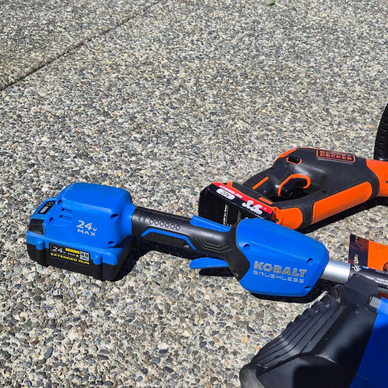 A handy cordless yard‑care bundle featuring a Kobalt battery‑powered leaf blower along with both Kobalt and Black+Decker string trimmers/weeders. This set includes charging stations and extra trimmer line, giving you everything you need for quick lawn touch‑ups, edging, and debris clearing. Lightweight, easy to maneuver, and perfect for homeowners who want simple, grab‑and‑go electric tools for routine yard maintenance.