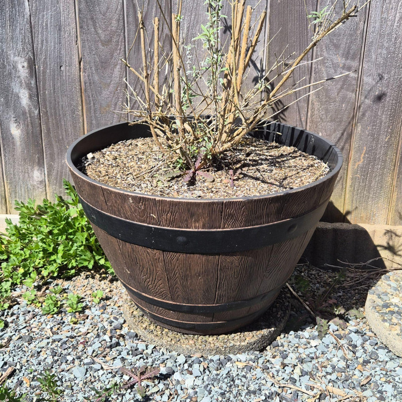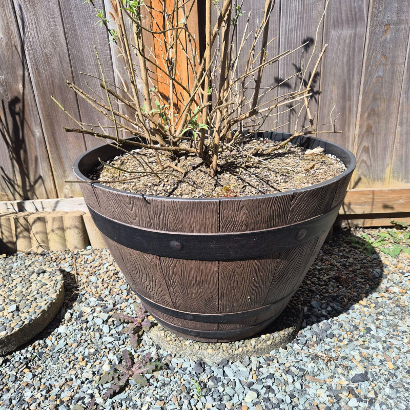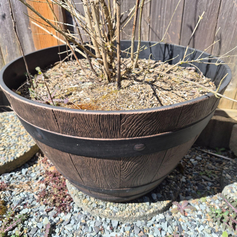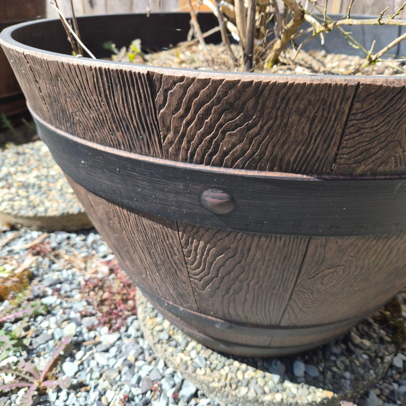 A beautiful, ready‑to‑place garden set featuring four matching resin barrel‑look outdoor pots, each styled with a rich wood‑grain finish and classic banded detail. These lightweight yet durable planters capture the rustic appeal of real half‑barrels without the weight or maintenance. Each pot measures approximately 22 inches wide and 15 inches tall, offering generous planting space and strong visual presence on patios, porches, walkways, or garden beds. All four planters come already planted with Butterfly Bushes, adding instant pollinator‑friendly appeal as they grow and bloom (currently not in bloom). A cohesive, nature‑loving set perfect for creating symmetry, framing an entryway, or enhancing outdoor living spaces with effortless charm.