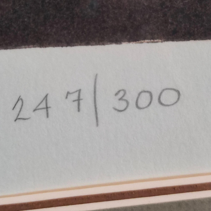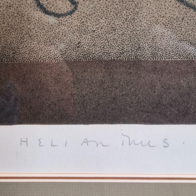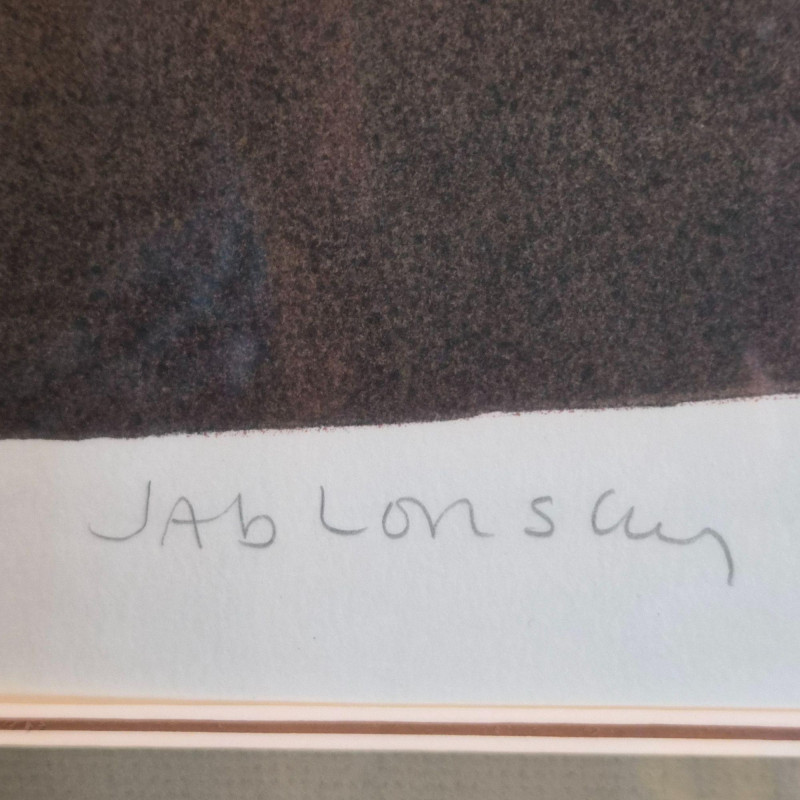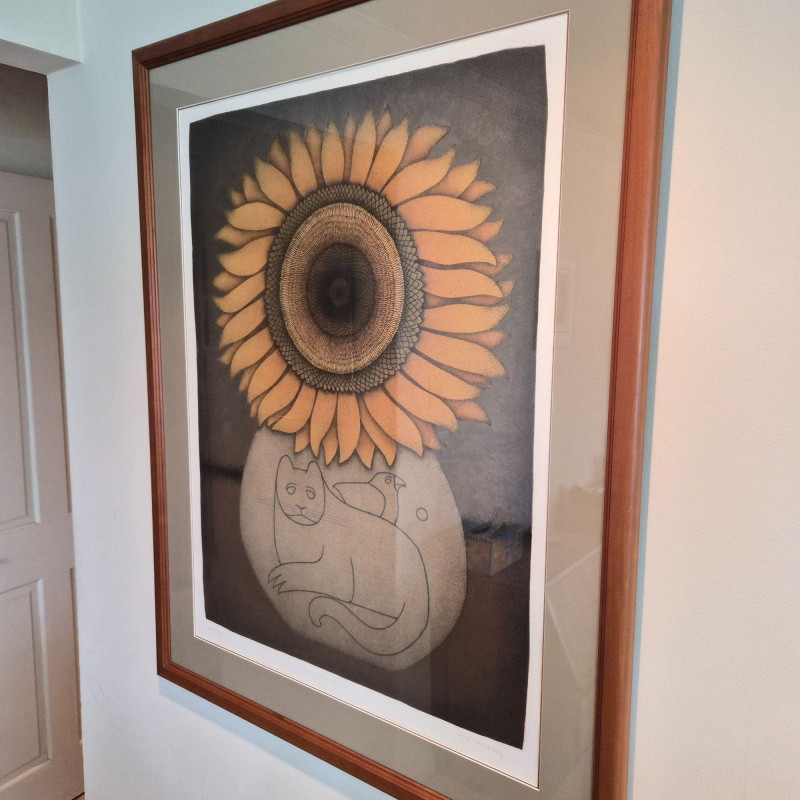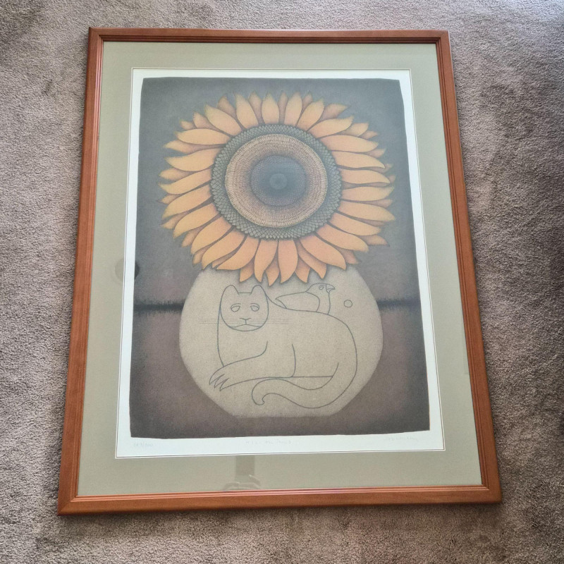 A charming and whimsical limited-edition serigraph print by celebrated artist Carol Jablonsky, titled Helian Thus. This piece features Jablonsky’s signature blend of bold botanical detail and playful line art: a radiant sunflower rising above a minimalist cat and bird motif, all rendered with her unmistakable warmth and humor. This print is artist‑signed and hand‑numbered 247/300, part of a scarce limited edition series. Presented in a classic wood frame, it measures 33" long x 43" tall, offering an impressive presence on the wall. A wonderful addition for collectors of Jablonsky’s work or anyone who loves art with personality and gentle storytelling.