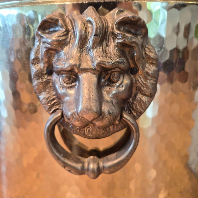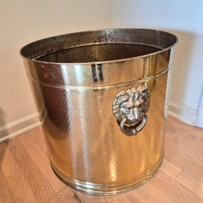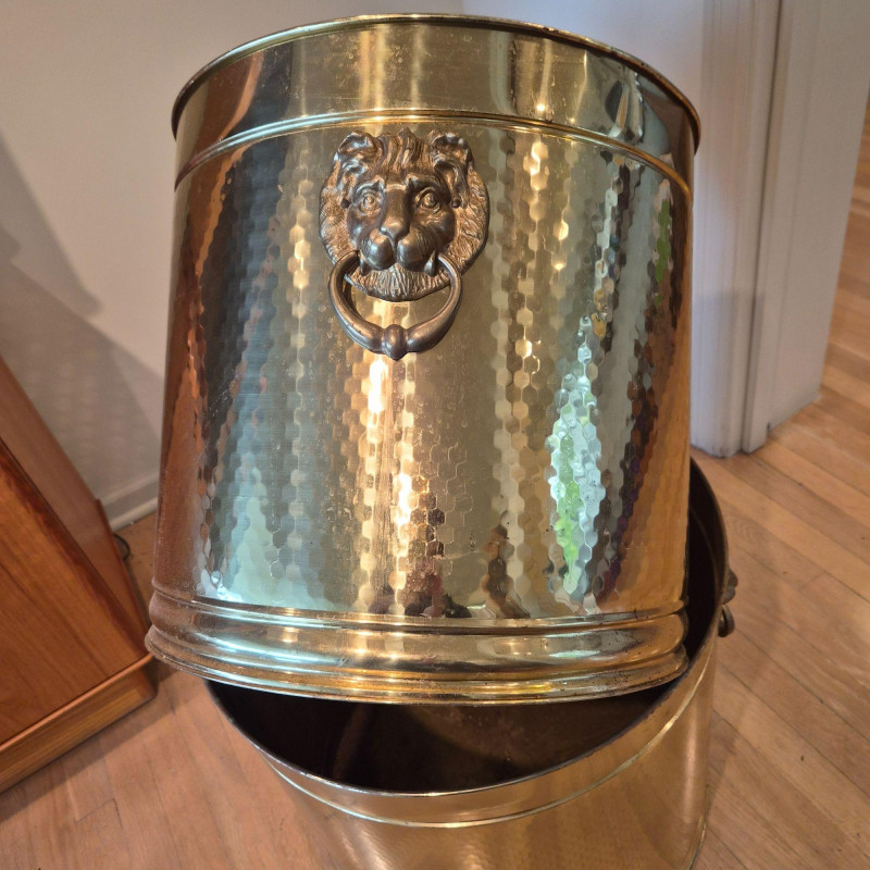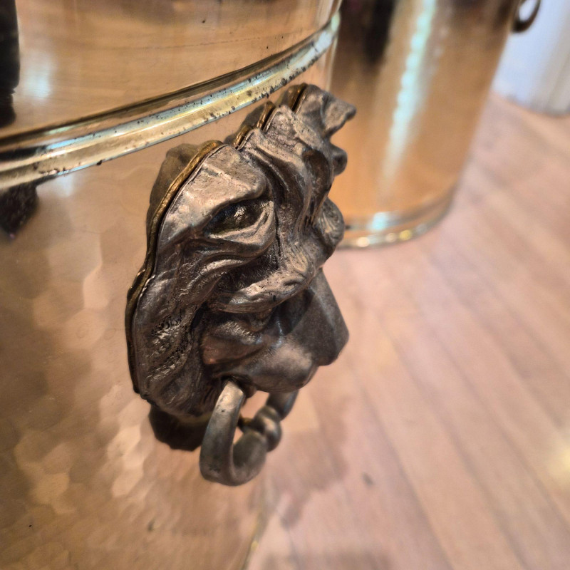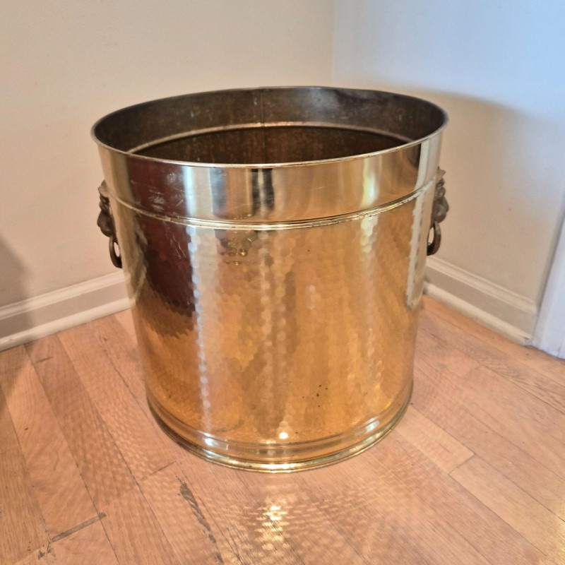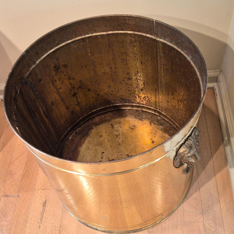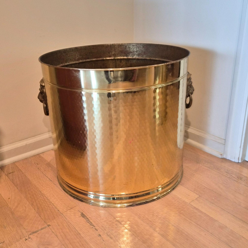 A striking pair of oversized solid brass pots by Bristol Brass & Copper Inc., each featuring a classic hammered texture and bold lion‑knocker–style ring handles. These substantial vessels nest neatly together and make an impressive statement piece for hearth, entryway, or garden décor. Both pots retain their original lacquered exterior finish, helping preserve their shine and reducing the need for polishing. Beautifully crafted, weighty, and full of old‑world character, this duo offers both decorative impact and functional versatility.