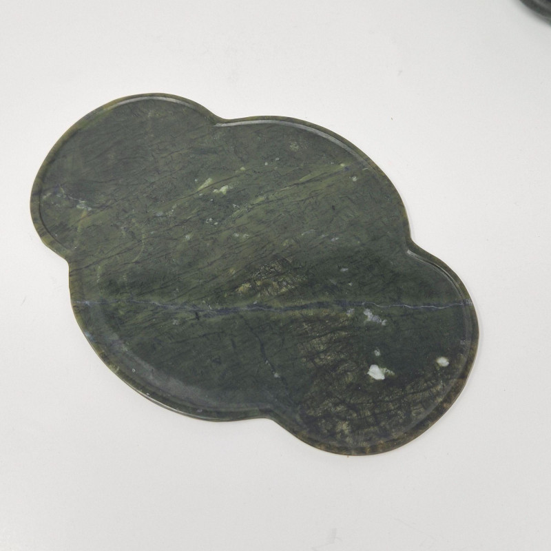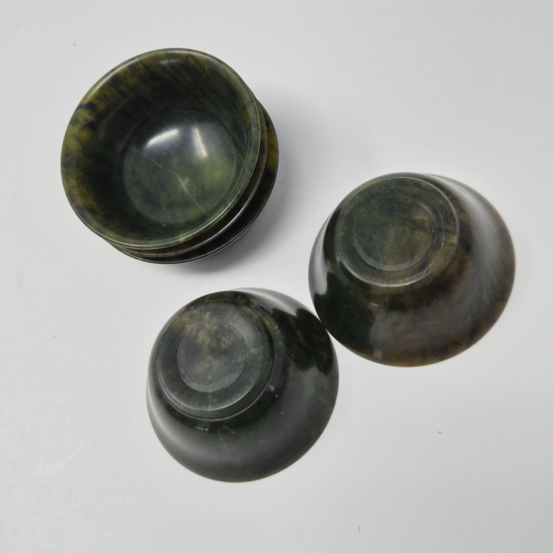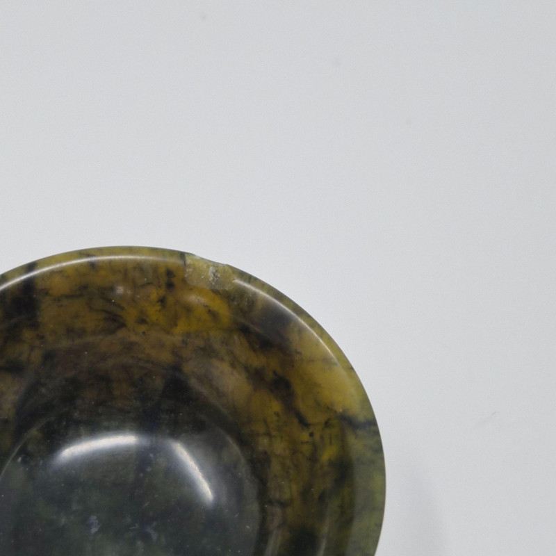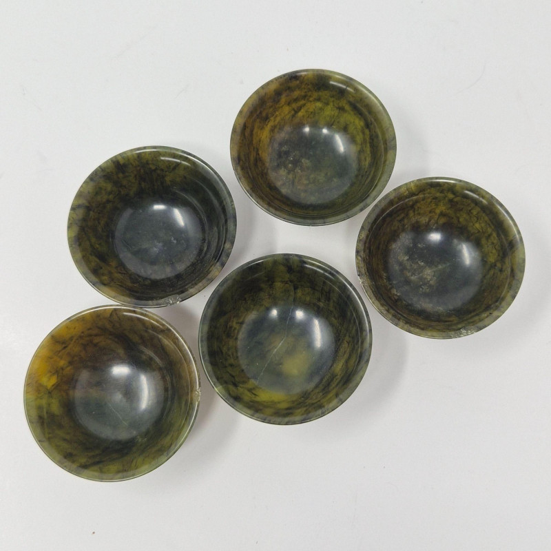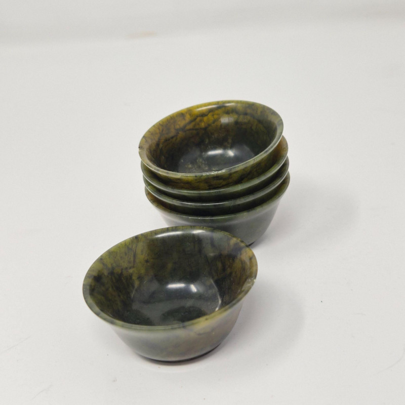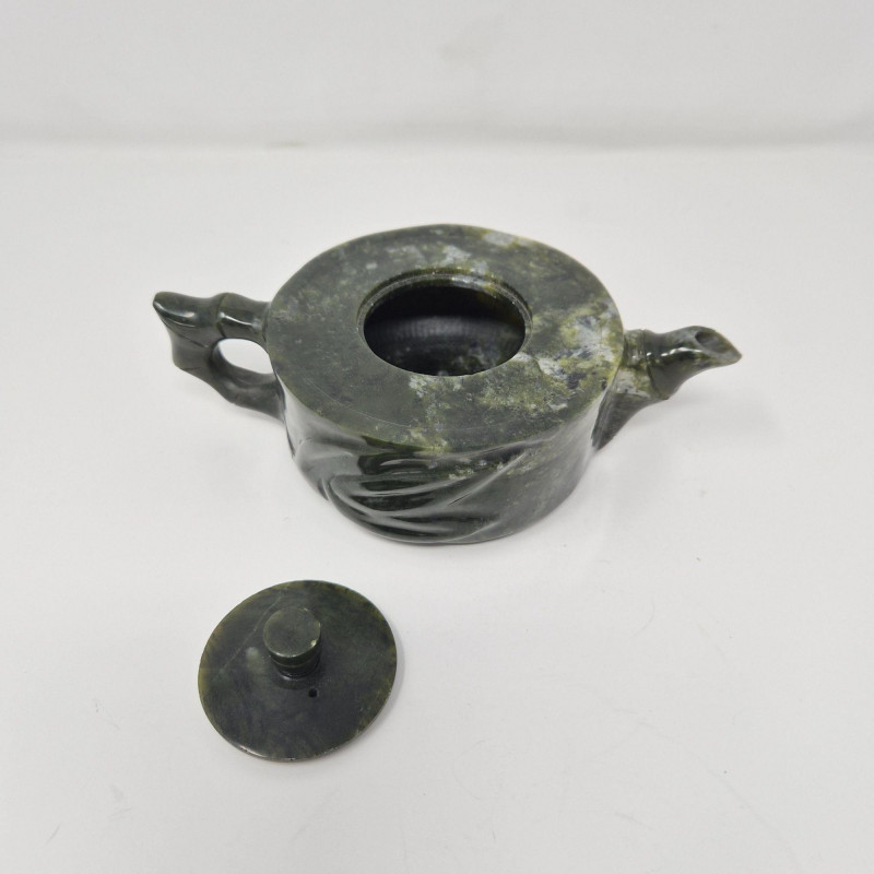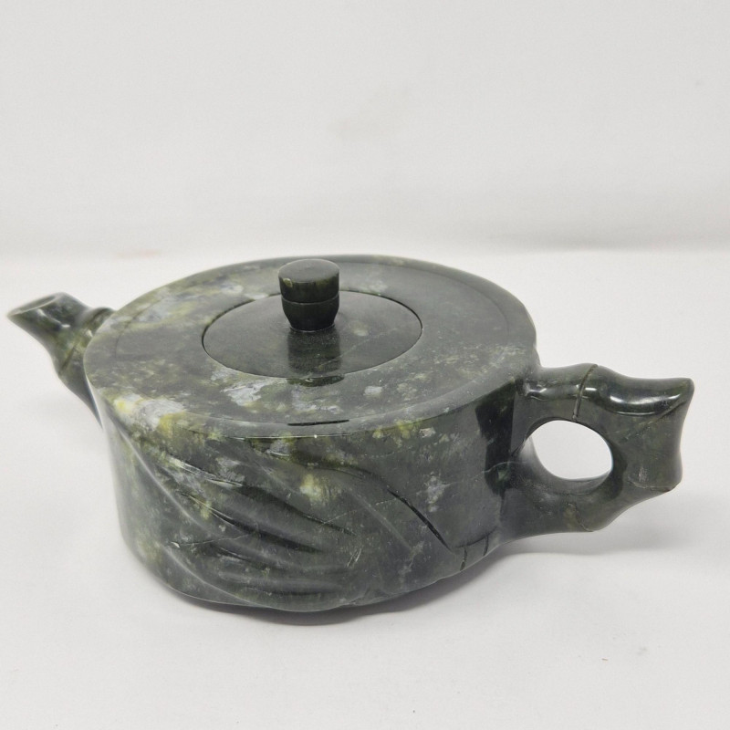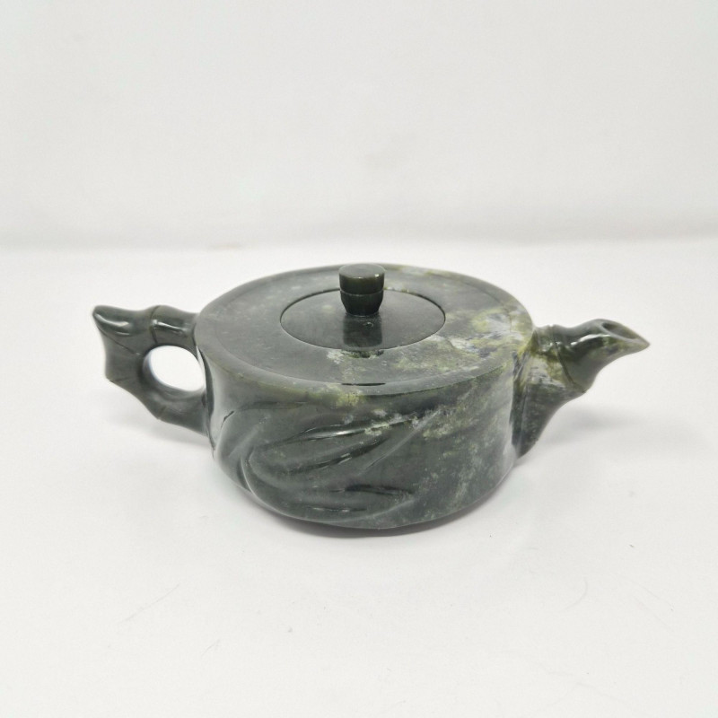 A beautifully carved late‑20th‑century jade mini tea set, featuring a sculptural teapot, five small cups, and a matching tray. The set is crafted from richly variegated green stone with natural tonal shifts that highlight the hand‑finished artistry typical of decorative jade pieces produced around the 1980s. The teapot includes an integrated handle and a stylized spout, while the cups and tray echo the smooth, polished finish. A lovely display set for collectors of Asian stonework, tea culture décor, or carved mineral objects. Measurements: A compact, elegant jade set with vintage charm and artisan character.