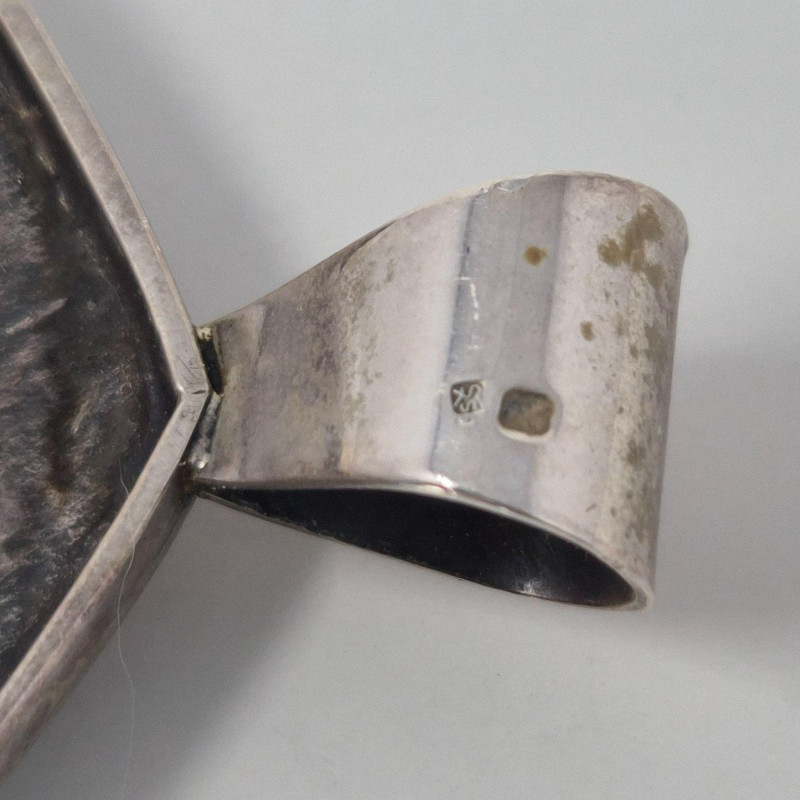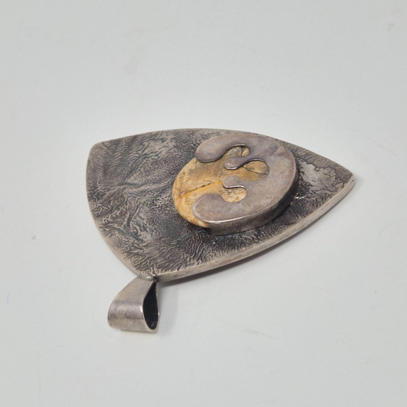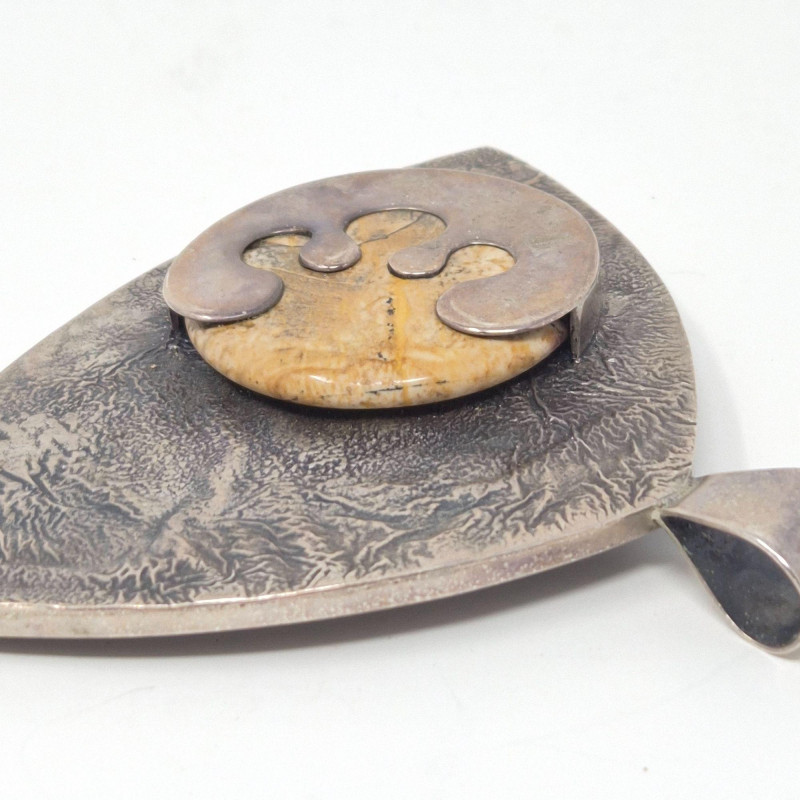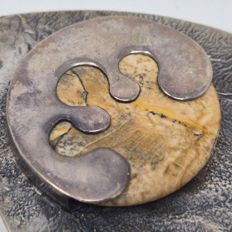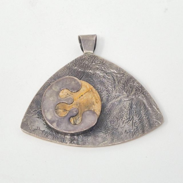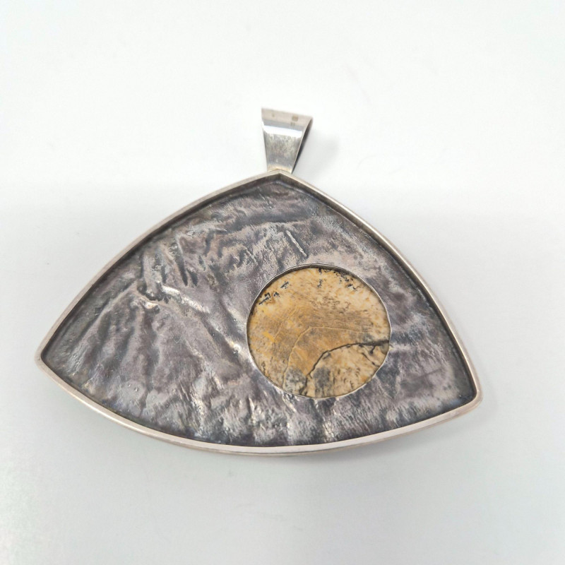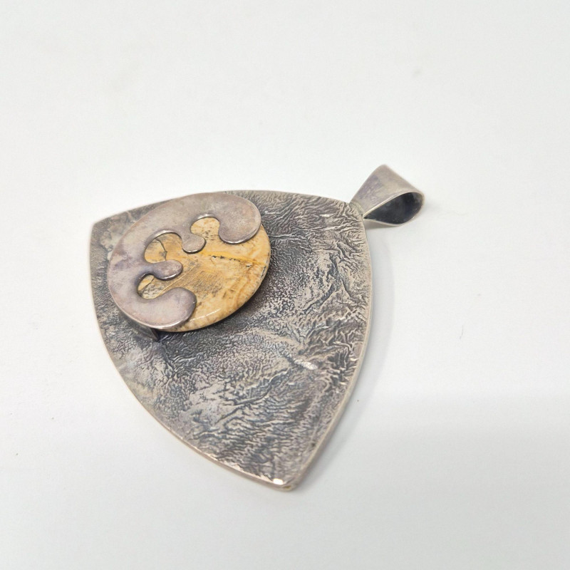 A striking one‑of‑a‑kind modernist pendant featuring a bold textured triangular base paired with an organic, sculptural stone centerpiece. The circular stone element is set in an abstract cut‑out design that gives the piece movement and depth, balancing geometric form with natural material. The bale is marked “SS,” suggesting sterling silver, and the pendant has the weight and hand‑finished character of artisan studio work. Measures approximately 3" x 2.5", making it a substantial statement piece for a chain or cord. Large bale to accommodate a variety of chain sizes. A distinctive wearable artwork for lovers of mid‑century modern, brutalist, or studio‑crafted jewelry.
