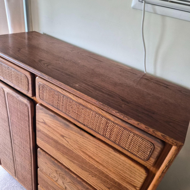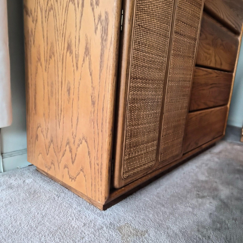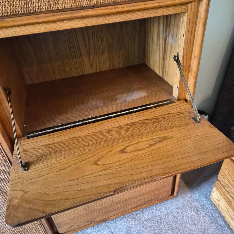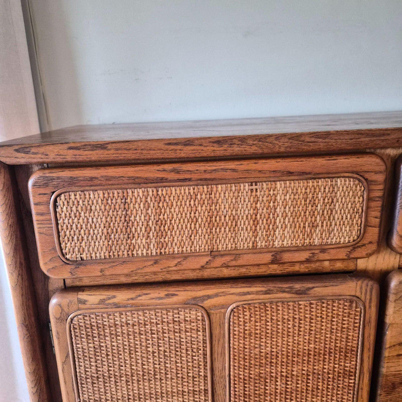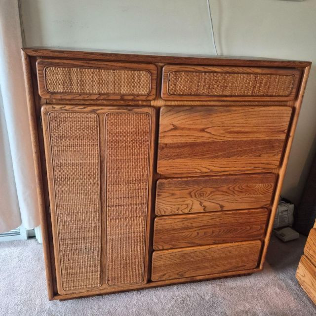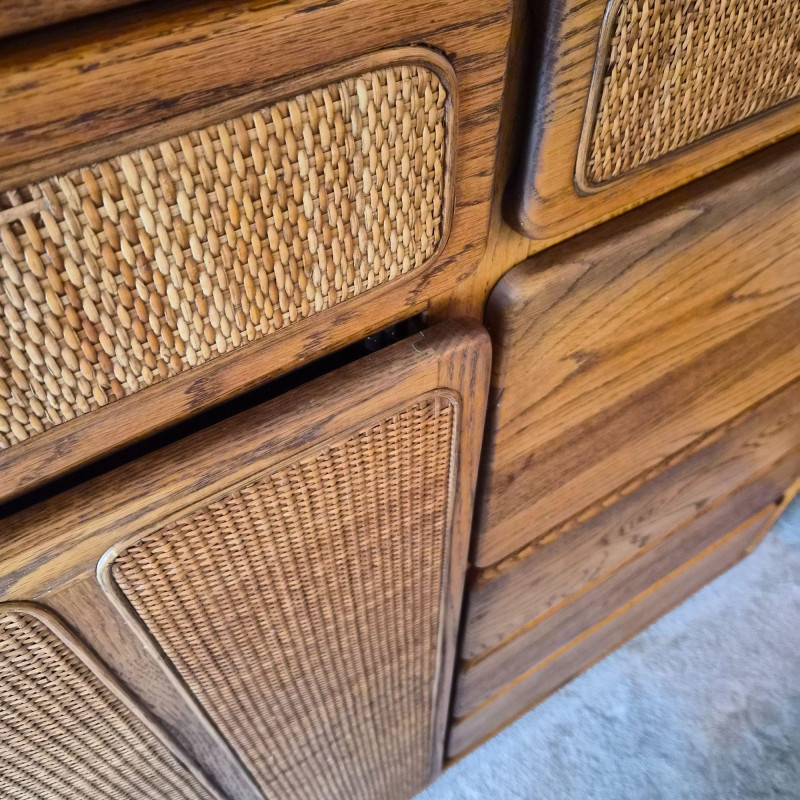 A standout Lane Furniture highboy dresser from the 1980s post‑modern era, celebrated for its mix of warm, natural textures and clean architectural lines. This model showcases solid oak construction paired with woven cane fronts, a signature combination from Lane’s late‑20th‑century design language. The upper section features two cane‑front drawers above a pull‑down door that opens into a compact writing desk — a clever multifunctional detail popular in 1980s bedroom and office‑hybrid furniture. On the left, a tall cabinet door opens to reveal three interior shelves, ideal for folded clothing or accessories. The right side includes three drawers - smooth wood fronts and visible grain. Due to the size and weight of this item, placing a bid confirms your agreement to arrive with two or more able-bodied helpers, an appropriately sized vehicle (please review measurements), and any necessary moving equipment such as a dolly or hand truck. Failure to arrive prepared may result in forfeiture of the item without refund. Please note: there will be no staff on-site to assist with moving or loading.