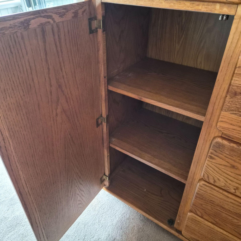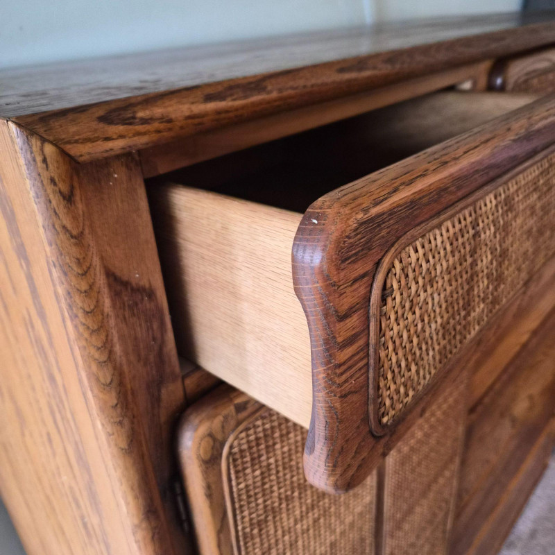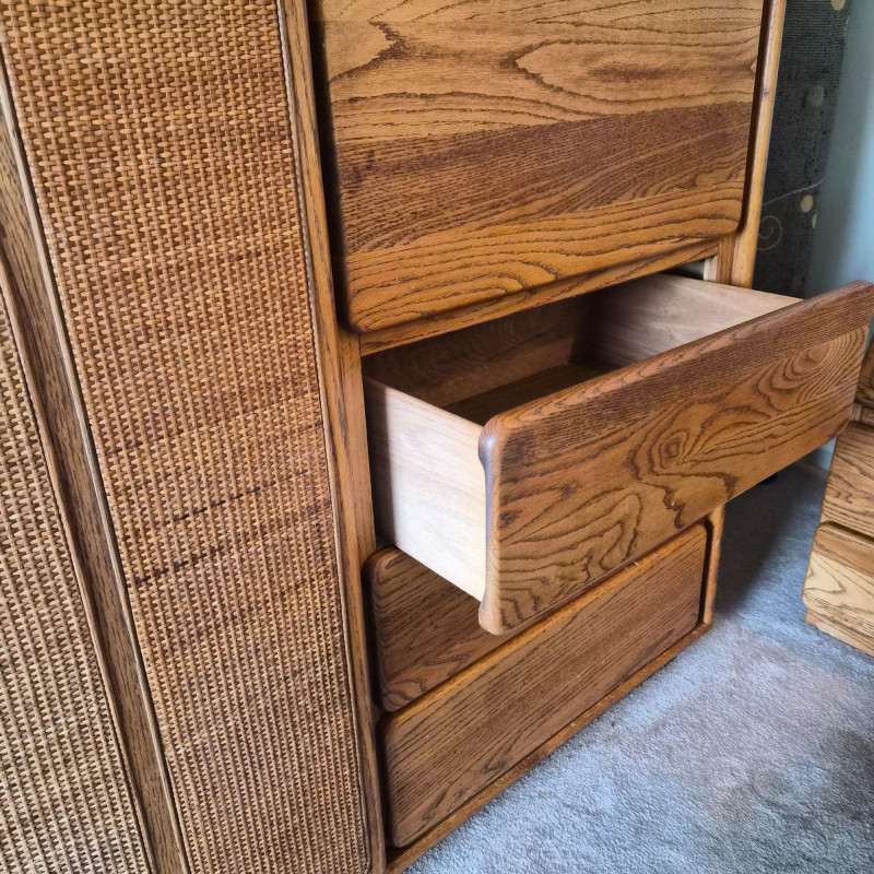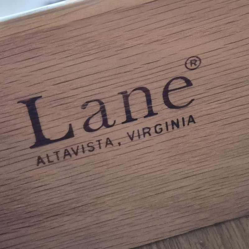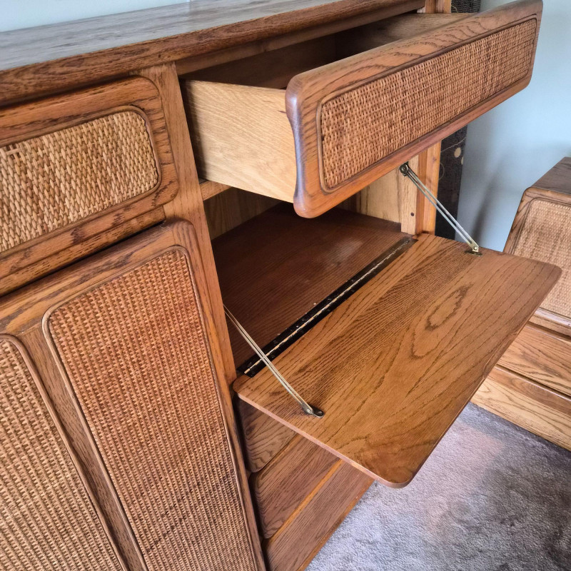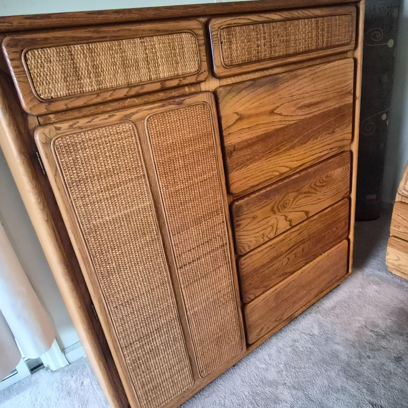 A standout Lane Furniture highboy dresser from the 1980s post‑modern era, celebrated for its mix of warm, natural textures and clean architectural lines. This model showcases solid oak construction paired with woven cane fronts, a signature combination from Lane’s late‑20th‑century design language. The upper section features two cane‑front drawers above a pull‑down door that opens into a compact writing desk — a clever multifunctional detail popular in 1980s bedroom and office‑hybrid furniture. On the left, a tall cabinet door opens to reveal three interior shelves, ideal for folded clothing or accessories. The right side includes three drawers - smooth wood fronts and visible grain. Due to the size and weight of this item, placing a bid confirms your agreement to arrive with two or more able-bodied helpers, an appropriately sized vehicle (please review measurements), and any necessary moving equipment such as a dolly or hand truck. Failure to arrive prepared may result in forfeiture of the item without refund. Please note: there will be no staff on-site to assist with moving or loading.