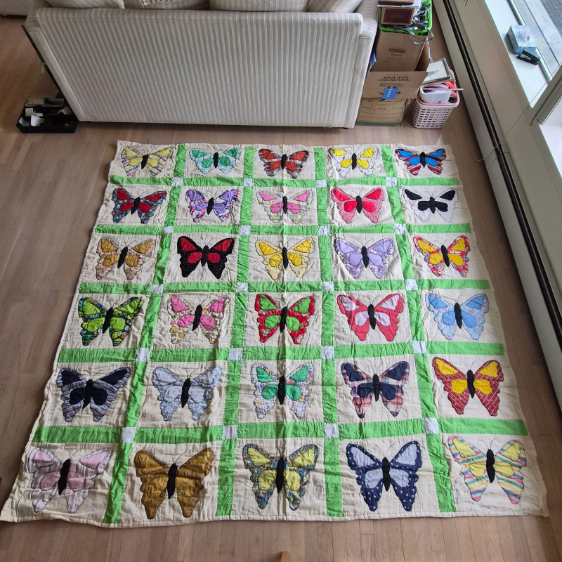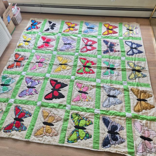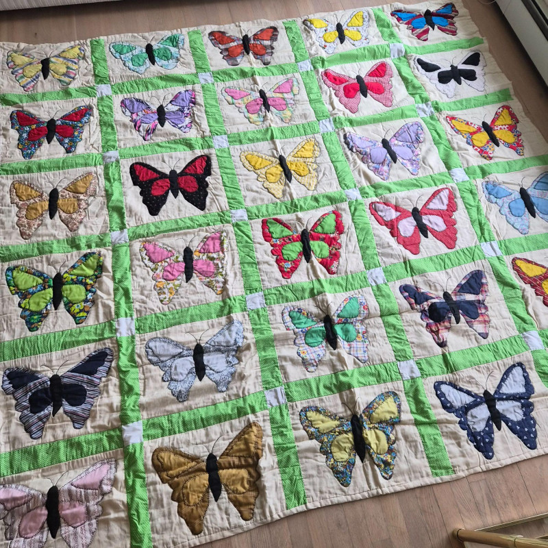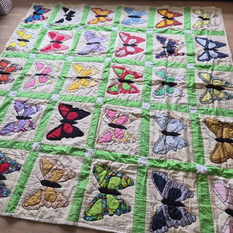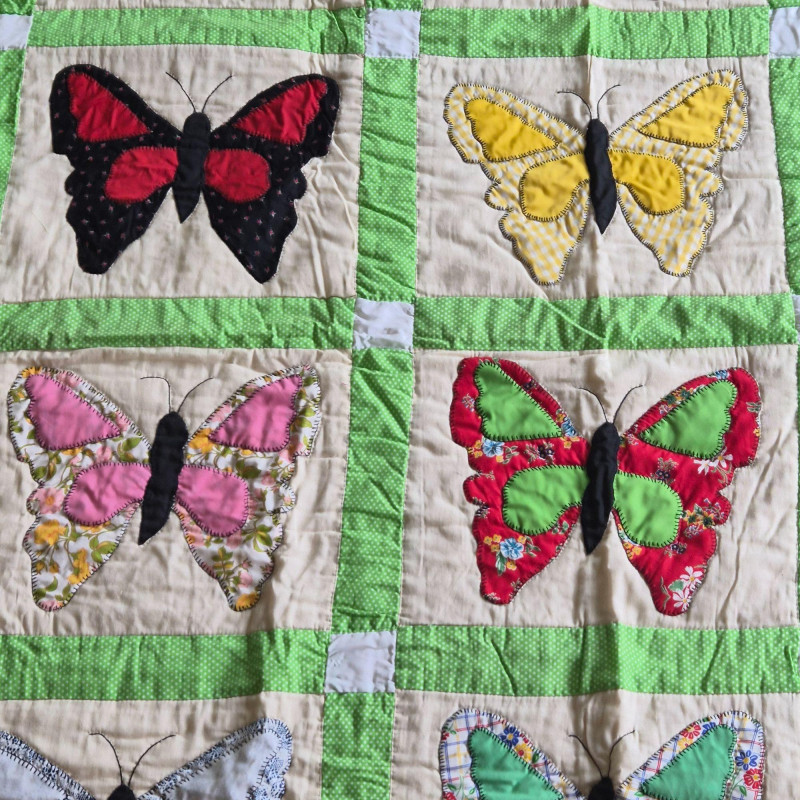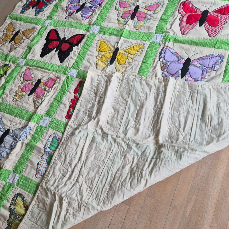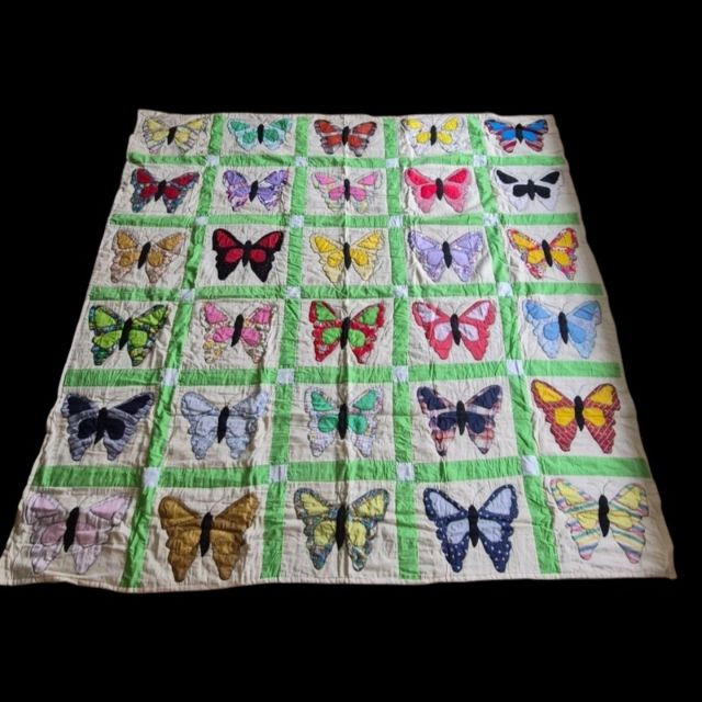 A charming vintage handmade butterfly quilt measuring 87" x 90", crafted in a classic 5×5 block layout featuring 25-block design, unique butterflies. Each butterfly is created from a different mix of colorful vintage fabrics, giving the quilt a lively, one‑of‑a‑kind character. The butterflies are set against soft cream blocks and framed with green sashing, creating a fresh, garden‑inspired palette. The quilt is backed in a solid cream fabric, keeping the look clean, traditional, and easy to style. Generously sized for a full or queen‑size bed, or perfect as a statement textile for display, photography staging, or cottage‑style décor.