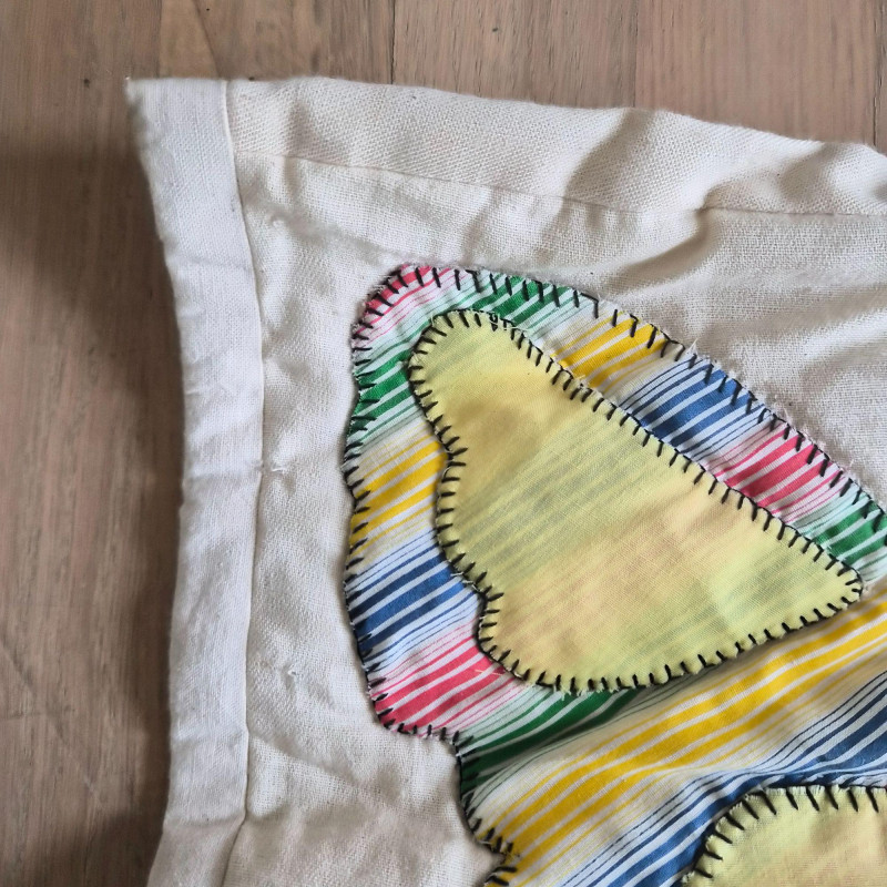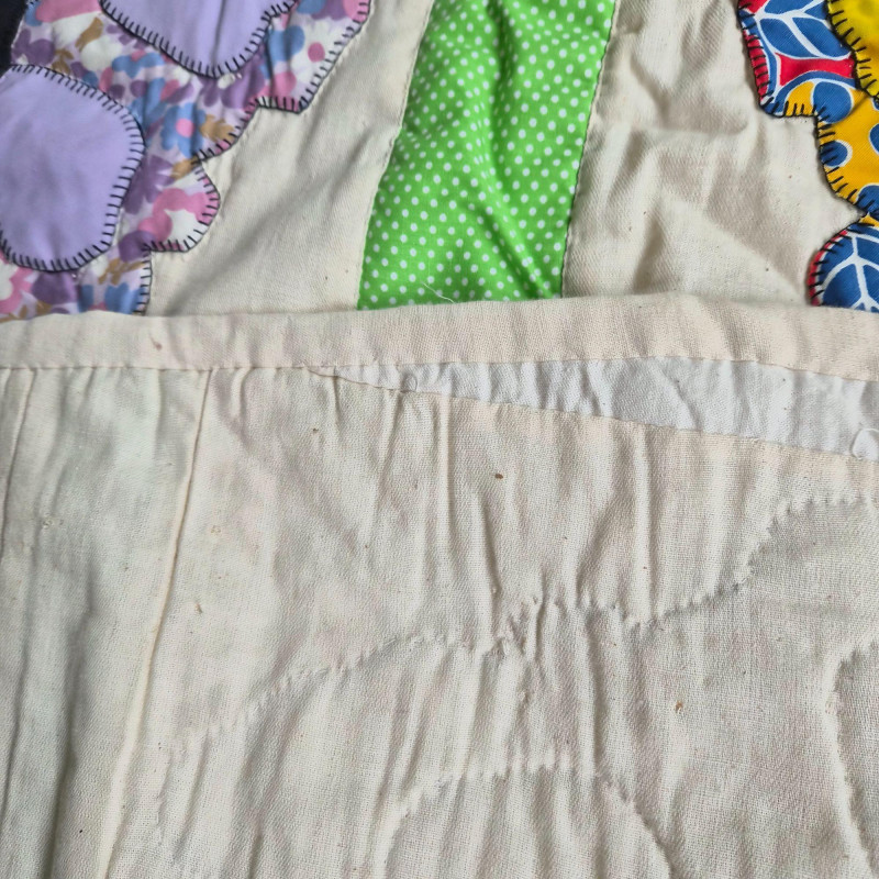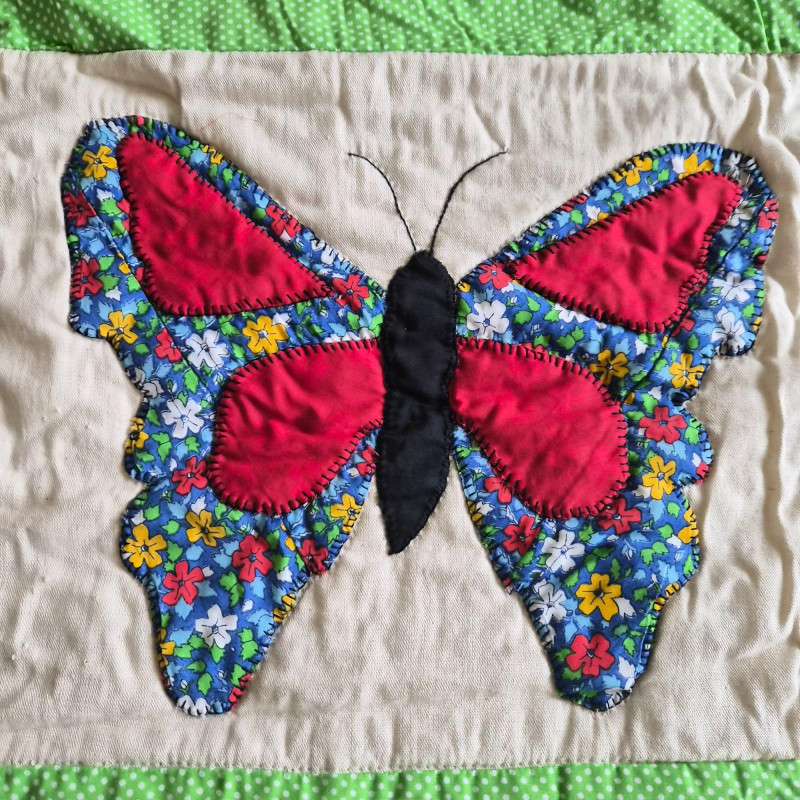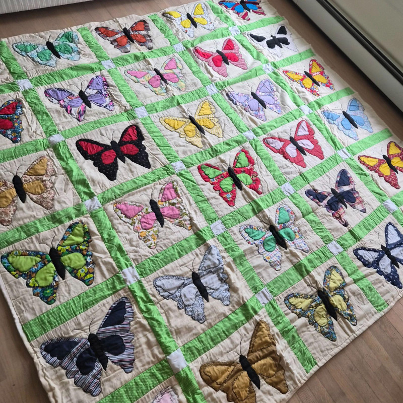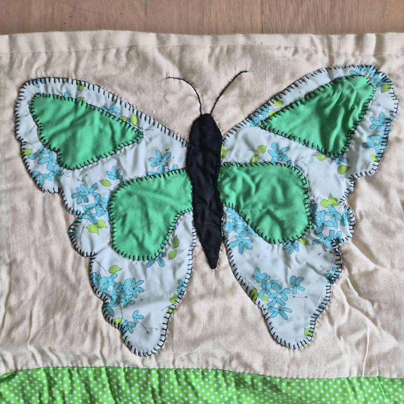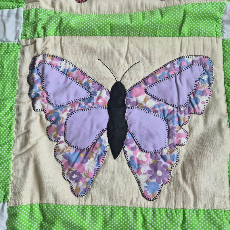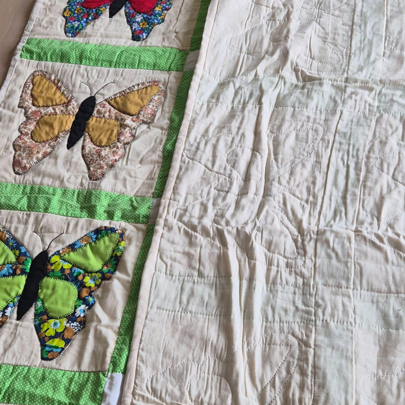 A charming vintage handmade butterfly quilt measuring 87" x 90", crafted in a classic 5×5 block layout featuring 25-block design, unique butterflies. Each butterfly is created from a different mix of colorful vintage fabrics, giving the quilt a lively, one‑of‑a‑kind character. The butterflies are set against soft cream blocks and framed with green sashing, creating a fresh, garden‑inspired palette. The quilt is backed in a solid cream fabric, keeping the look clean, traditional, and easy to style. Generously sized for a full or queen‑size bed, or perfect as a statement textile for display, photography staging, or cottage‑style décor.