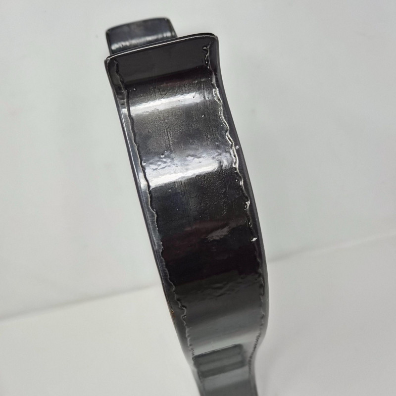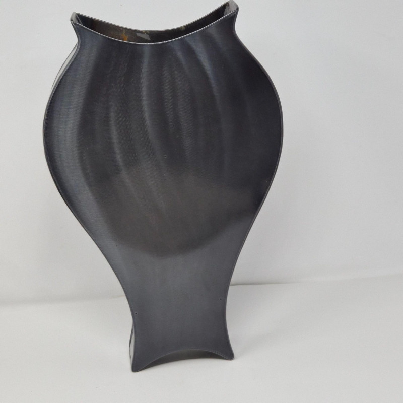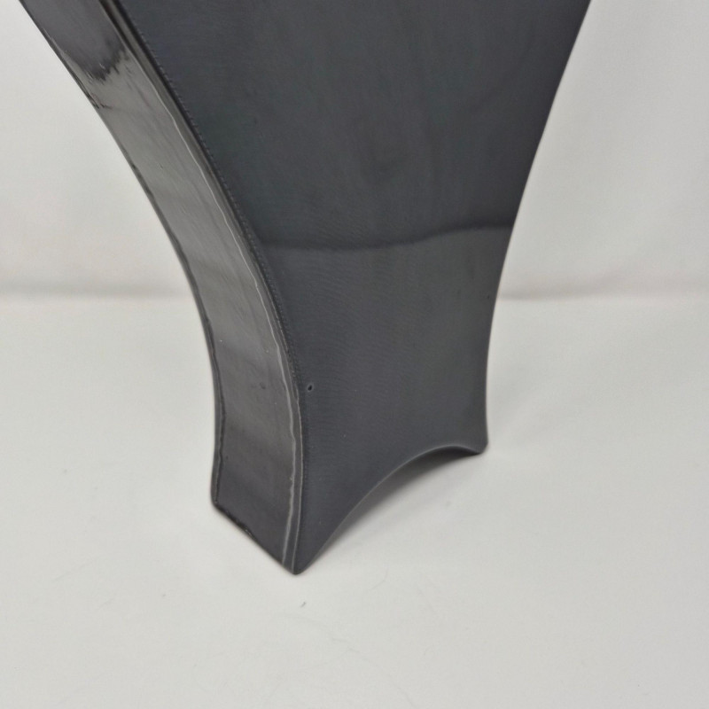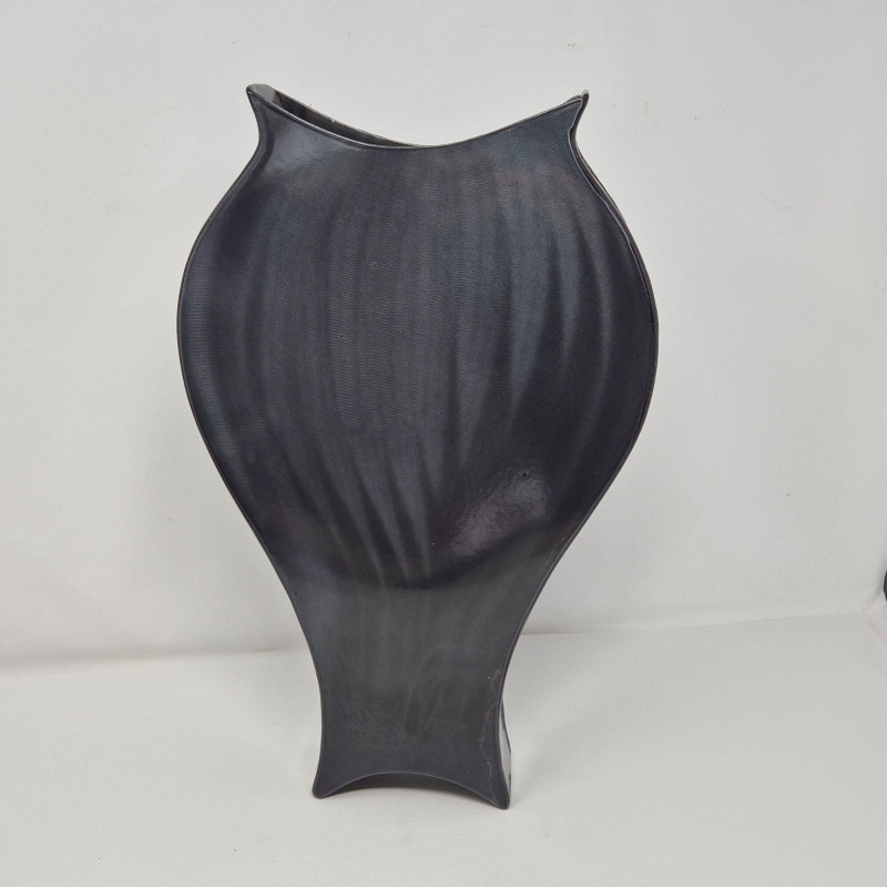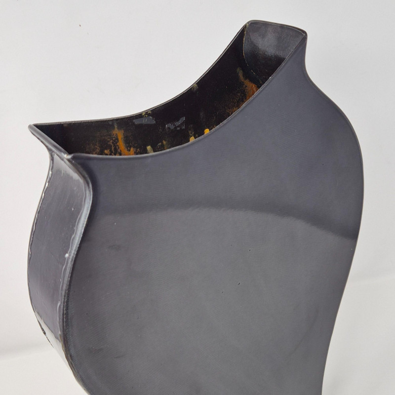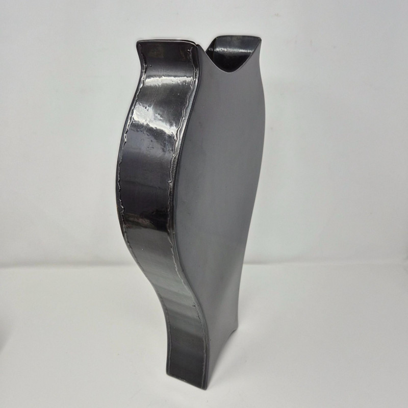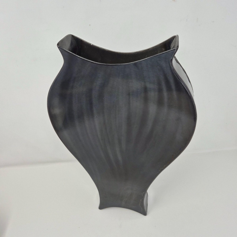 A striking studio‑crafted welded copper metal vase with a bold Deco‑inspired tulip silhouette. The form features sweeping organic curves, twin upward points, and a sculptural presence that blends Art Deco geometry with late‑20th‑century modern minimalism. The exterior is finished in a black lacquered coating, welded seams, and gentle vertical ridged lines that glow when light hits the surface at an angle. This interplay of shadow and sheen is characteristic of artisan metalwork from the 1970s–1980s, when sculptural copper décor saw a resurgence. Measures approximately 15" tall × 9.25" at its widest. A dramatic standalone accent for collectors of modern metalwork, Deco revival pieces, or organic sculptural décor.