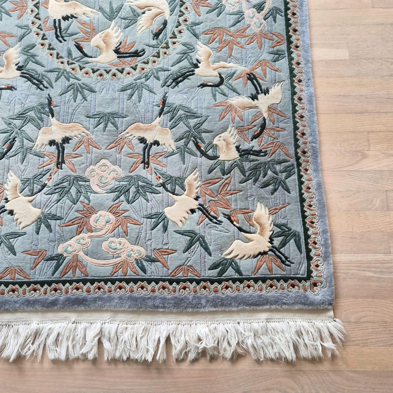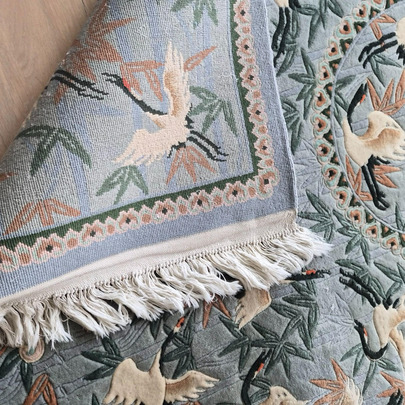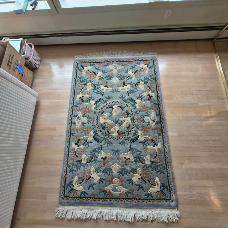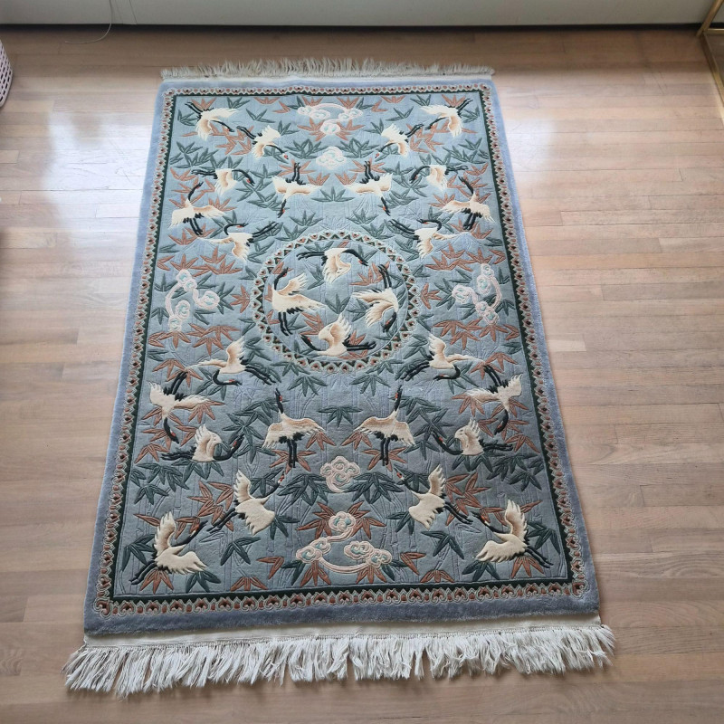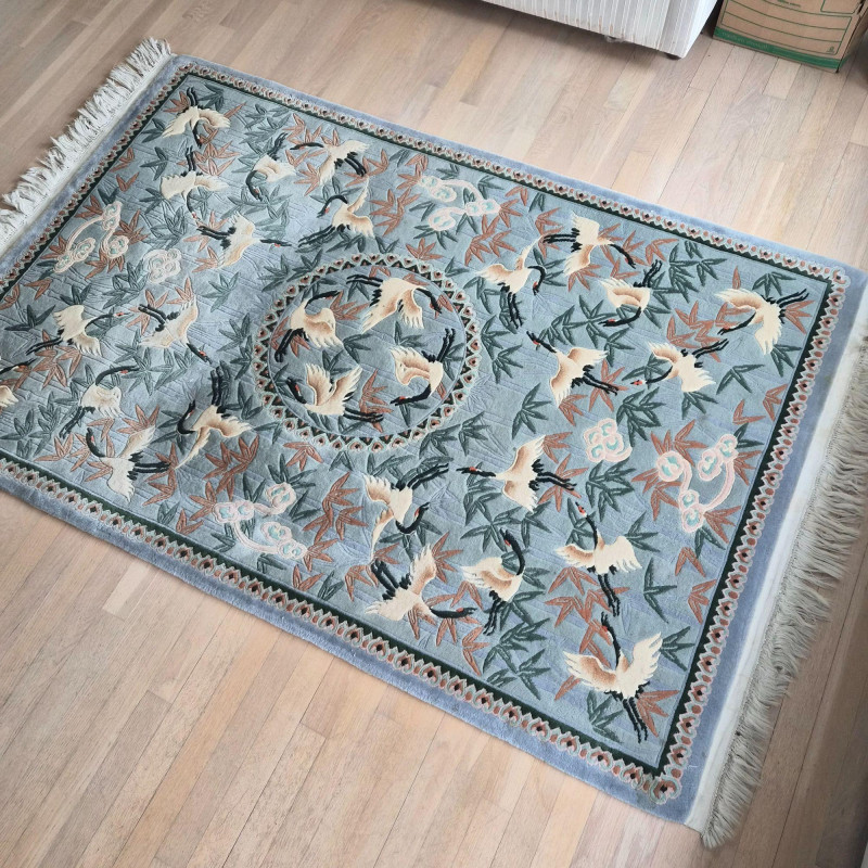 A beautifully woven wool rug featuring a serene blue field accented with stylized crane birds in soft earthtones. The traditional motif is framed by a geometric border and finished with classic white fringe on both ends. Measuring 48" × 80", it’s a versatile size ideal for an entryway, reading nook, or layered décor arrangement. The rug shows light wear consistent with age and a pet coming from a pet friendly home, and cleaning is recommended to refresh the fibers and enhance the colors.