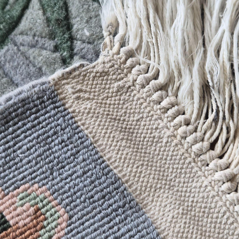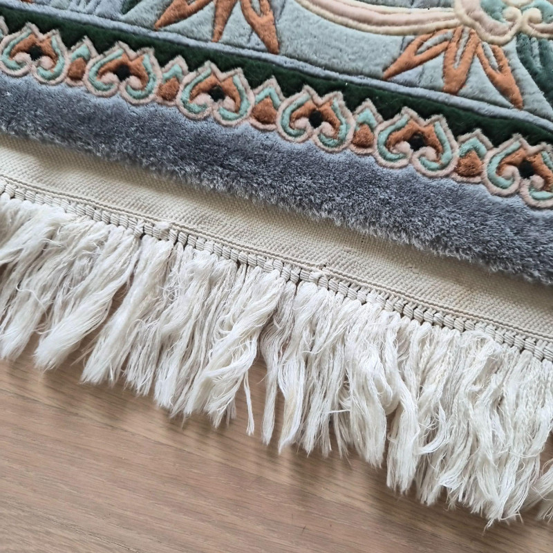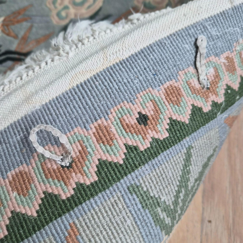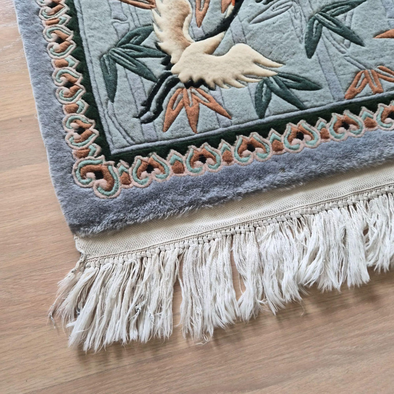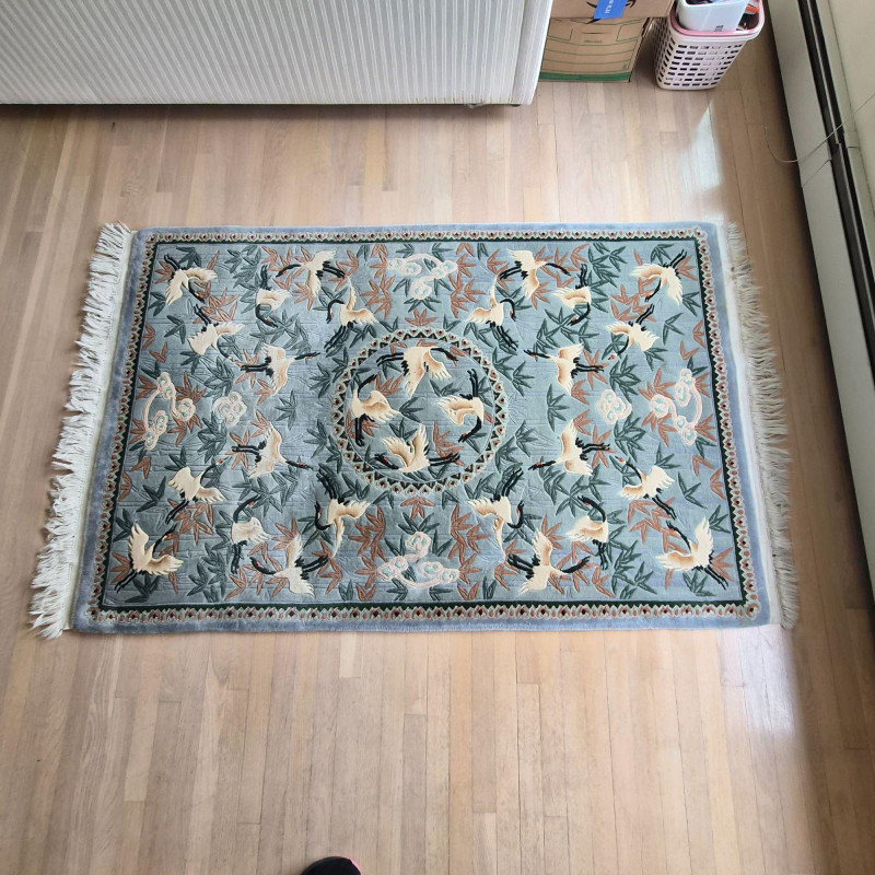 A beautifully woven wool rug featuring a serene blue field accented with stylized crane birds in soft earthtones. The traditional motif is framed by a geometric border and finished with classic white fringe on both ends. Measuring 48" × 80", it’s a versatile size ideal for an entryway, reading nook, or layered décor arrangement. The rug shows light wear consistent with age and a pet coming from a pet friendly home, and cleaning is recommended to refresh the fibers and enhance the colors.