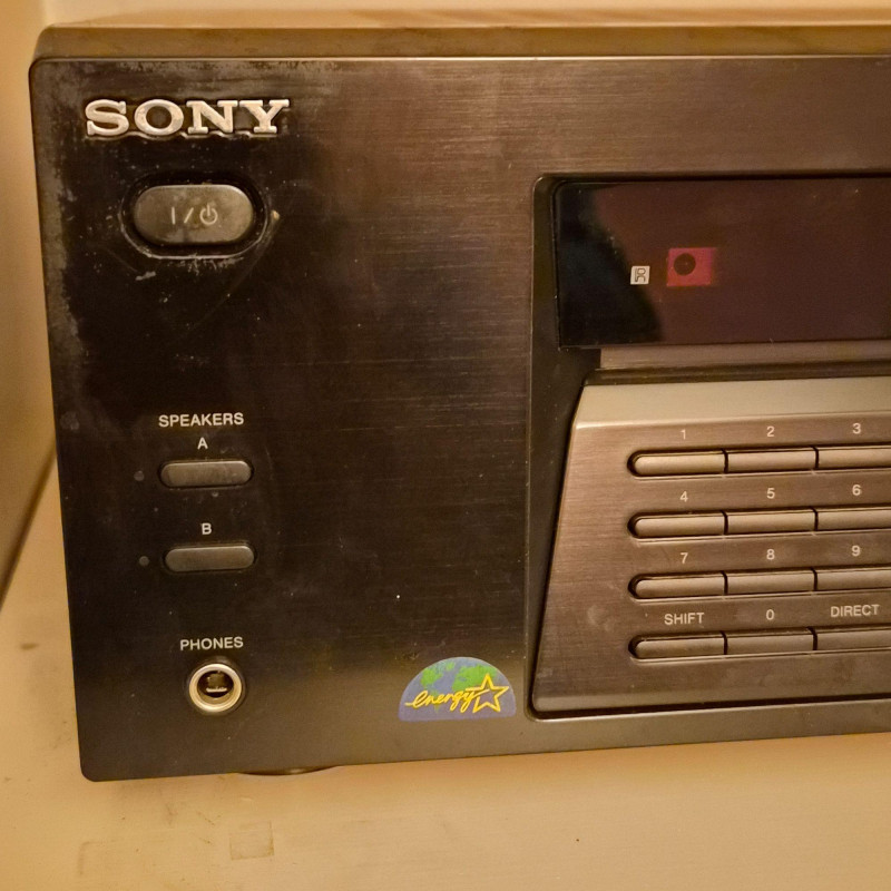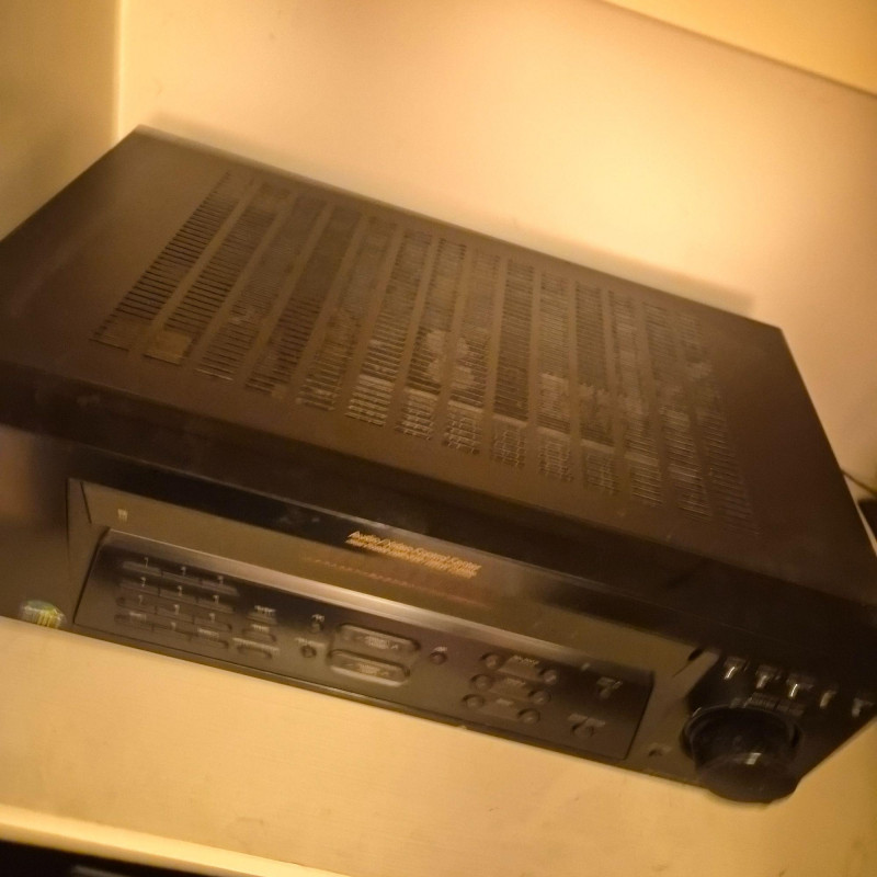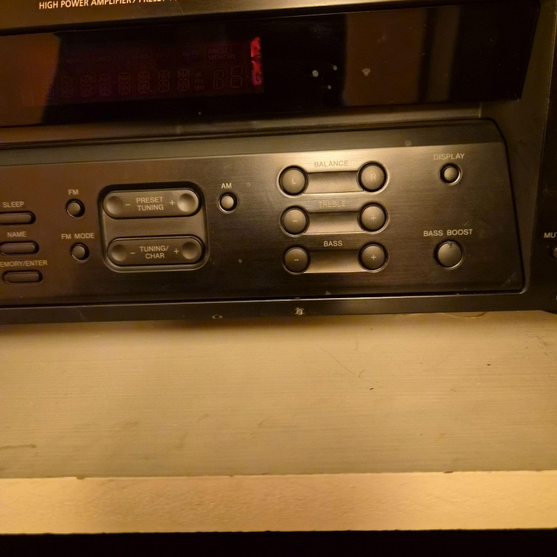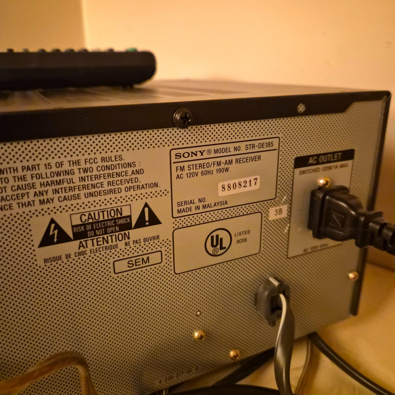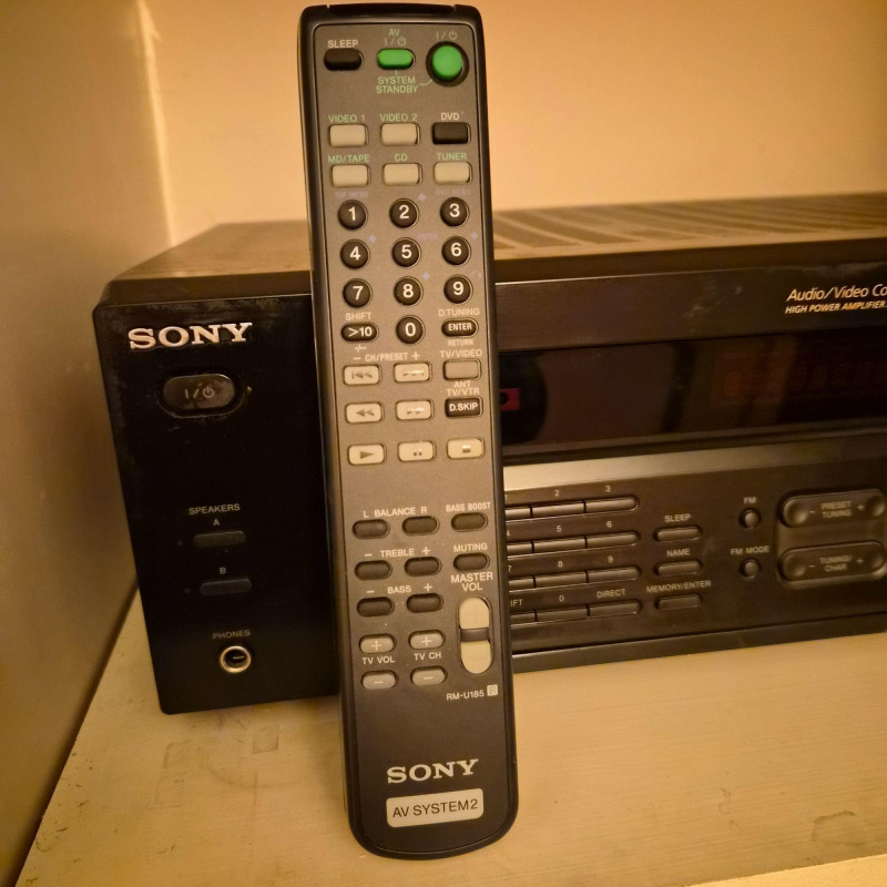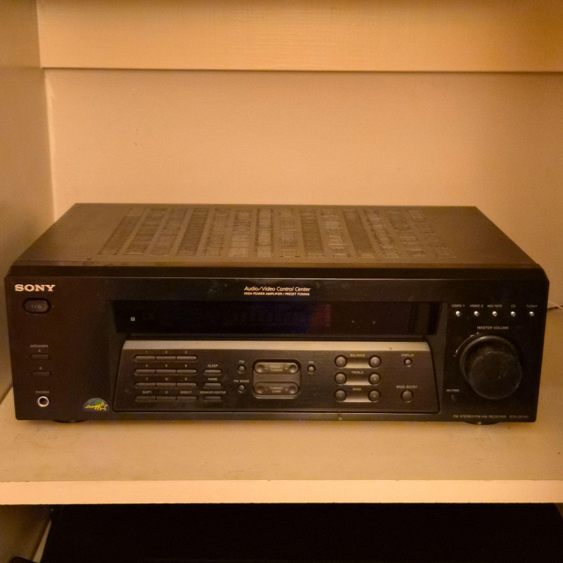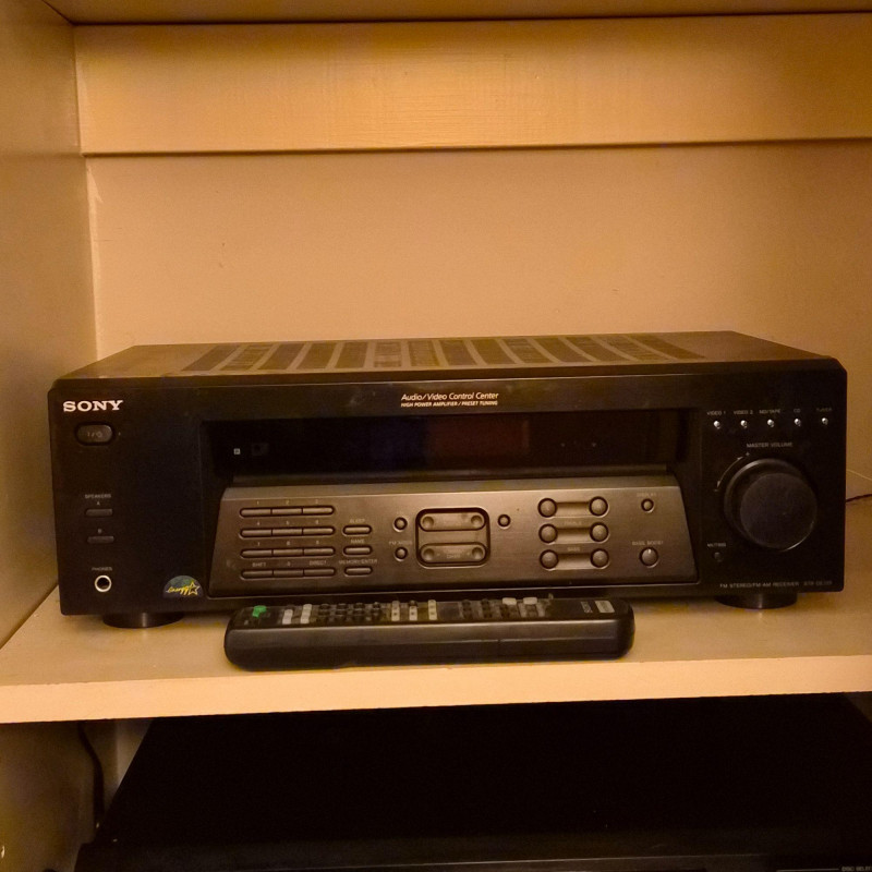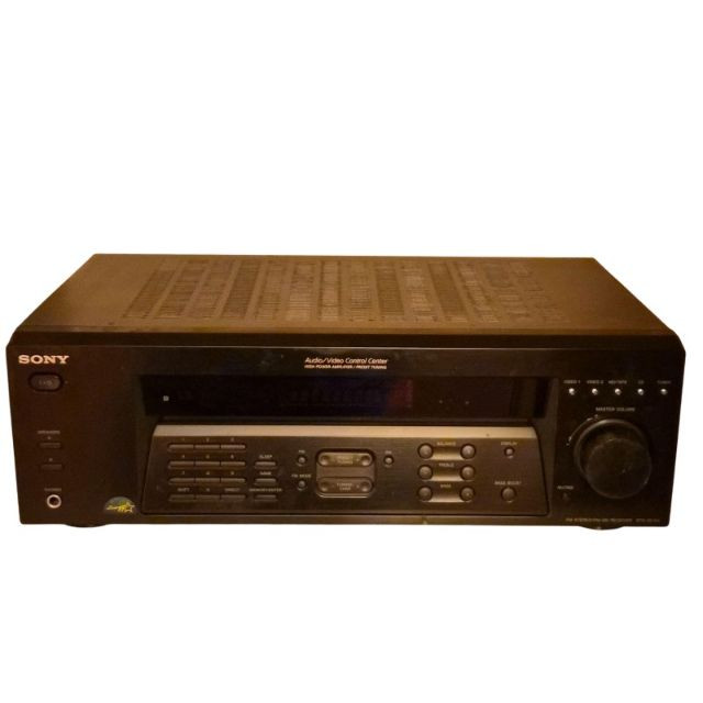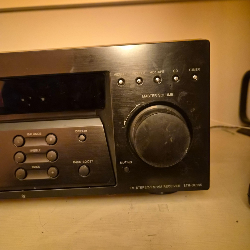 Sony STR‑DE185 audio/video receiver, a reliable component for home stereo or basic home‑theater setups. Features multiple audio inputs, AM/FM tuner, front‑panel controls, and a large master‑volume dial. Includes the original remote. Unit does power on and functions appear to all work. Shows normal age and use wear.